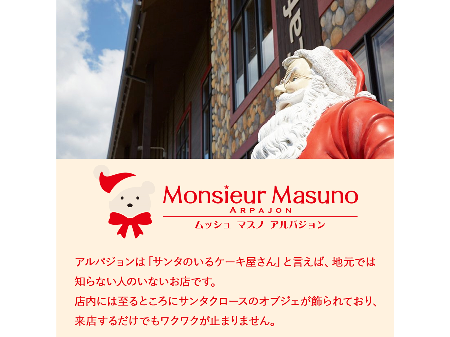 「サンタのいるケーキ屋さん」として有名で、一年中サンタに会える店構えが特徴。