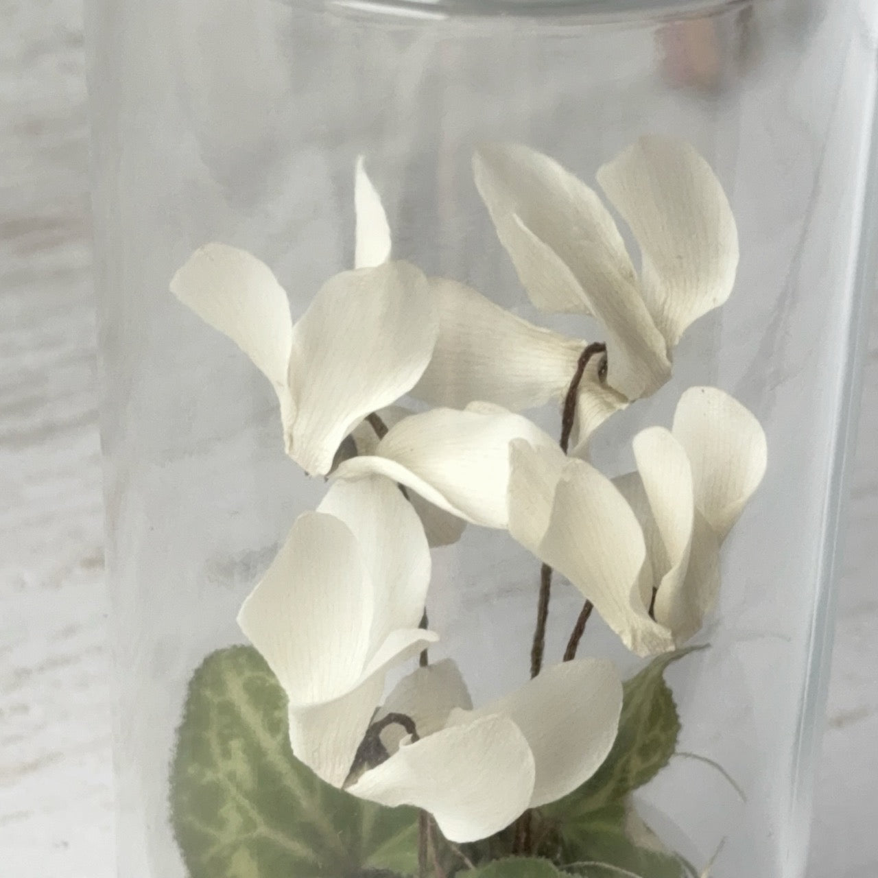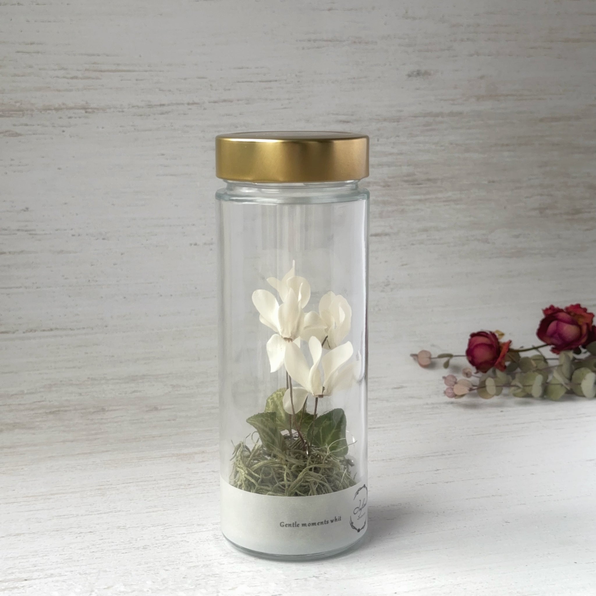特別な方法で乾燥させたシクラメンのドライフラワーをガラス瓶に閉じ込めました。