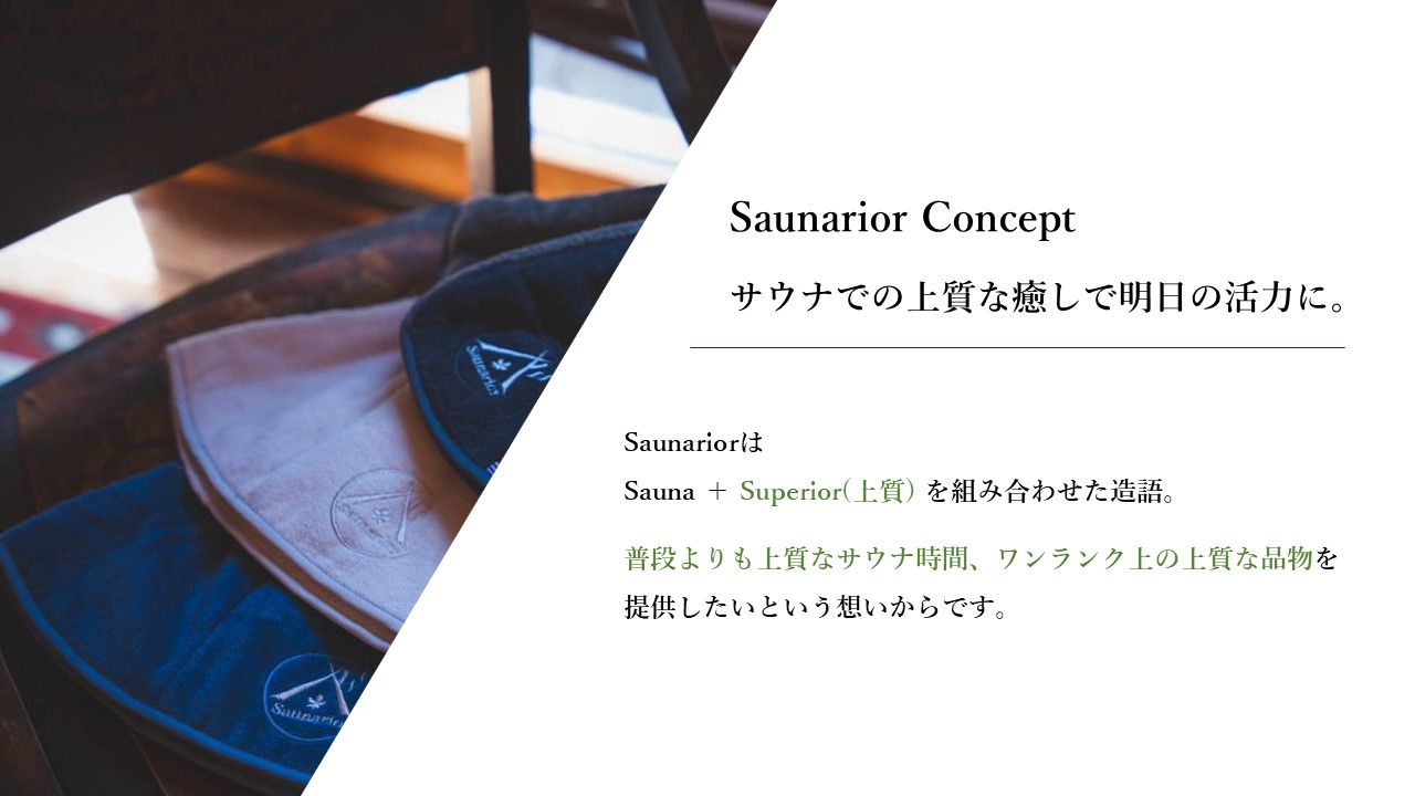 ーサウナでの上質な癒しで明日の活力にー Saunariorは、SaunaとSuperior(上質)を組み合わせた造語。 疲れた心と体に、いつもより上質なサウナ体験と、丁寧につくられた上質なアイテムを届けたい。 その想いから生まれたブランドです。