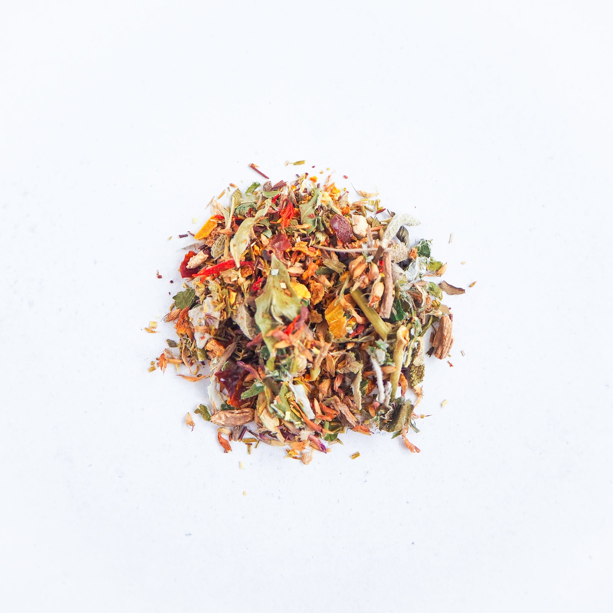 ほんのり甘い青草のようなレッドクローバーとラズベリーリーフに、スパイシーなアンジェリカルートと清涼感のあるセージを重ねた、心が和むブレンド。