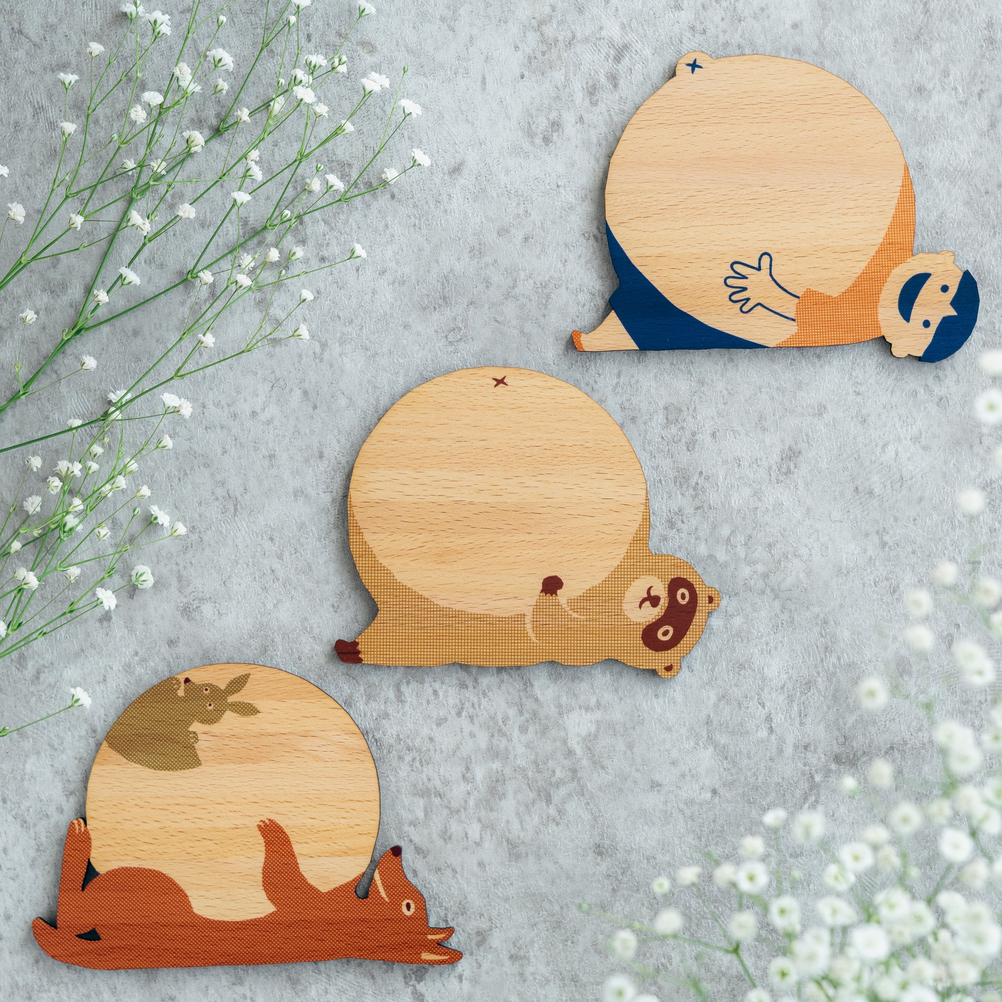 Ten&O Art+Craft ウッドプレートは再利用された端材から作られたコレクションです。可愛らしい動物を描いたデザインのプレートは、コースターやディスプレイプレート、小物置きなど、使い方は自由。天然木の端材を使用しているため、木目も一つひとつ異なります。