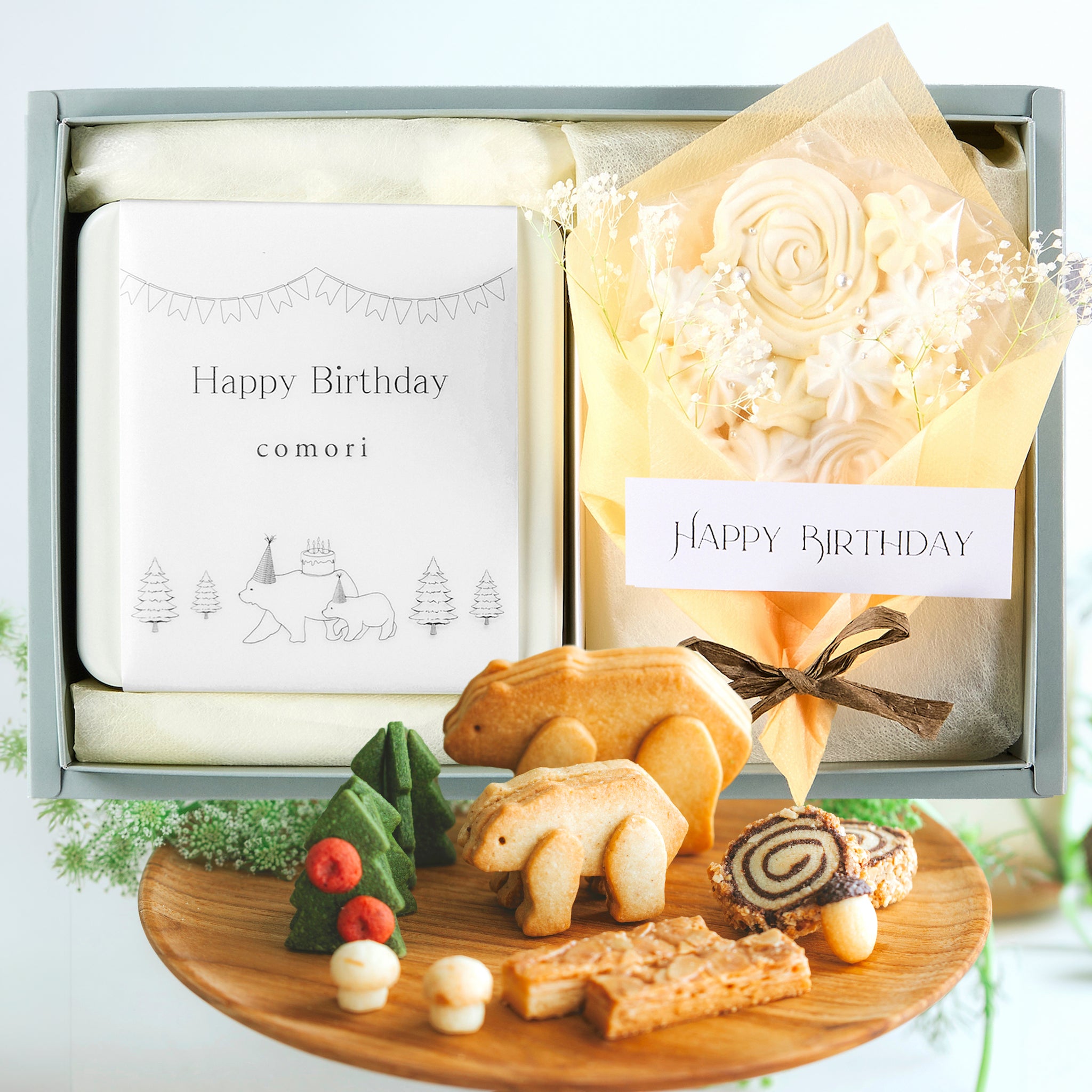 Happy Birthday - クッキー缶とメレンゲ花束のギフトボックス|comori(コモリ)