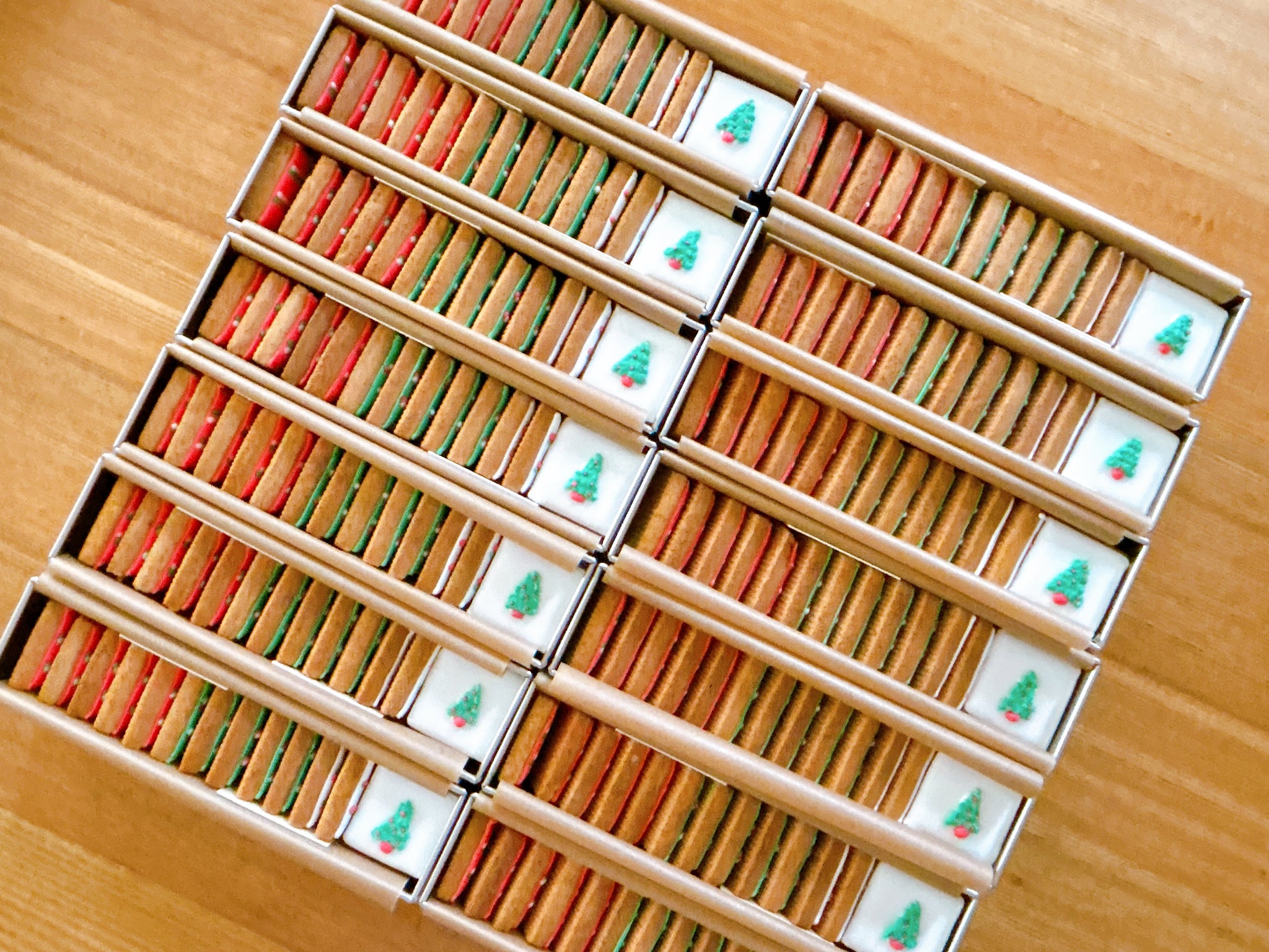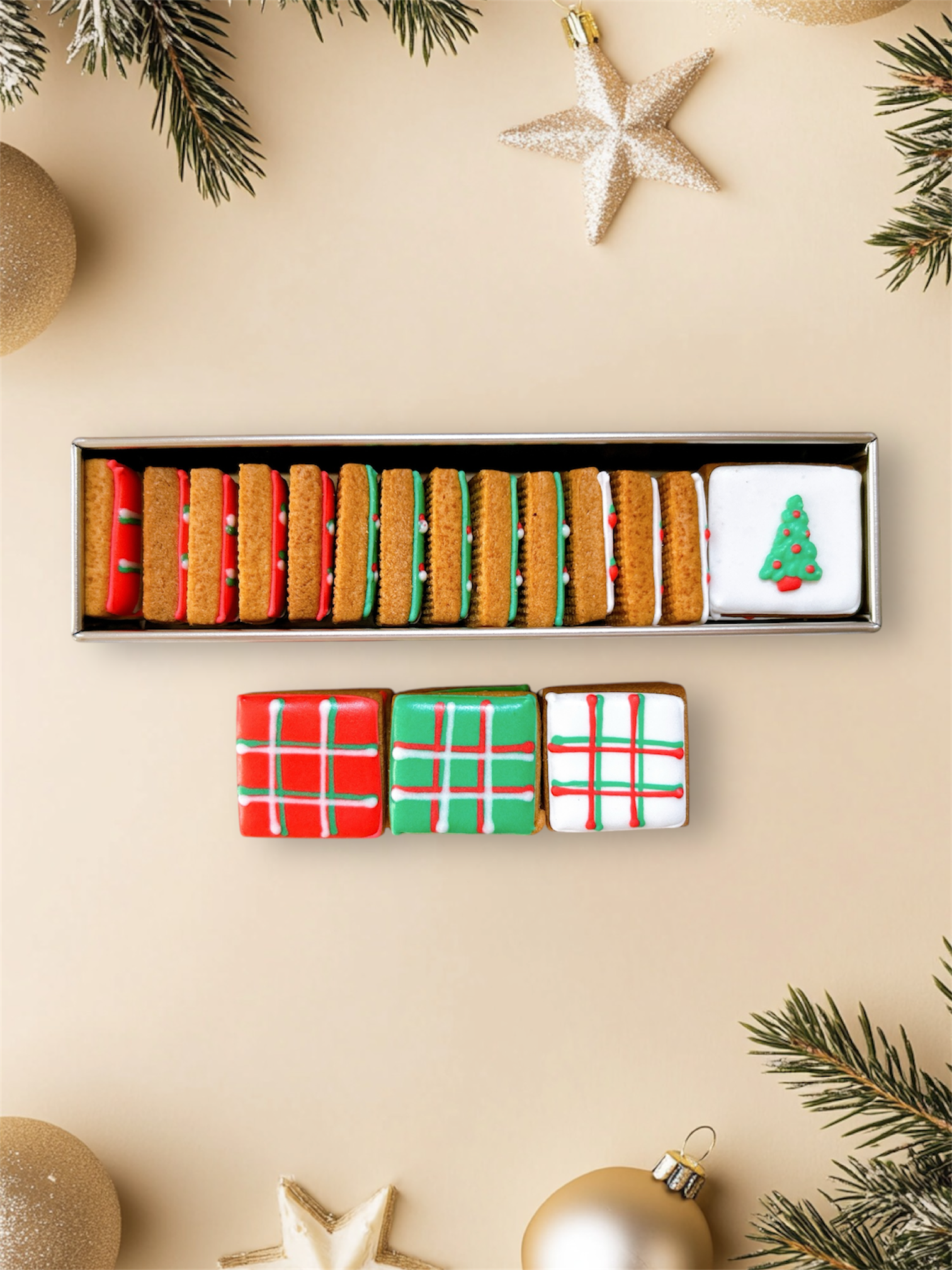 一口サイズのスクエアクッキーにクリスマス定番カラーを3色チェック柄にしたアイシングクッキーです