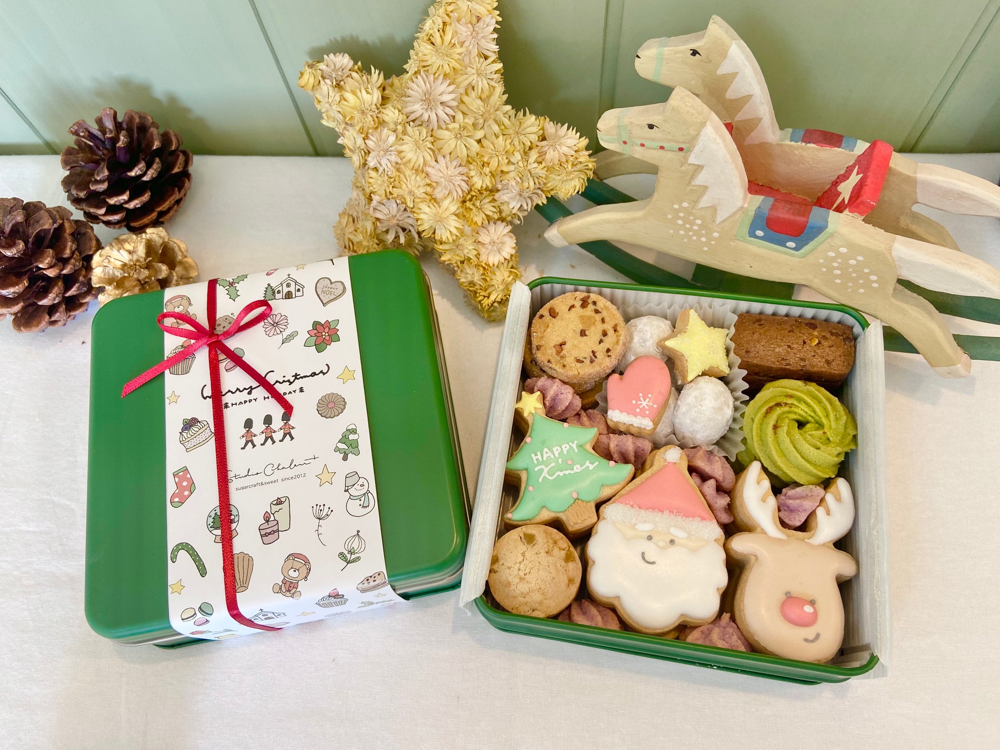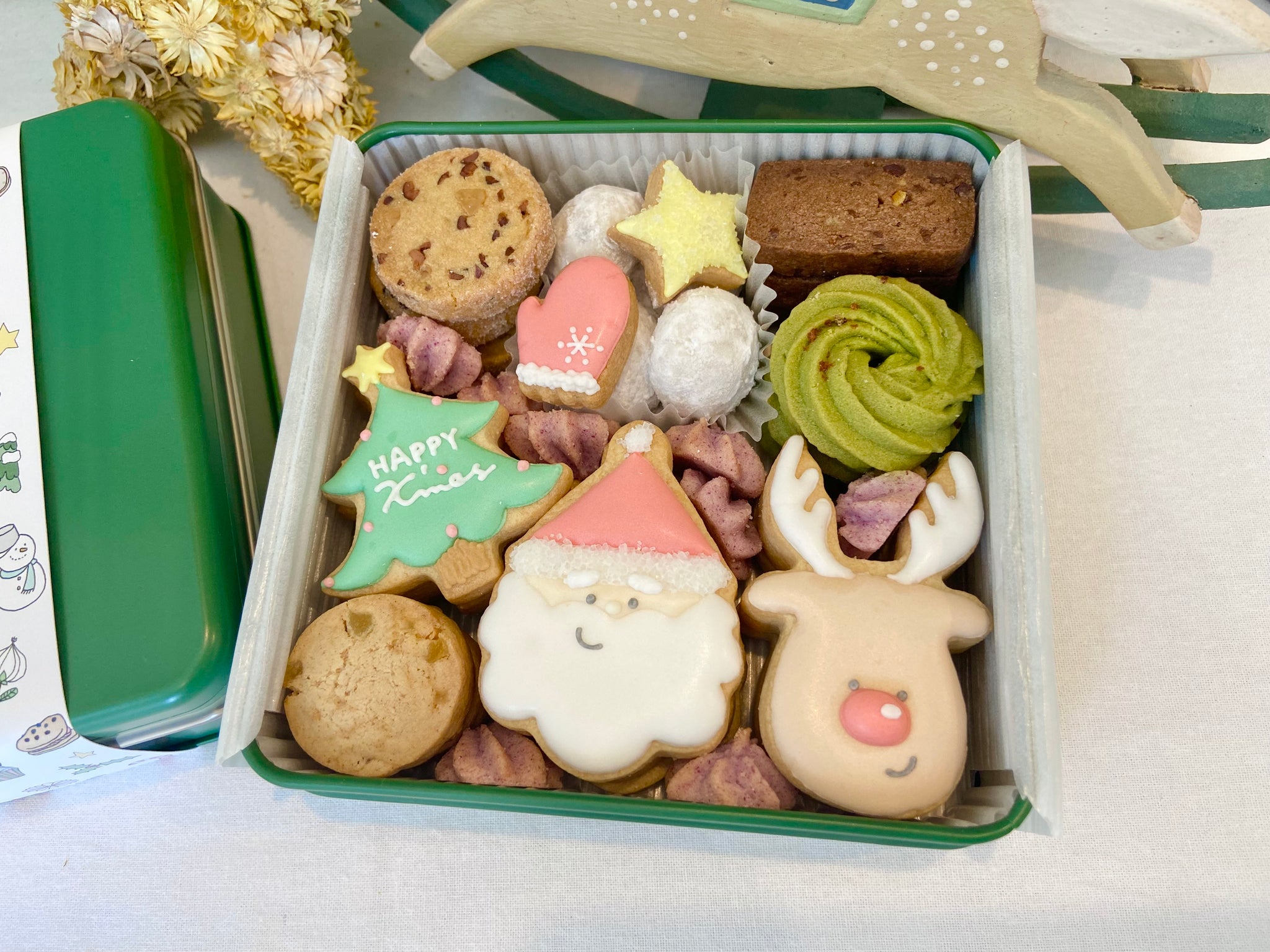 なかよしサンタとトナカイがとっても可愛い!冬らしいラムレーズンのクッキーなど9種類が入った、お手土産にも自分のご褒美にもピッタリなクッキー缶です!