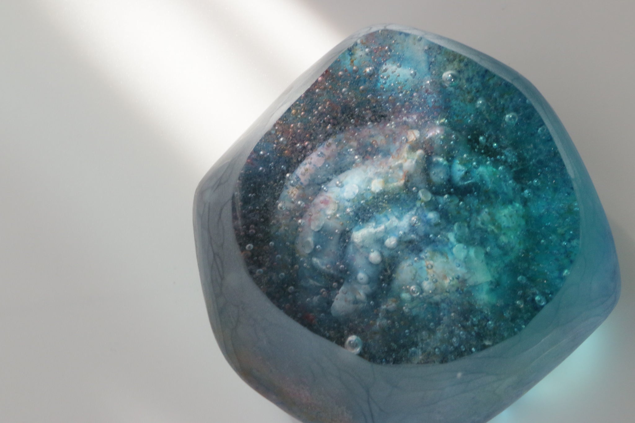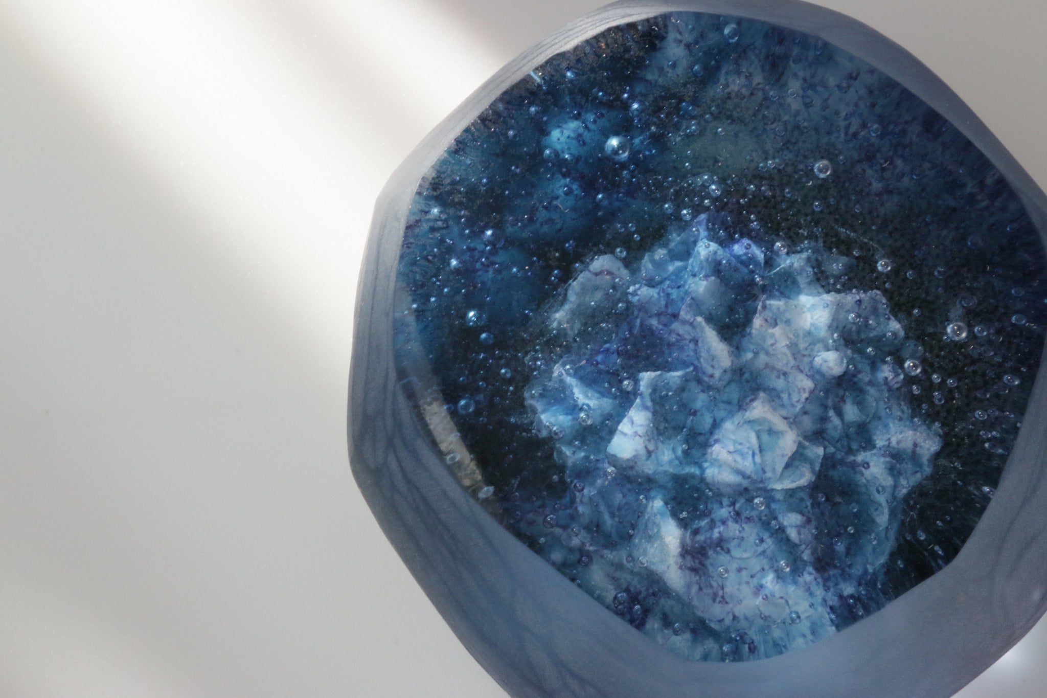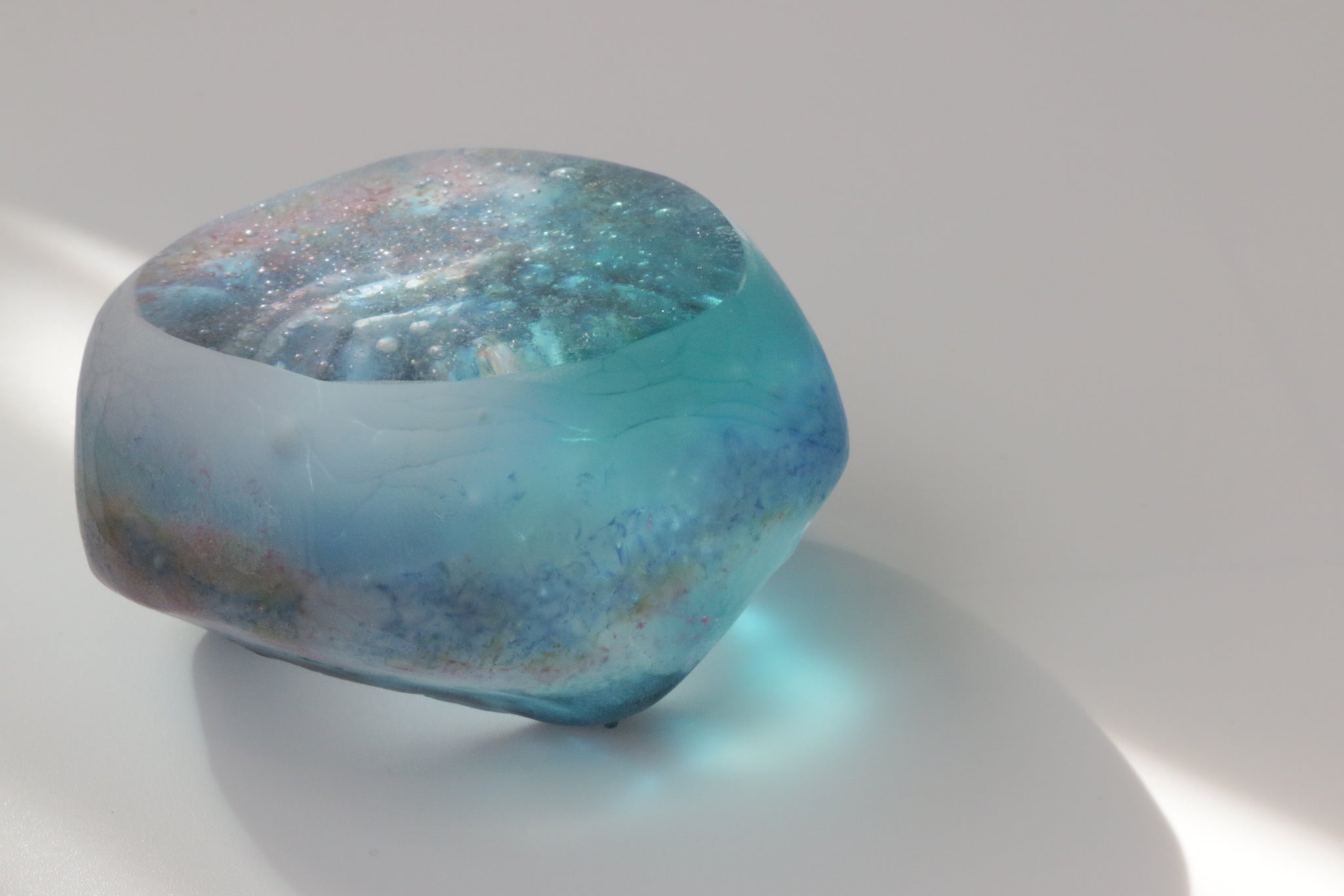 水のゆらめき、気泡、深み。吸い込まれるような奥行きに惹かれ、水の世界をイメージした作品をガラス鋳造技法で制作しています。