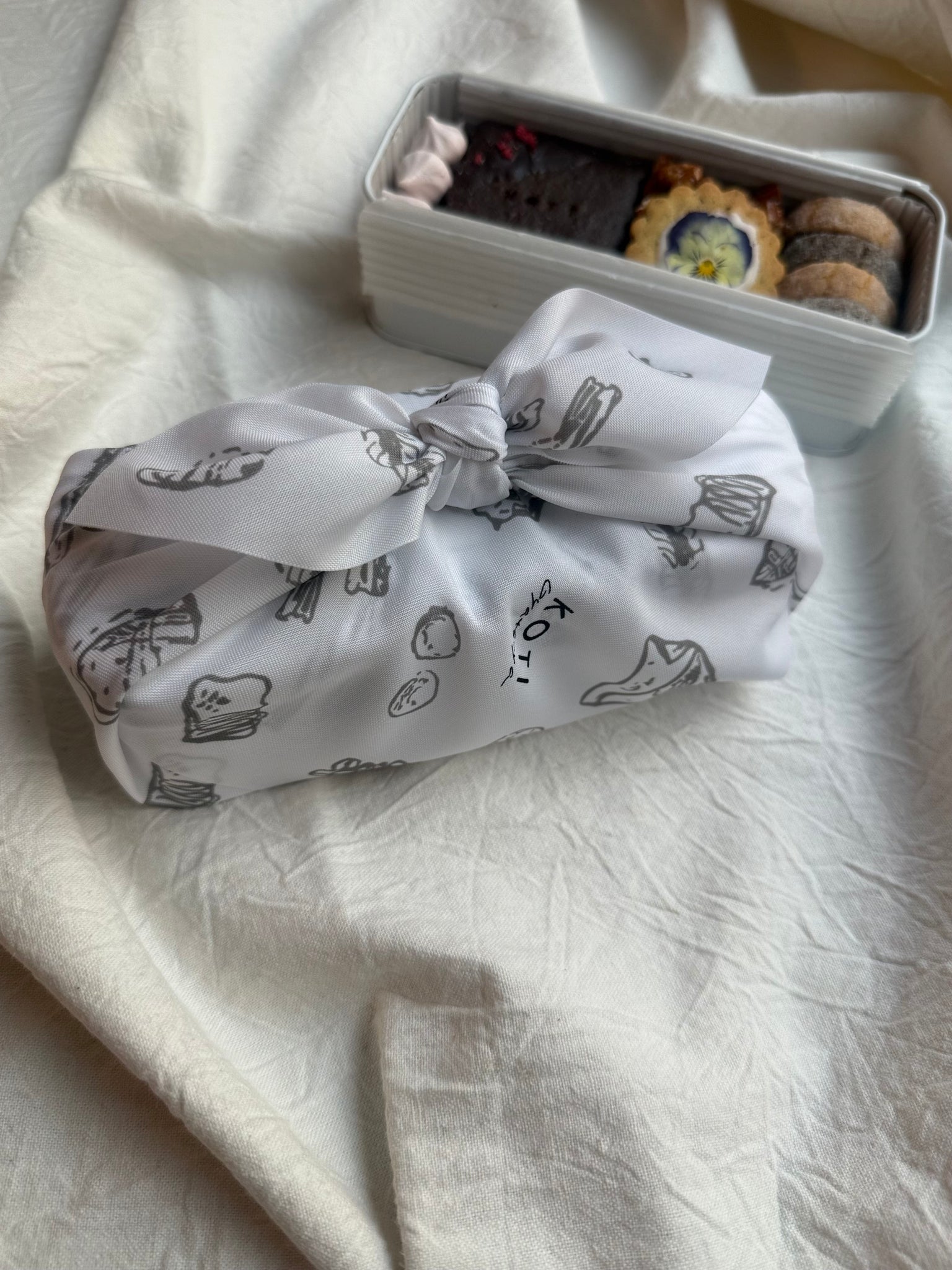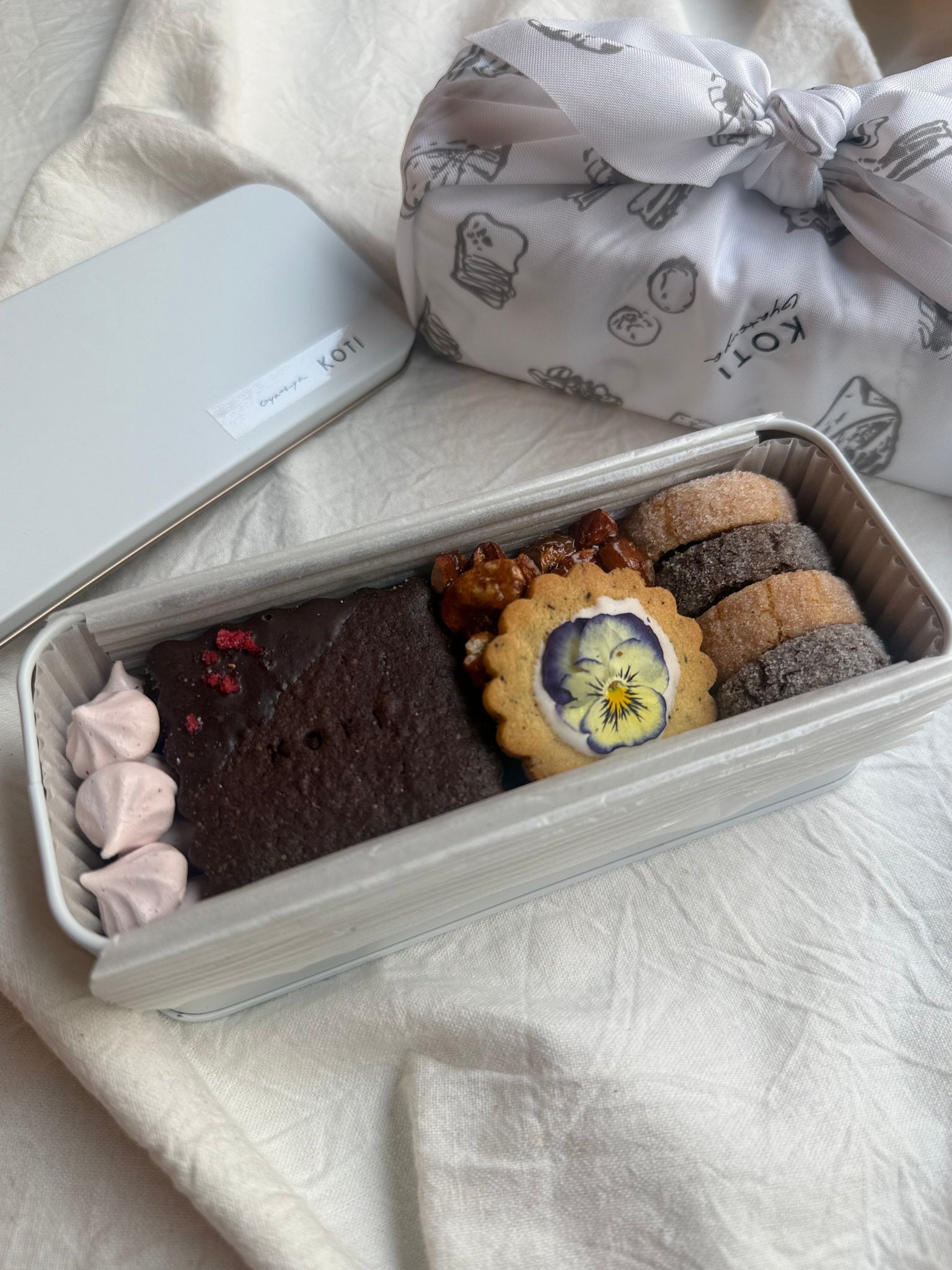 缶はKOTIオリジナルの布ラッピングで包んでお届け。