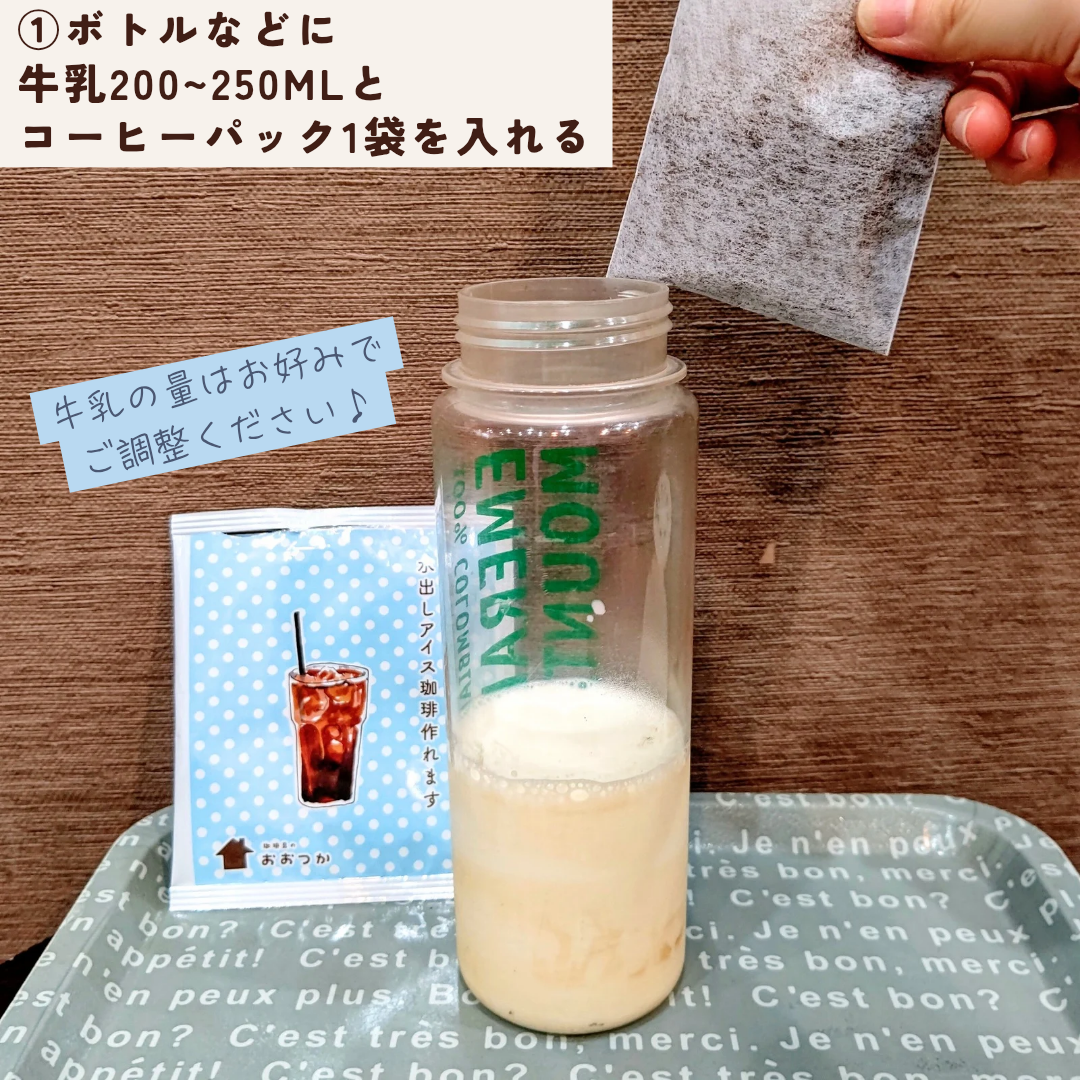 作り方はいたって簡単、パックを水に入れるだけでアイスコーヒーが牛乳に入れるとミルクブリューコーヒーが作れます。