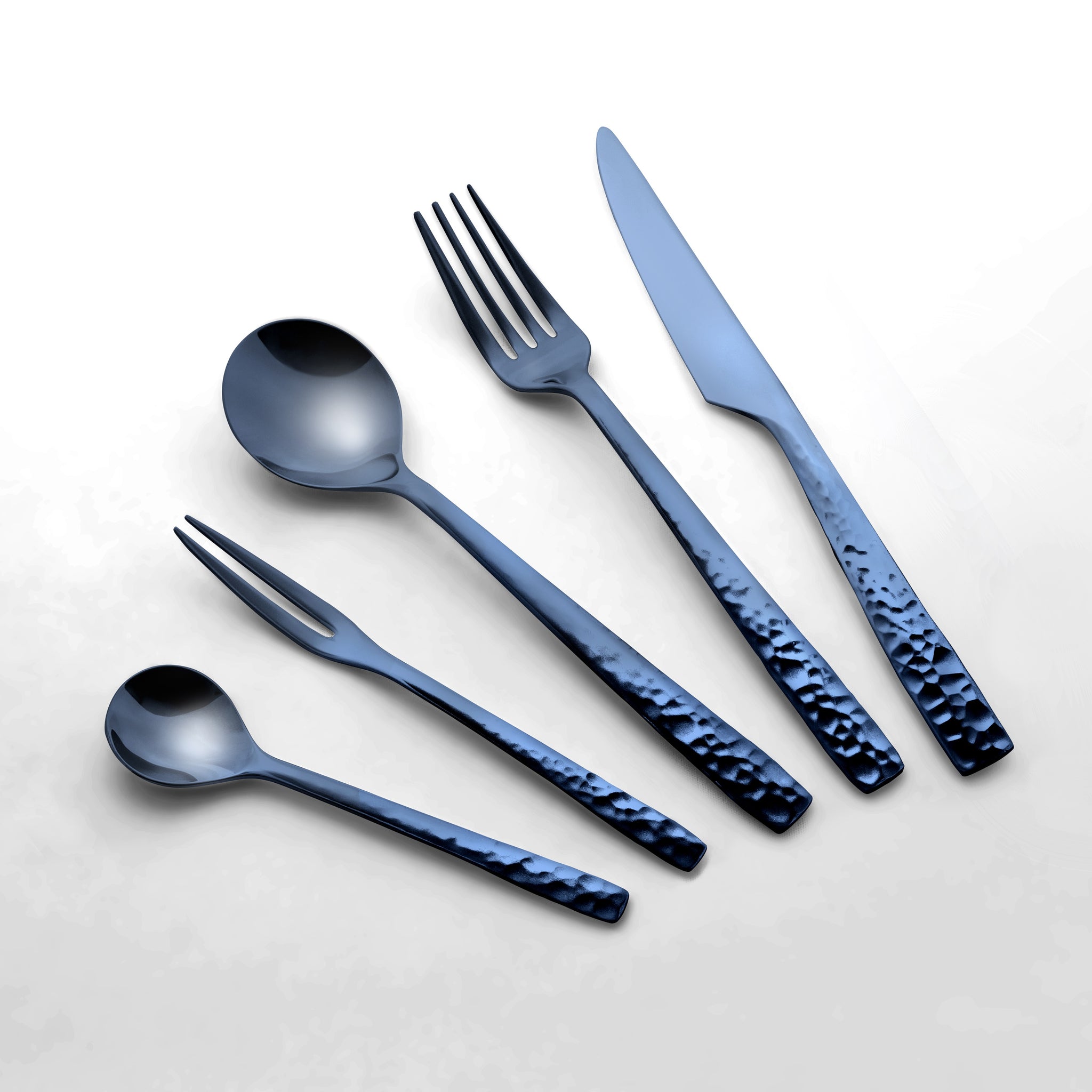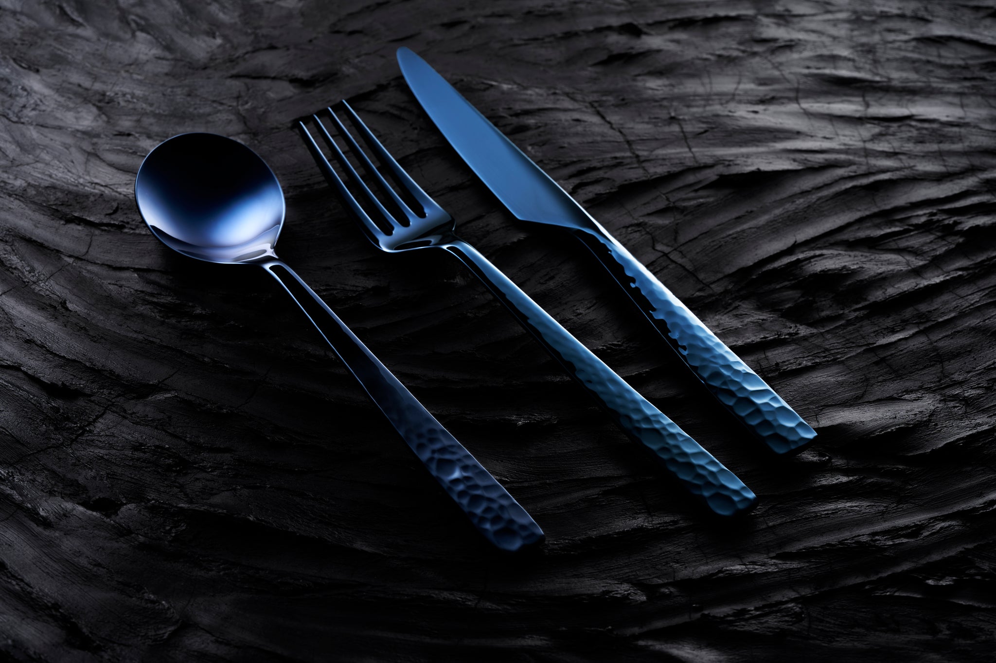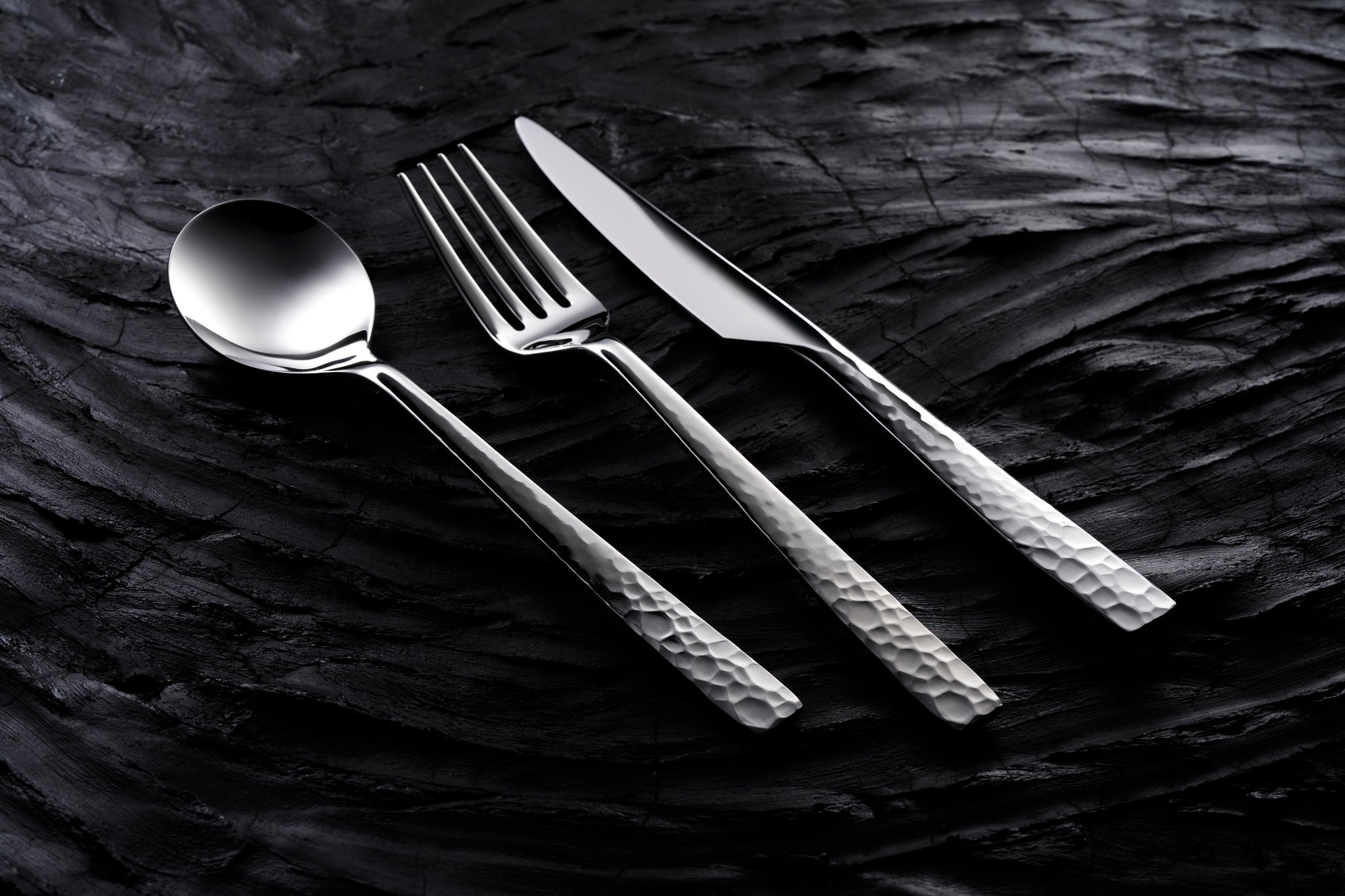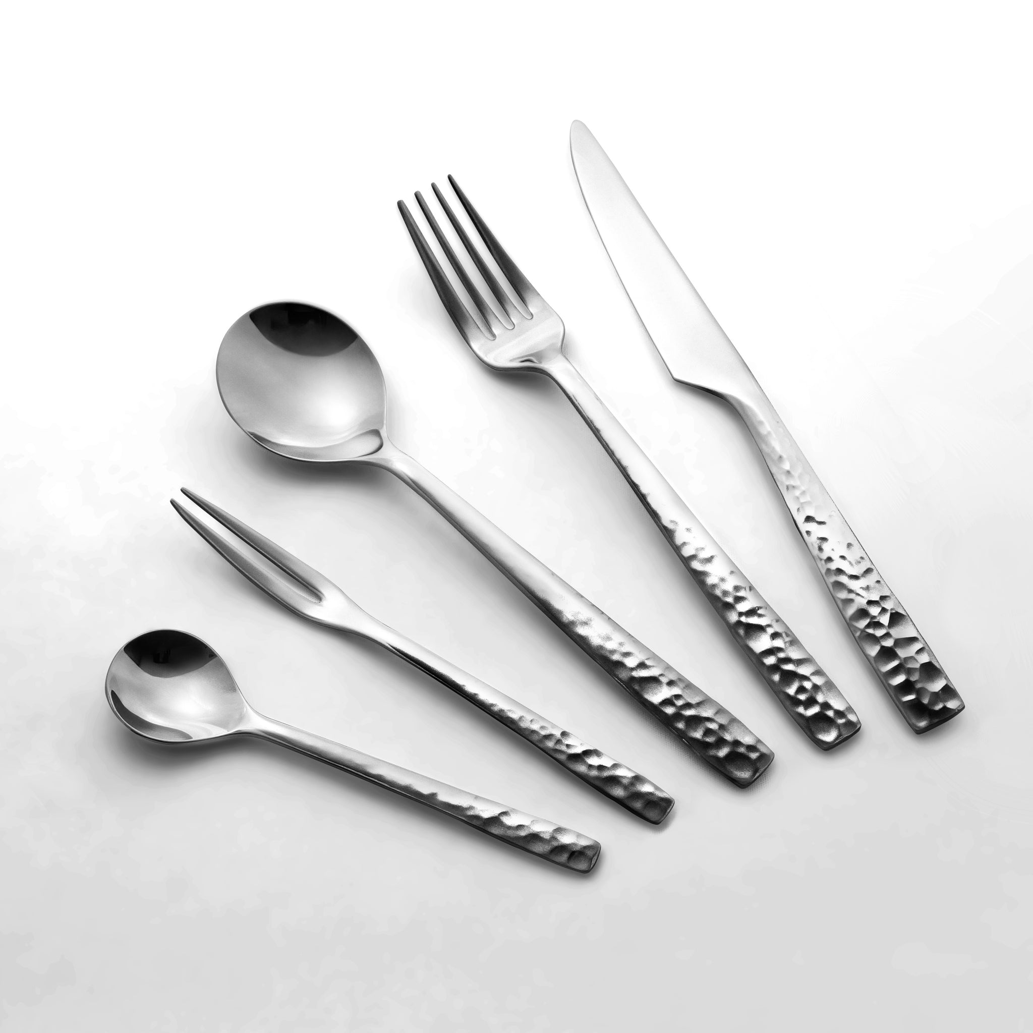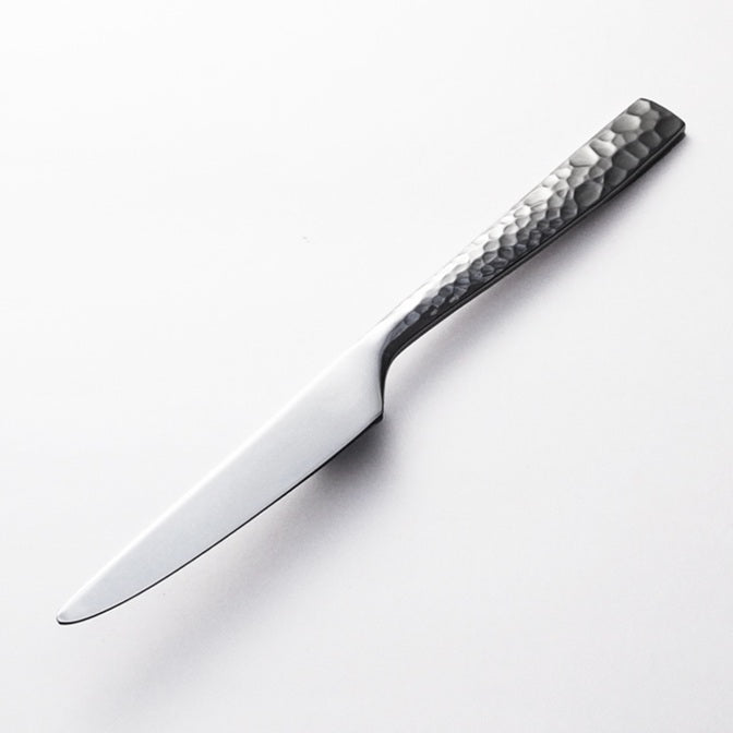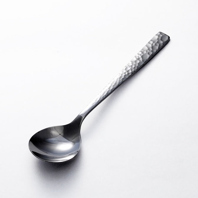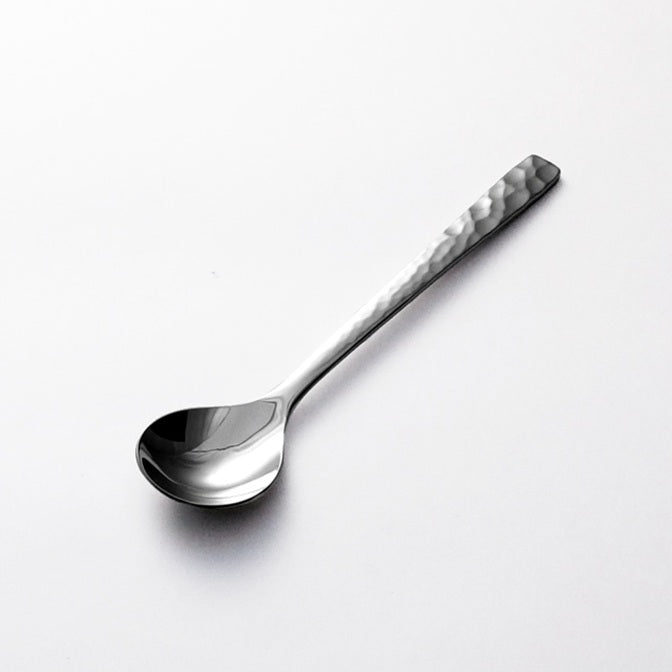 その歴史をカトラリーの手元側から口元側に向けてグラデーションで歴史の移り変わりを表現しました。手元側は鎚目が入り口元側に向けて徐々にミラー仕上げになっていきます。最初の鎚目部分は当初は鏡面に仕上げる技術が無いため艶消しにしています。