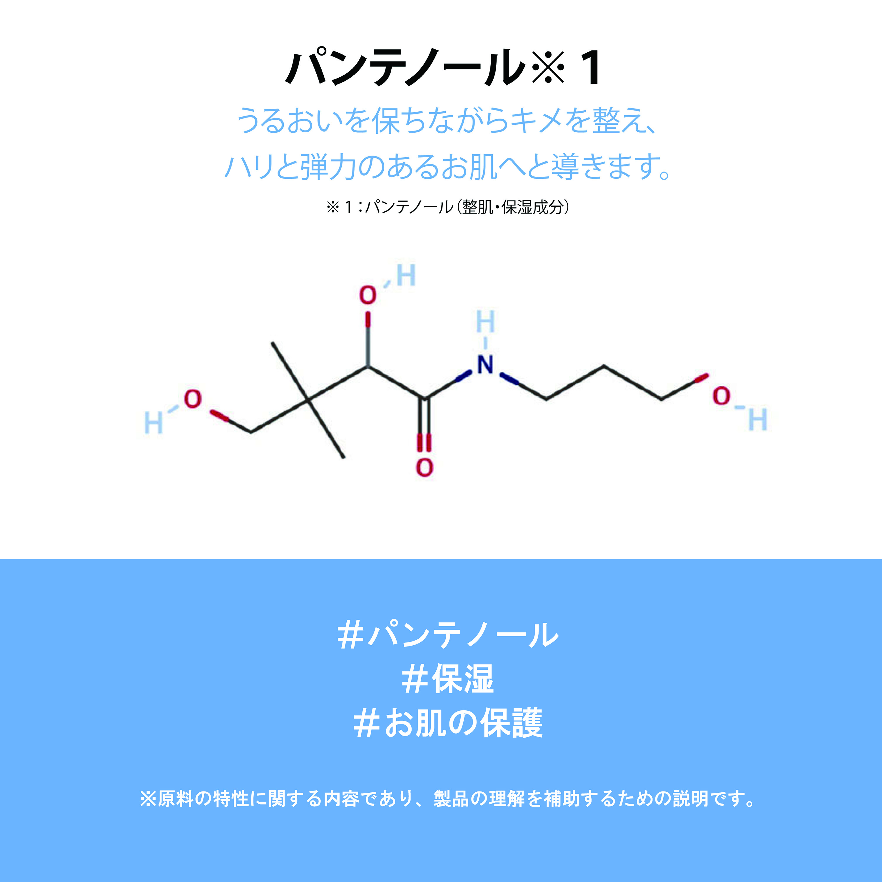 レモン果実エキス※1、パンテノール※2配合で、うるおいを保ちながらキメを整え、ハリと弾力のあるお肌へと導きます。