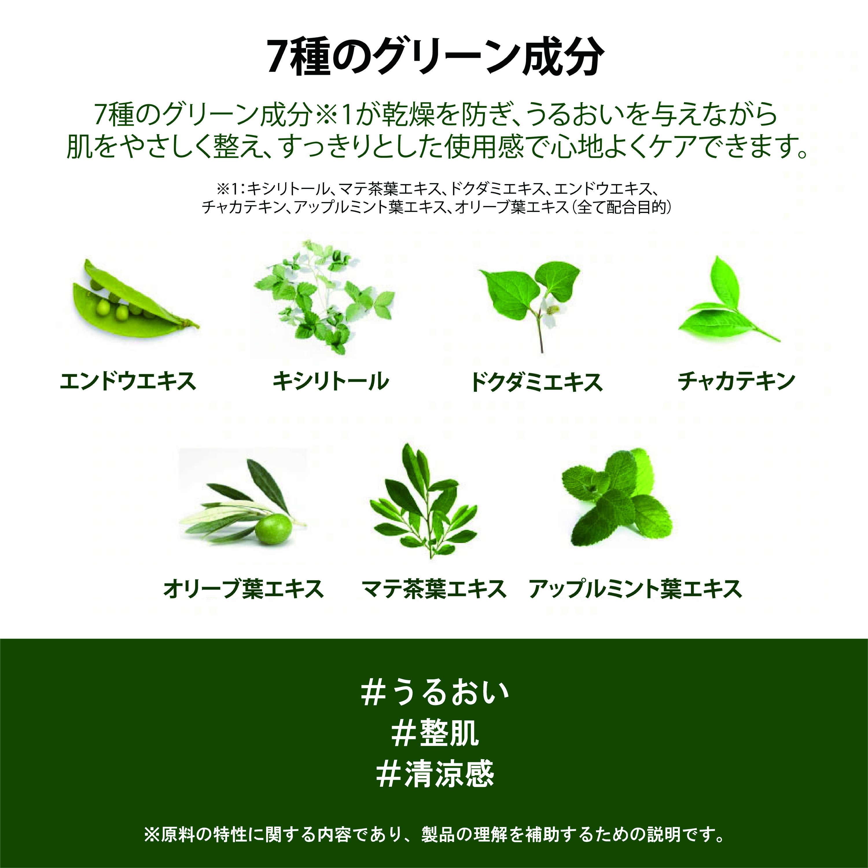 エンドウエキス・キシリトール・ドクダミエキス・チャカテキン・オリーブ葉エキス・マテ茶葉エキス・アップルミント葉エキスの7種のグリーン成分※2が、うるおいを与えながら肌をやさしく整え、すっきりとした使用感で心地よくケアできます。