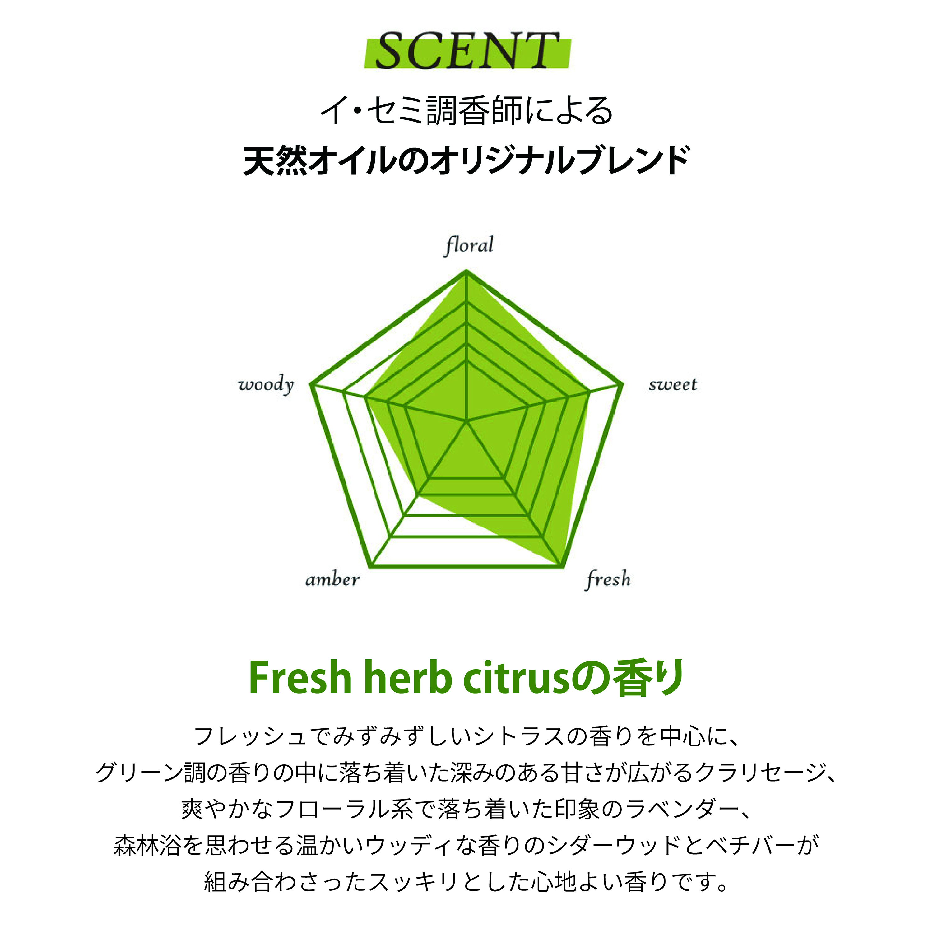 専属調香師によるオリジナルブレンド、Fresh herb citrusの心地よい香りでリラックスしたひとときを。