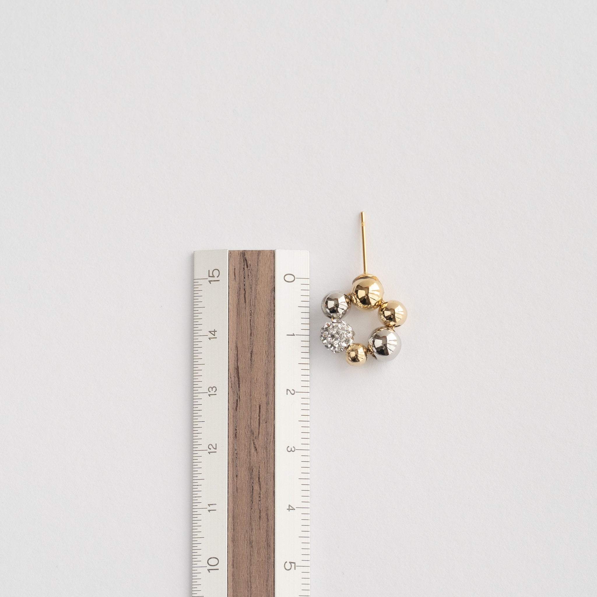 ゴールドとシルバーのミックスによって肌にすっとなじみながら上品な輝きを放ち、クリスタルガラスの繊細な輝きを放つパヴェボールで華美過ぎない存在感を添えてくれます。