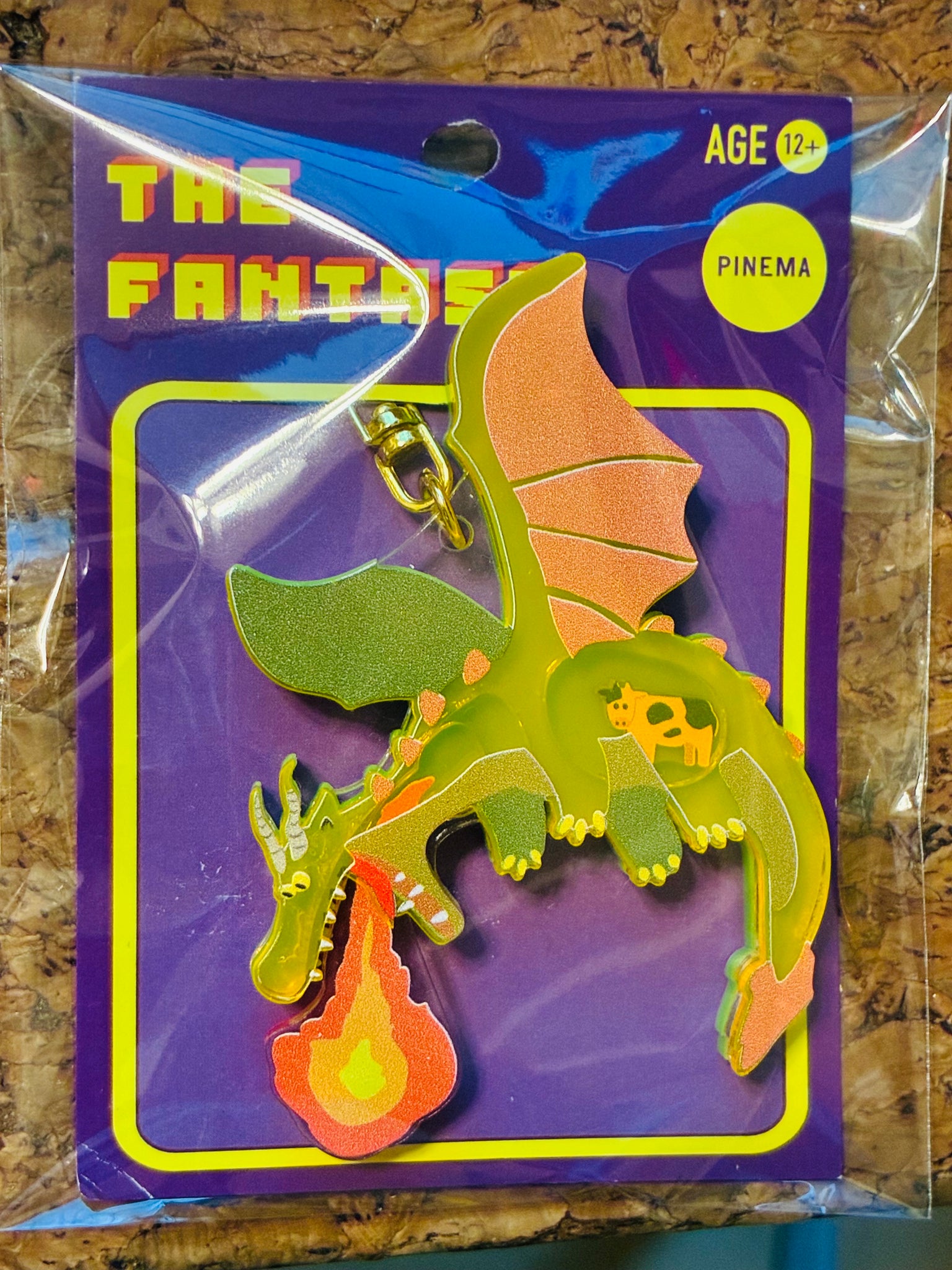 絵本やゲーム、ファンタジー映画に出てくるような火を吹くドラゴンのキーリング。街や農園を襲い人々を襲うような緊迫のシーンをコミカルなキーリングにしました!よく見ると裏面には牛が食べられています‥
