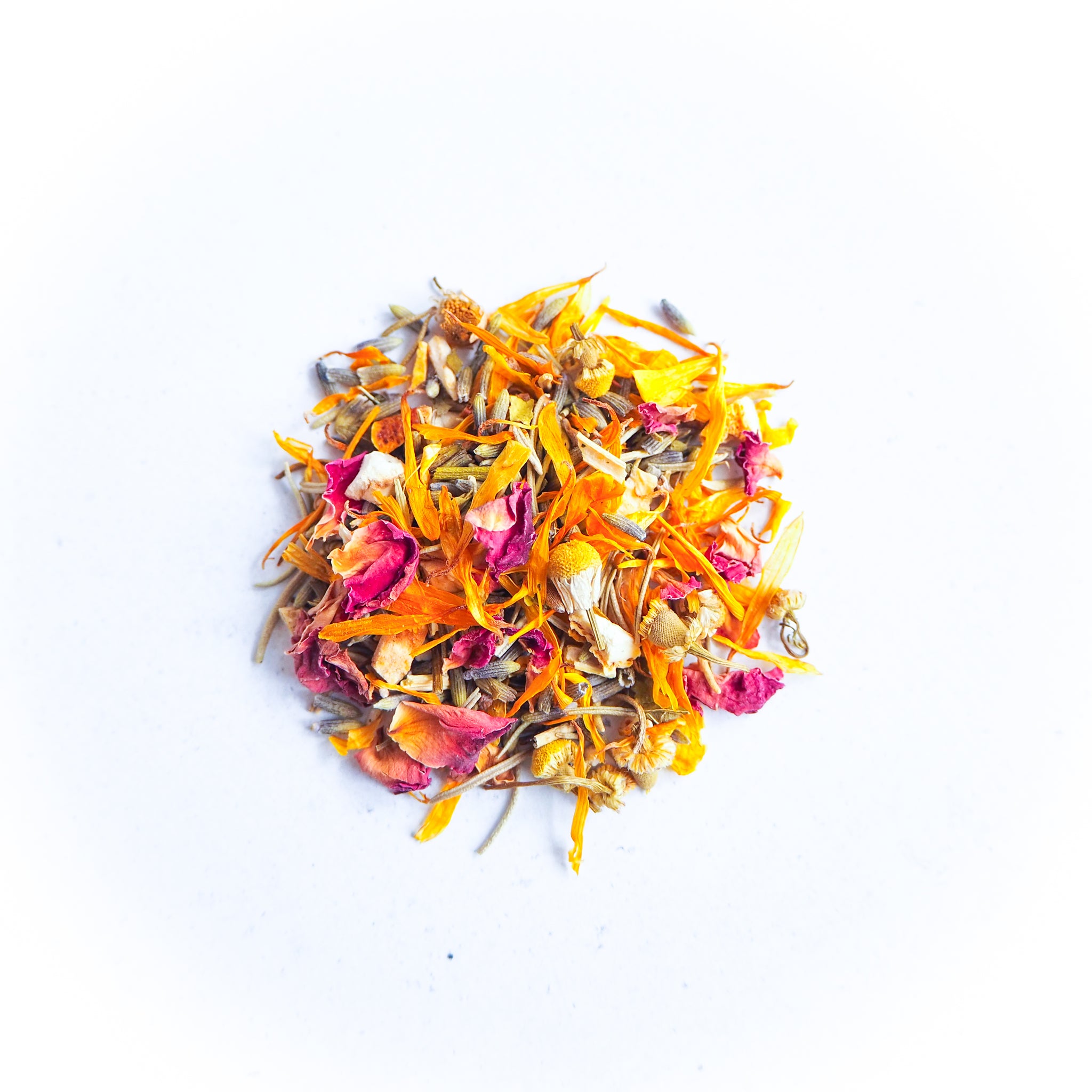 ローズやラベンダー、マリーゴールド、カモミールなど、見た目にも香りにも華やかなハーブを贅沢にブレンド。