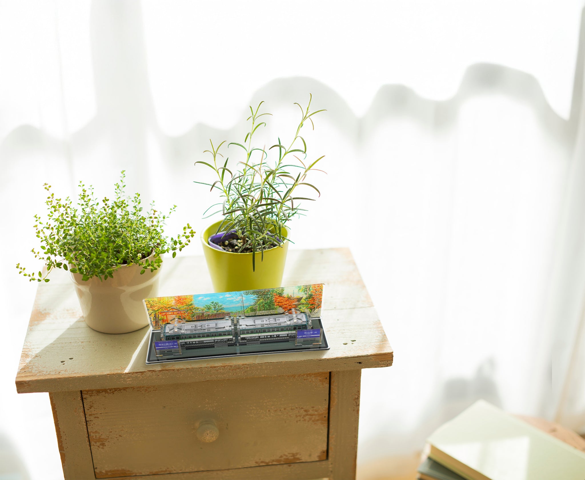 当商品は大津沿線の名所を描いた「風景台座」に2両編成の3Dアクデンを置くと颯爽と走り抜ける電車の躍動感を感じることができ、輝くインテリアとしても楽しむことができる逸品です。
