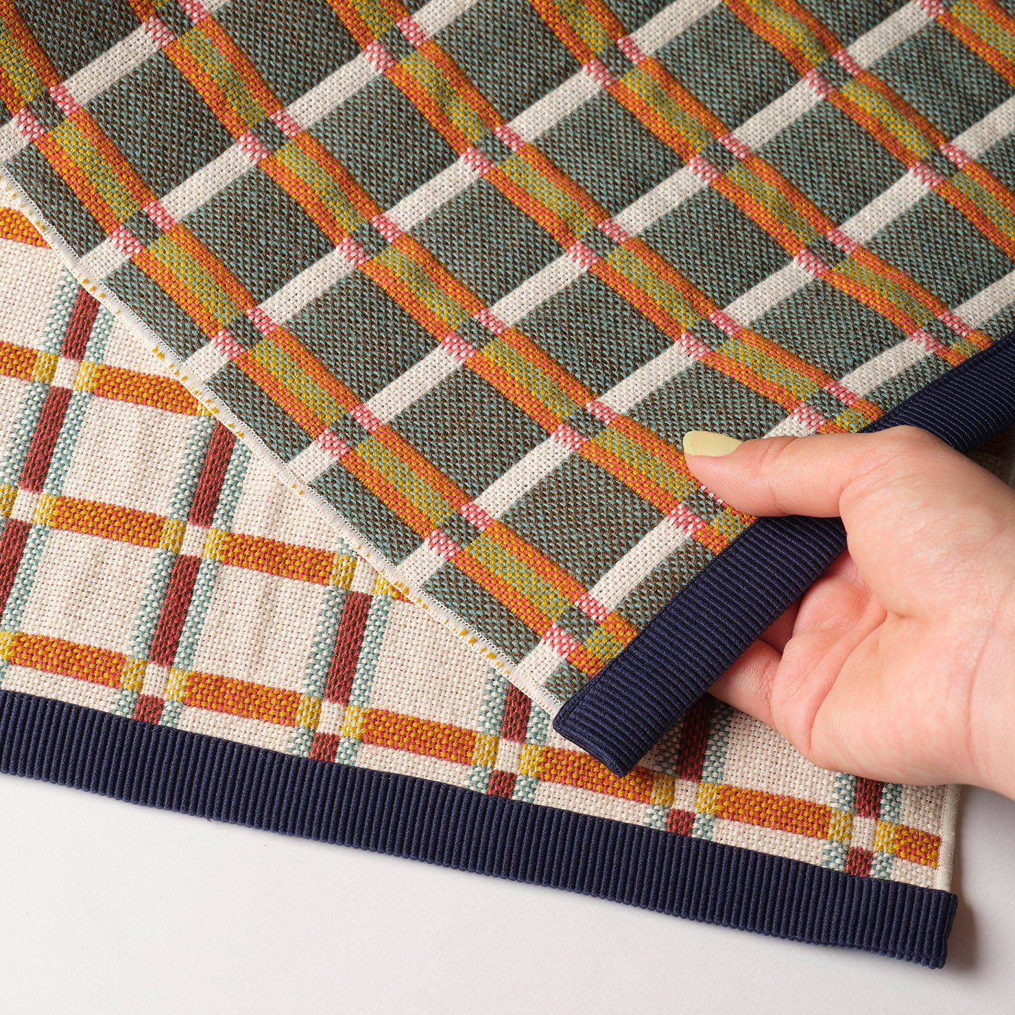 玄関や洗面、観葉植物の足元、棚の上など、ちょっとしたスペースをさっと整えるミニマット。裏表で色が変わるリバーシブル仕様で、季節や気分に合わせて気軽に模様替えできます。