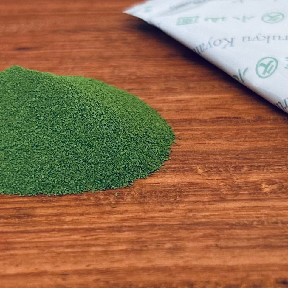 お抹茶はフリーズドライになっていますので玉ができず、お湯はもちろんお水にもすばやく溶けます。通常のようにお抹茶をお湯で点てていただいても美味しく、夏場はアイスのお抹茶ラテなども簡単に美味しくいただけます。