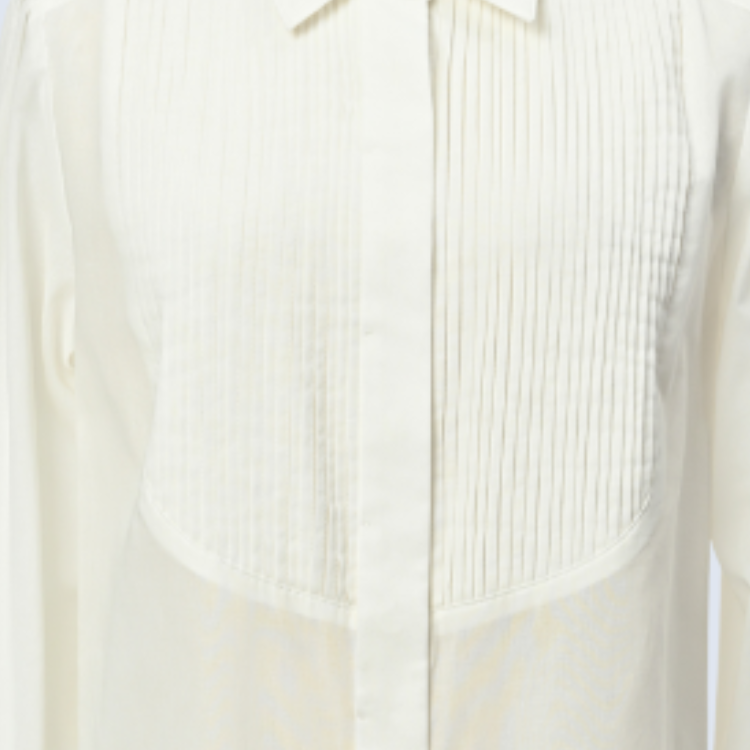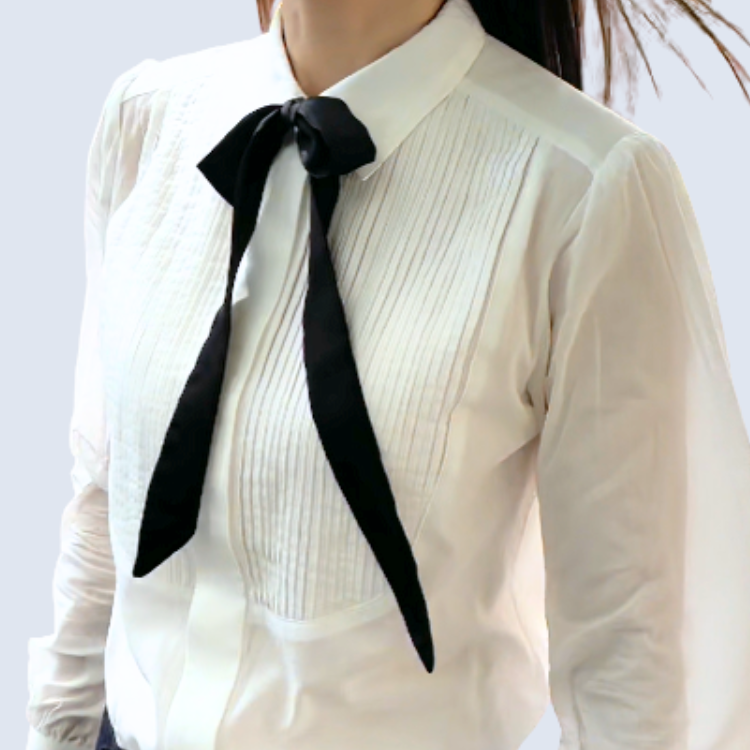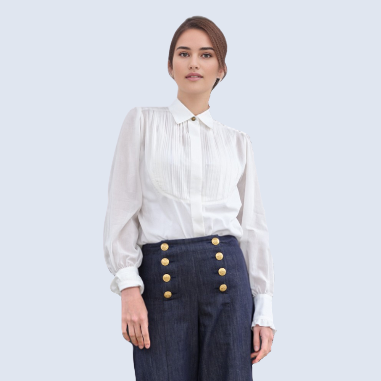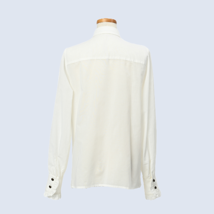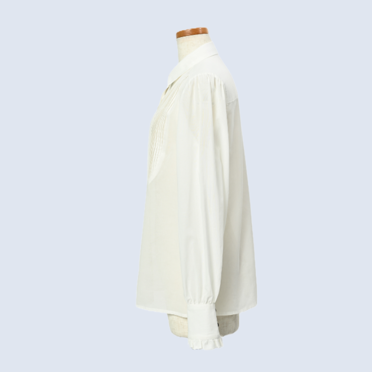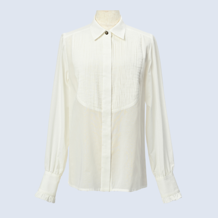 メンズライクなタキシードシャツを、フェミニンなディテールで再構築。