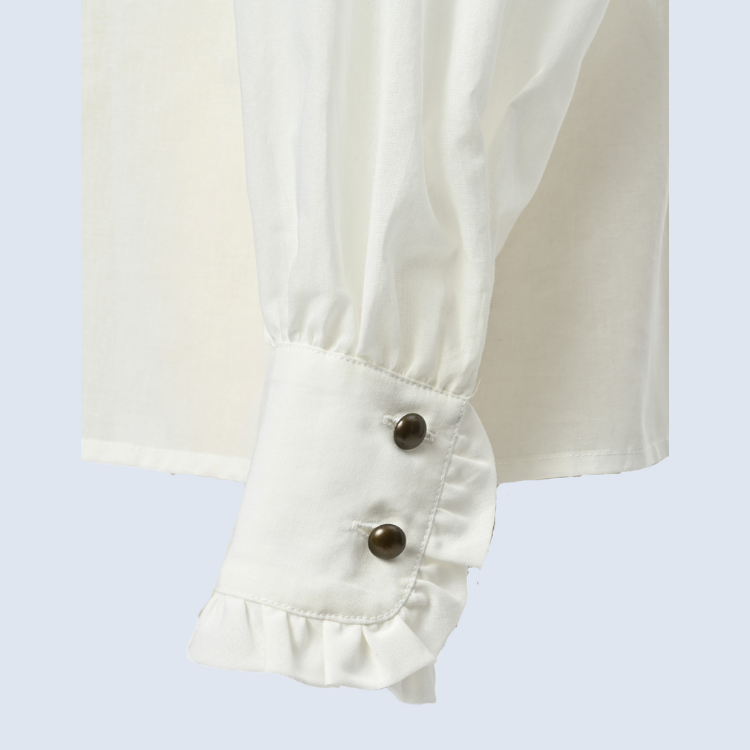 フリルやパフスリーブが甘さを引き立てつつ、シャツカラーが全体を引き締め、絶妙な甘辛バランスに。