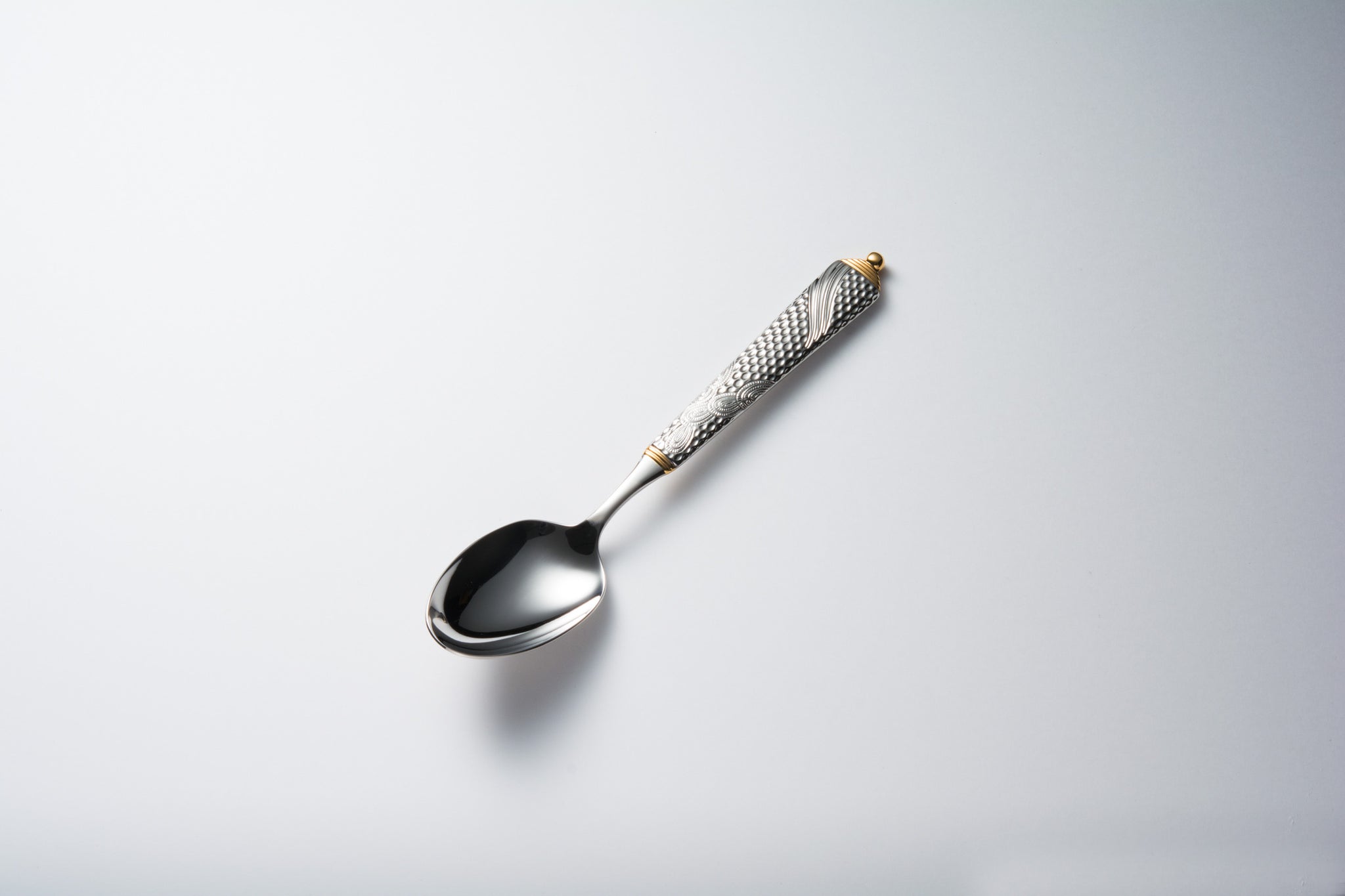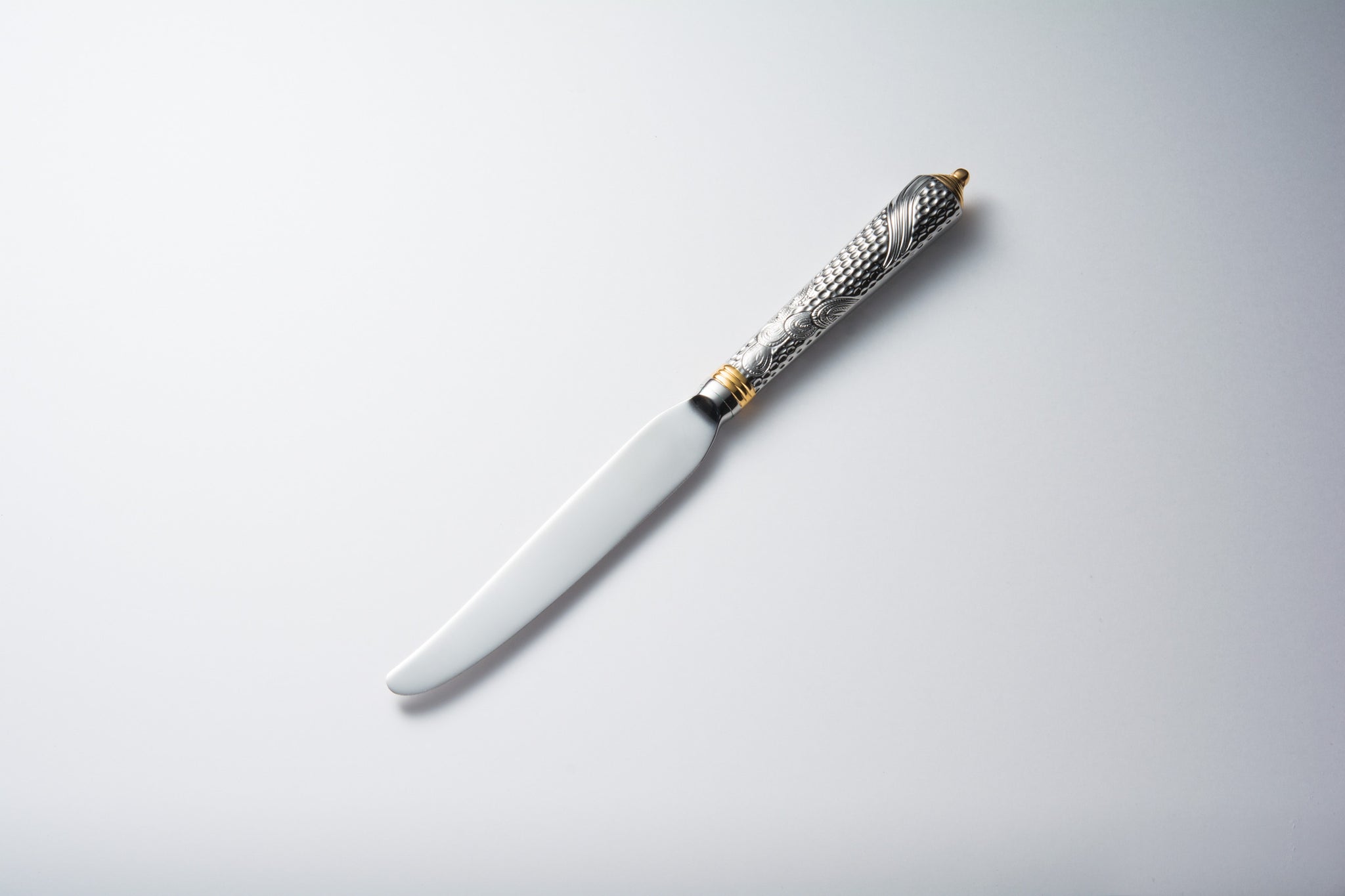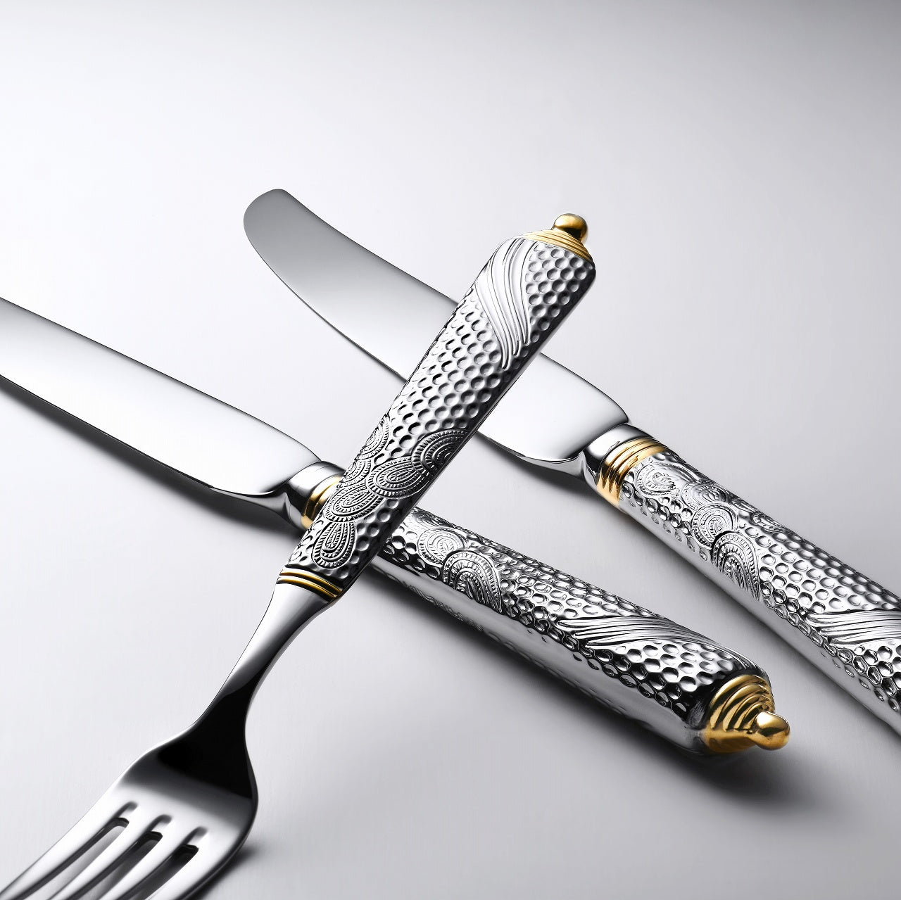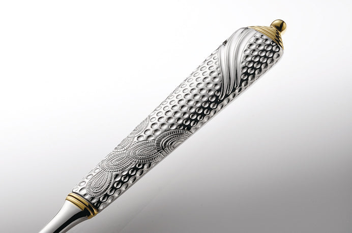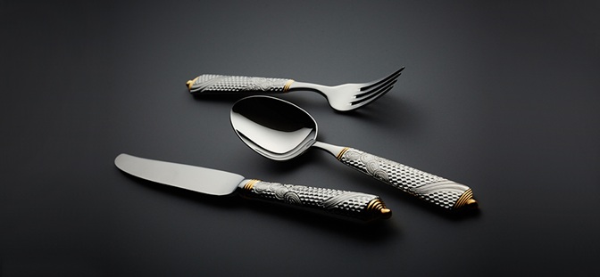 彫刻のように荘厳な細工が施されたカトラリーです。細部にまで細かく刻まれた模様はさながら芸術作品のようです。部分金メッキが更に豪華さを際立たせます。デザイナーのLarry Lasloは室内装飾品作製の権威としてデザイン界で広く知られています