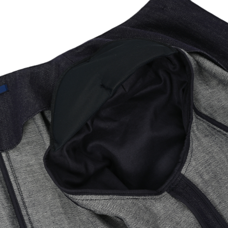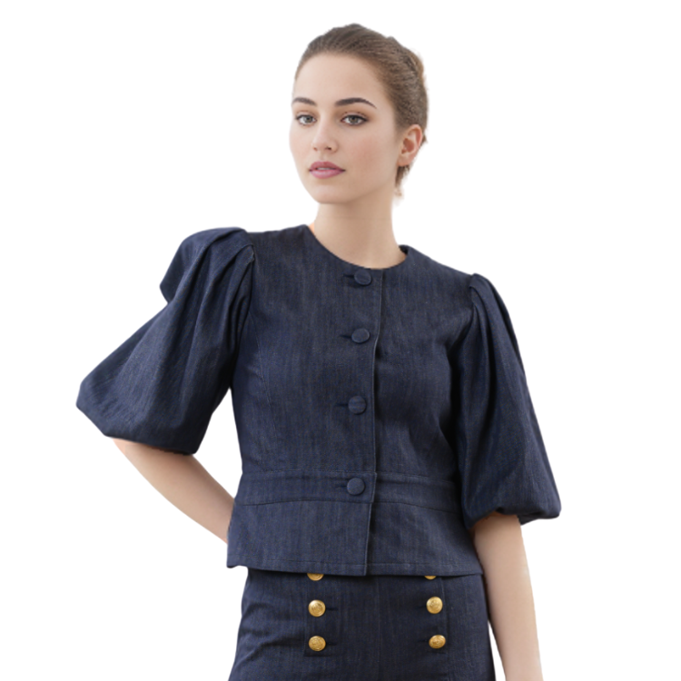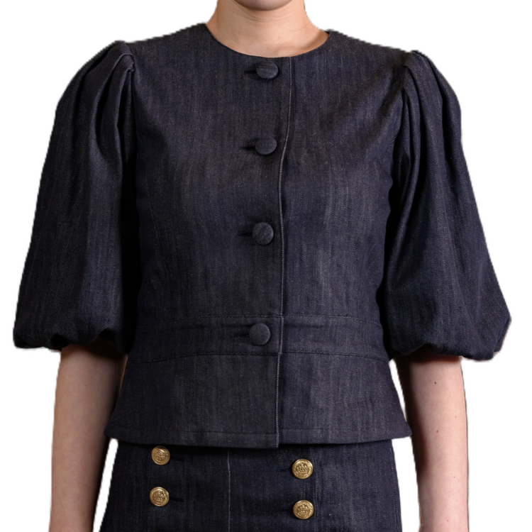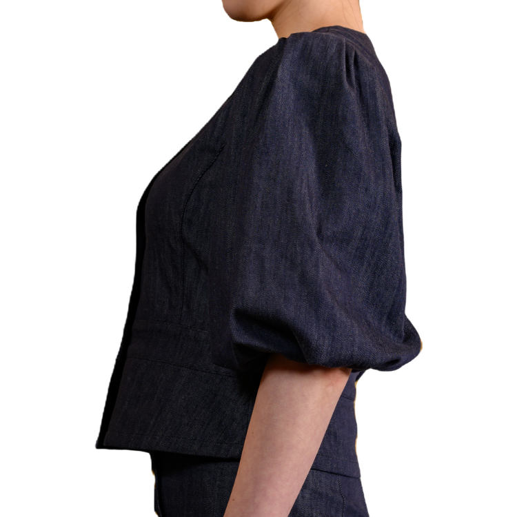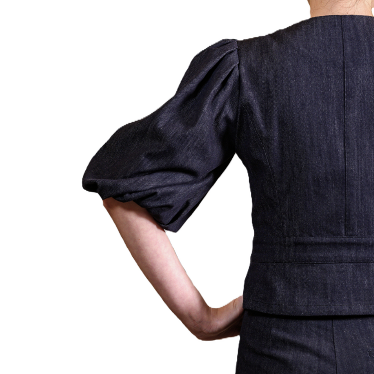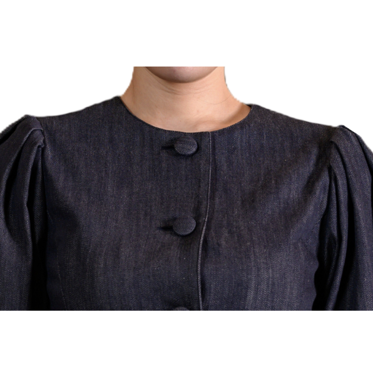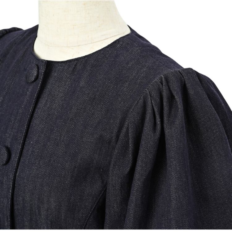 児島デニムの深いインディゴカラーと、1950年代調のクチュール感が融合したフェミニンなジャケット。