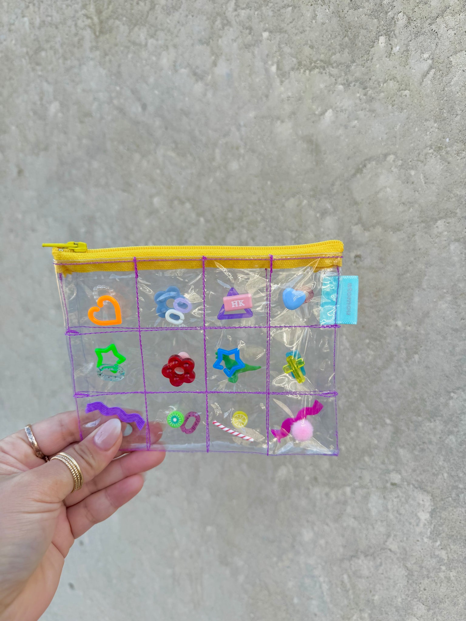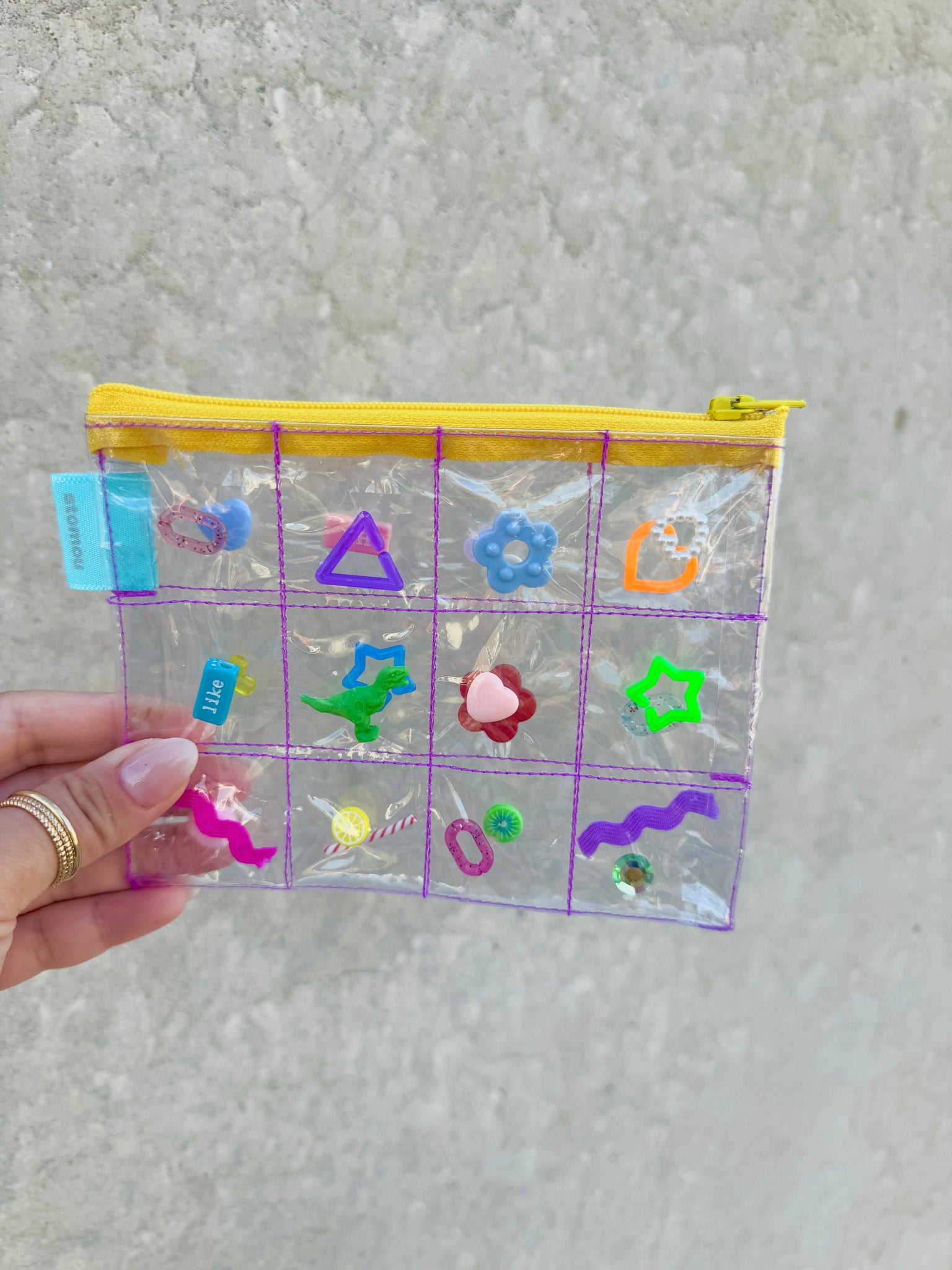 格子に縫ったPVCにパーツを閉じ込めたポーチ