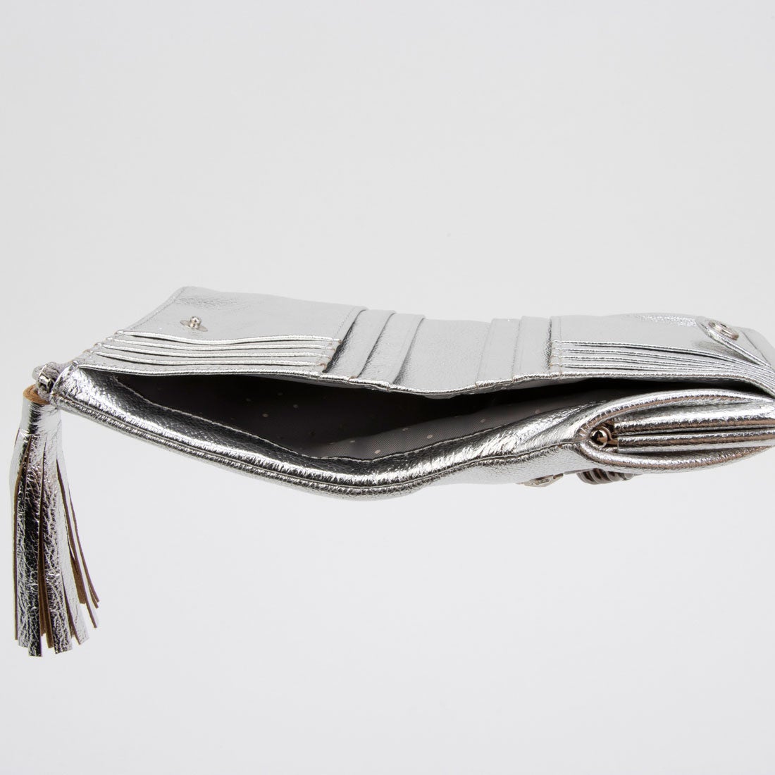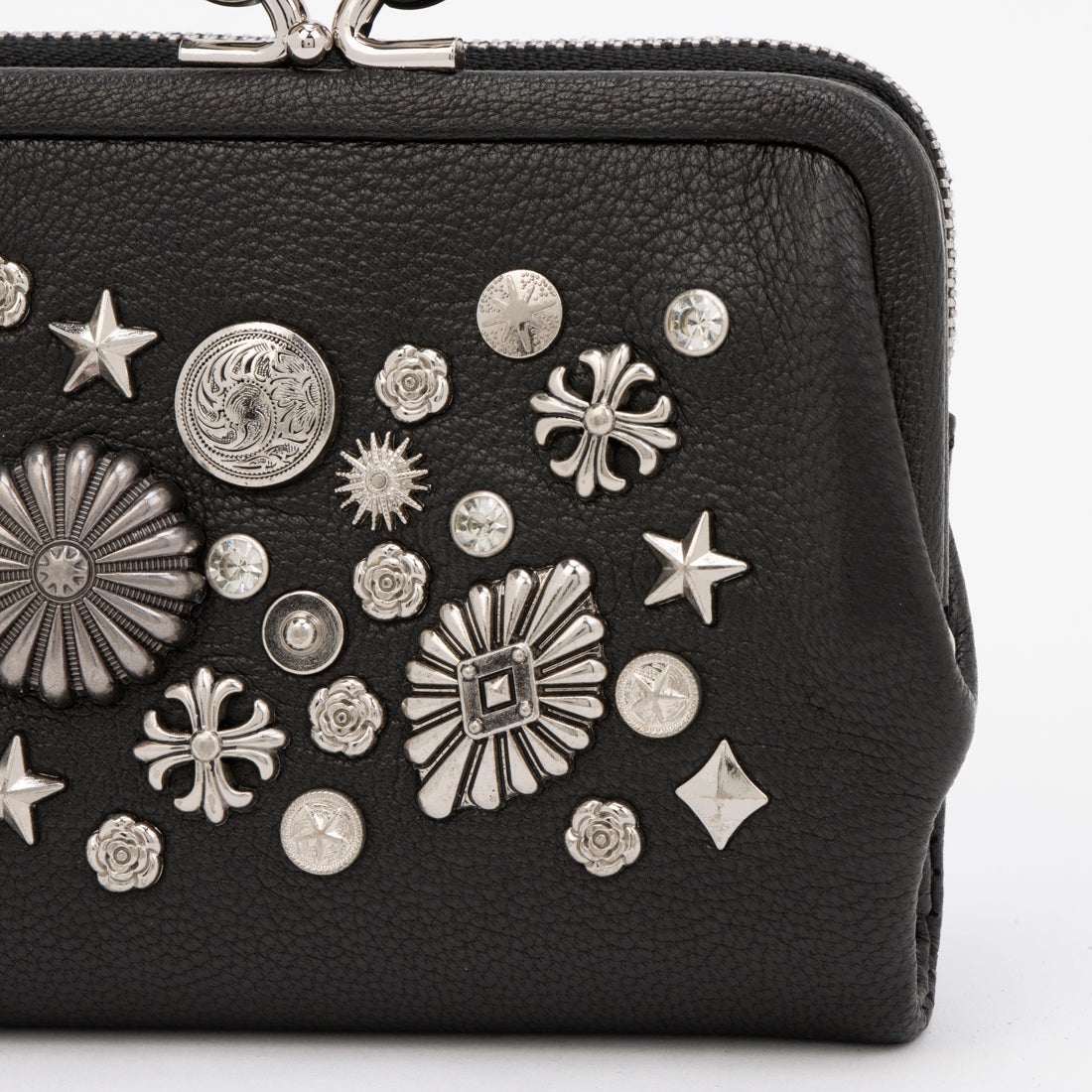 コンチョやいろいろなサイズのスタッズをちりばめたクールでインパクトのあるマルチスタッズ2つ折り財布。