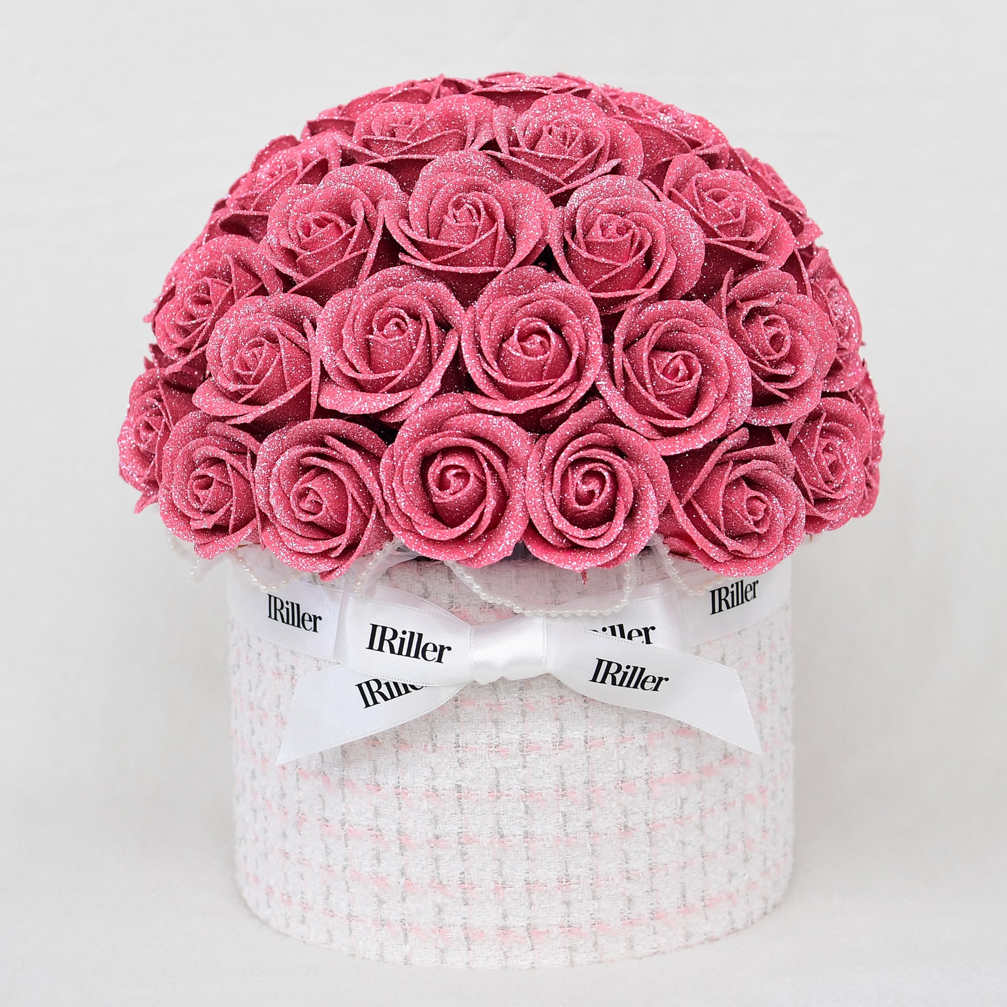 尾州ツイードボウルブーケ 桃雫〈ピンクバラ50本〉|日本製グリッターローズ|IRiller(アイリエ)