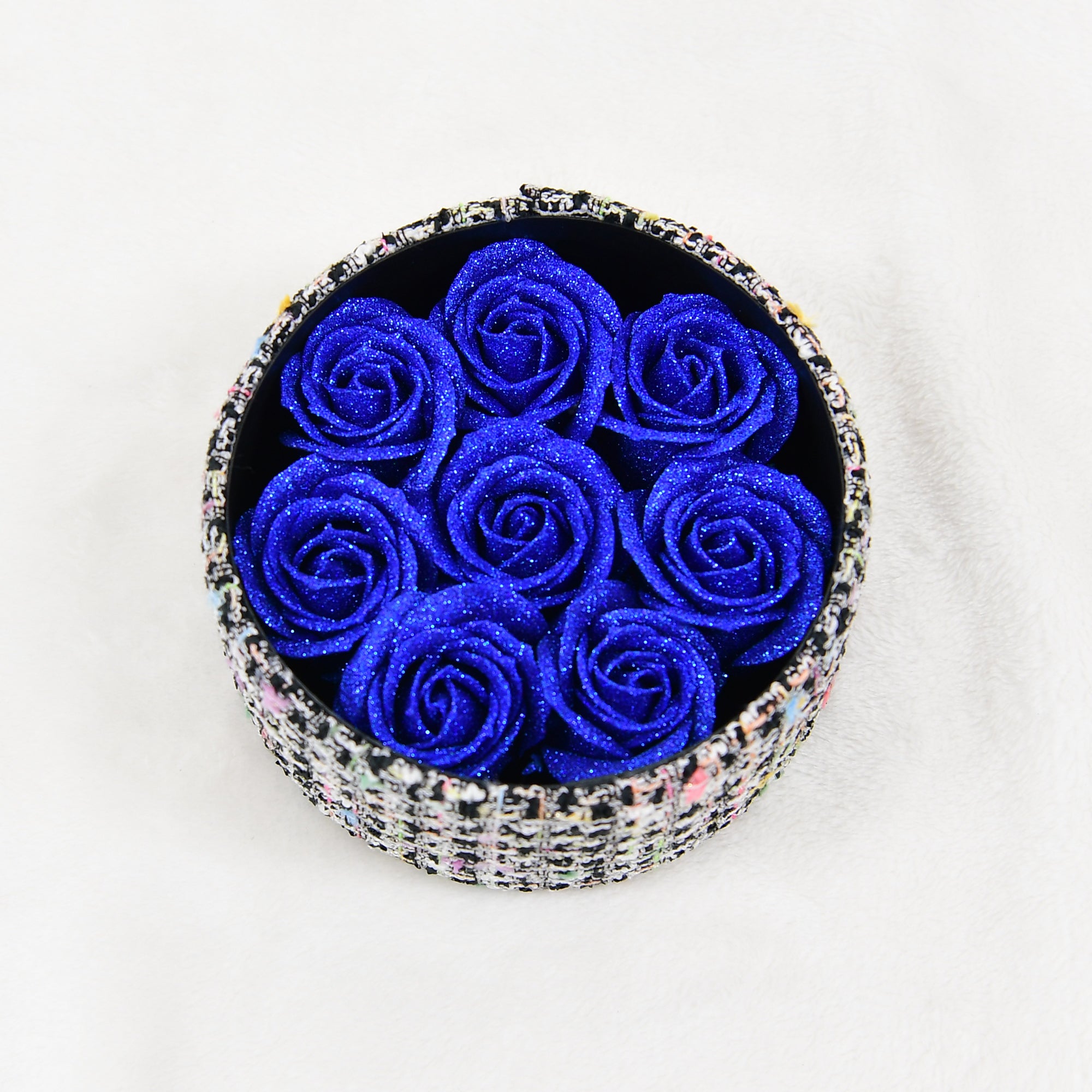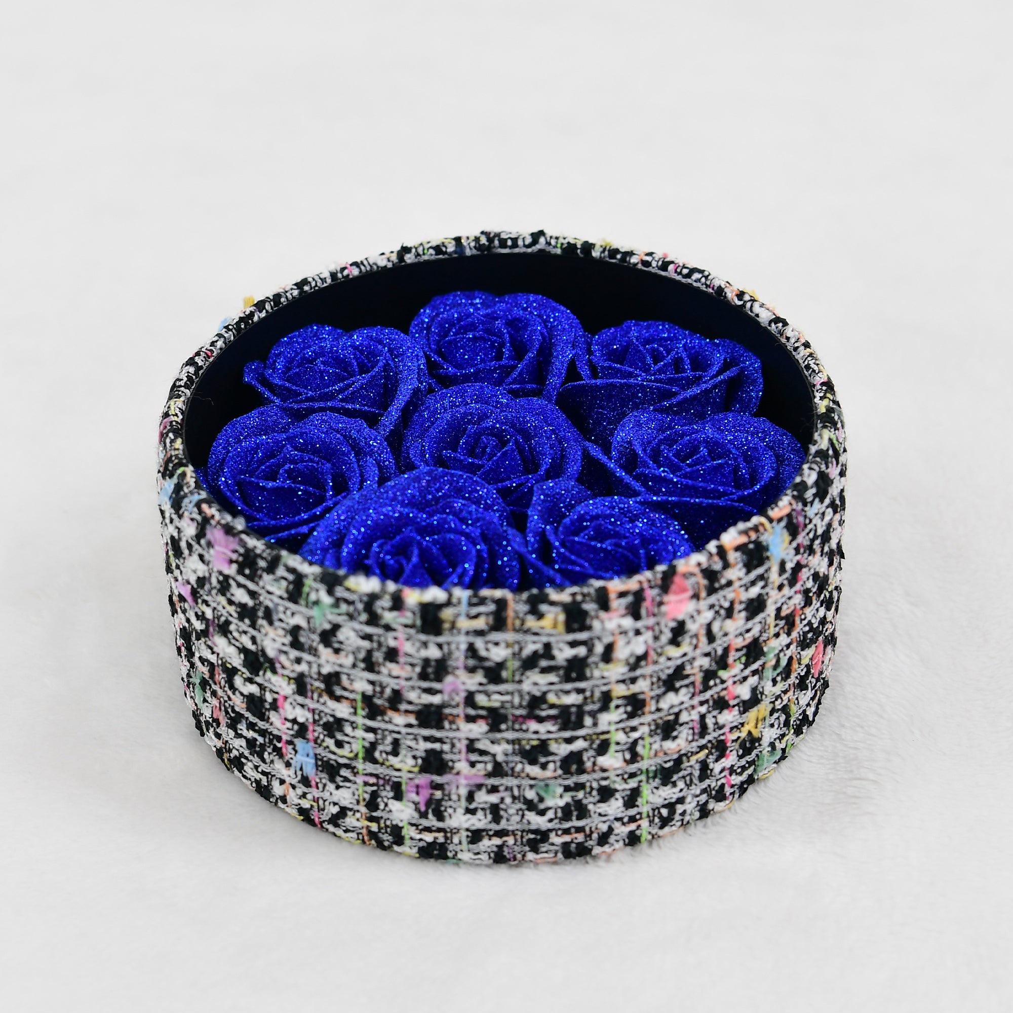 尾州ツイード(華絹)でラッピングしたお箱に、8輪のグリッターローズを閉じ込めた特別なアイテムです。