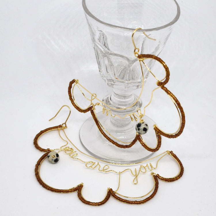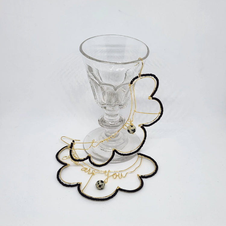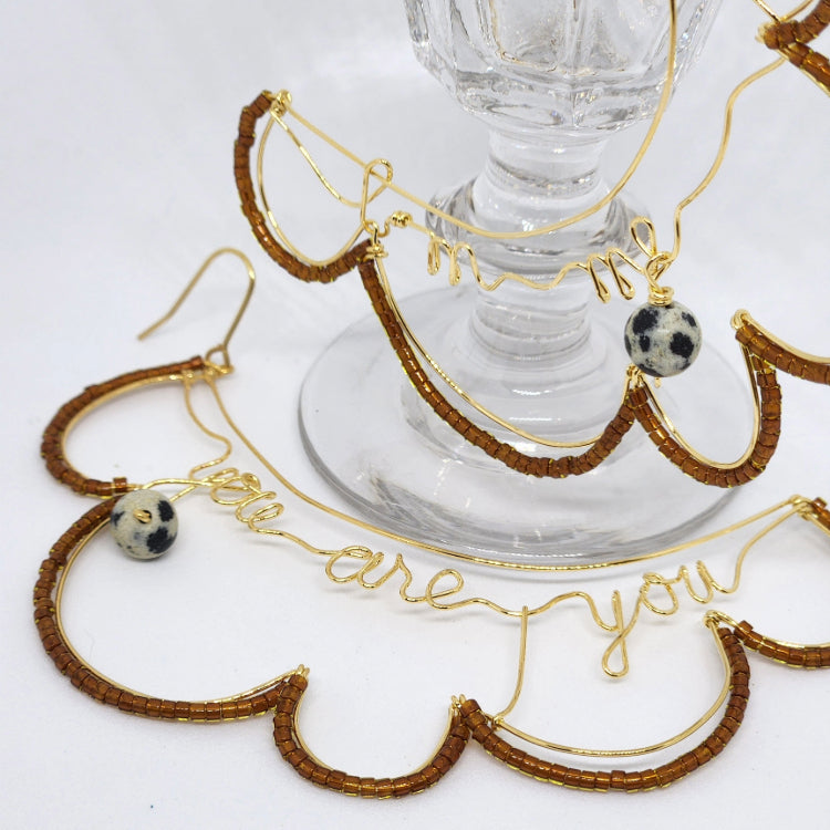 シンプルな線でスカラップを描き、メッセージと白黒のダルメシアンジャスパー(天然石)をアクセントにしています。