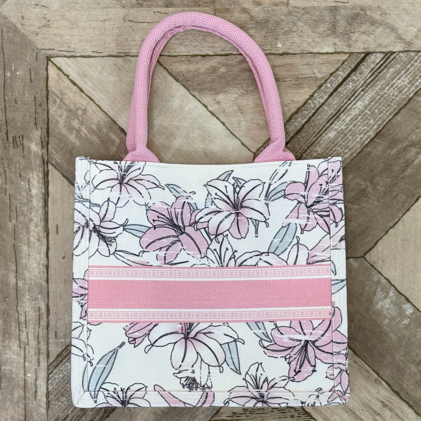 クラシカルな百合(リリー)柄をあしらった、シャビーシックなキャンバスバッグ。 上品さと可愛らしさを併せ持つデザインで、日常のスタイルにやさしく華を添えます。