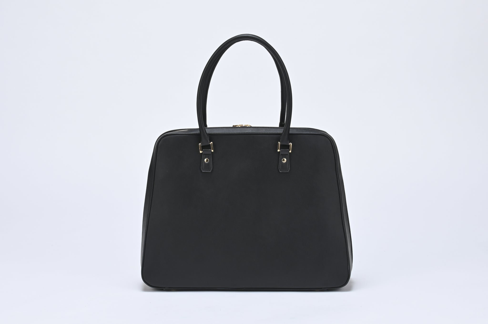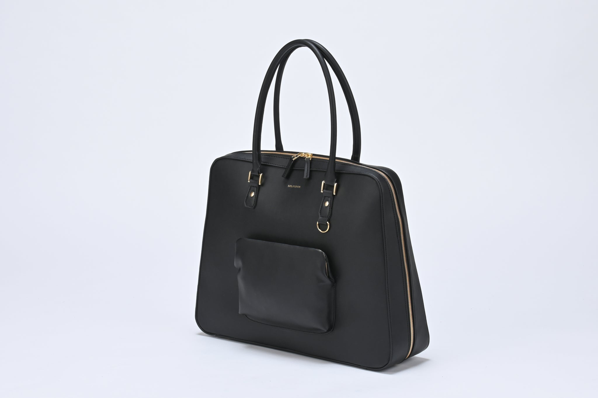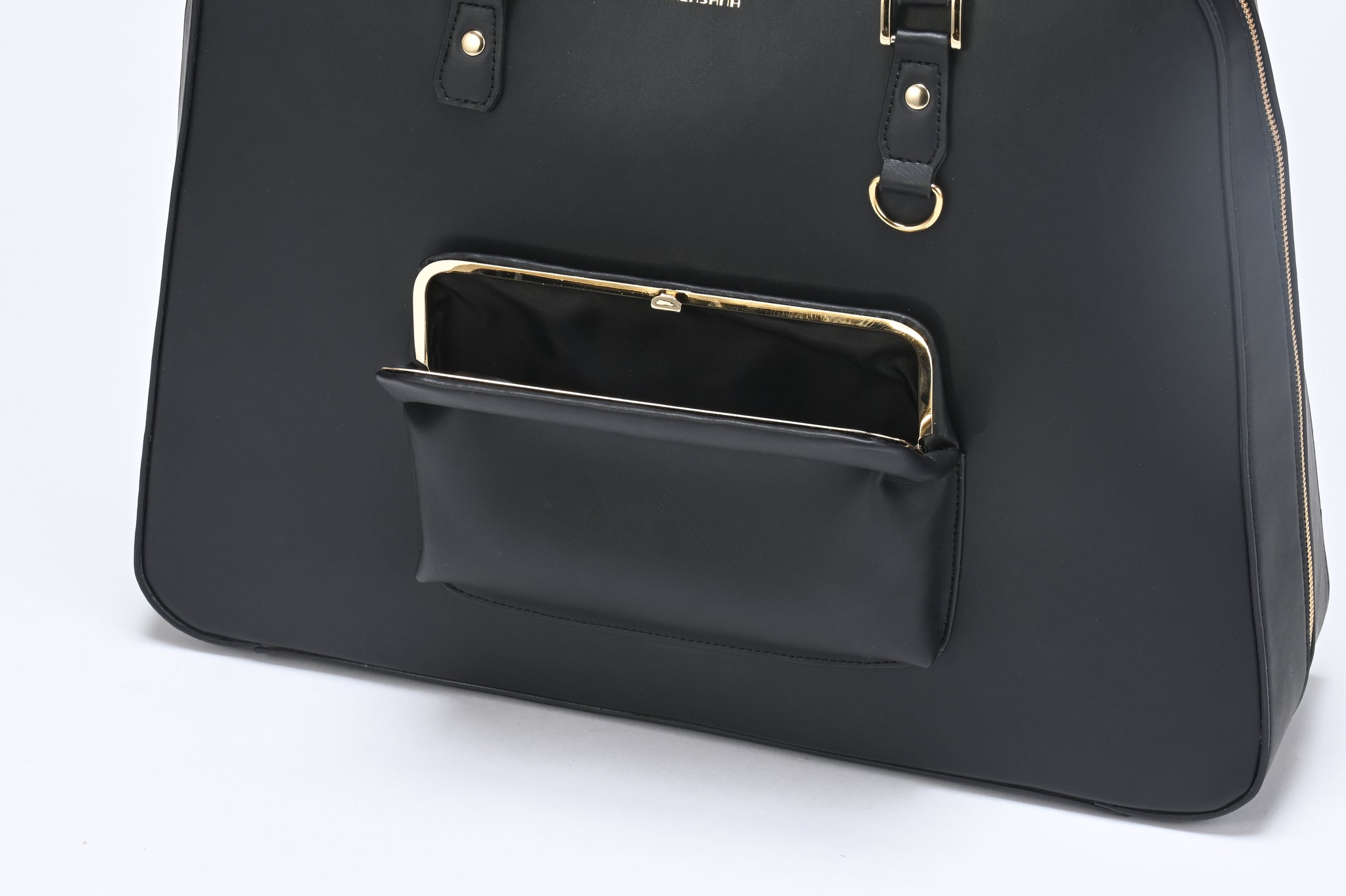 シンメトリックファスナーを使用し、両方向から滑らかに開閉できます。内側に設けられているクッション材の入った保護力のあるPCポケットは、16インチまでのノートPCを収納可能。 反対側にはジップポケットが付いているので、貴重品入れとして最適。前方にはスマートフォンや財布などの必需品を収納できる大きめのがま口(天溝口金)ポケットがあります。ボトム部分は底びょう付きでしっかり自立します。