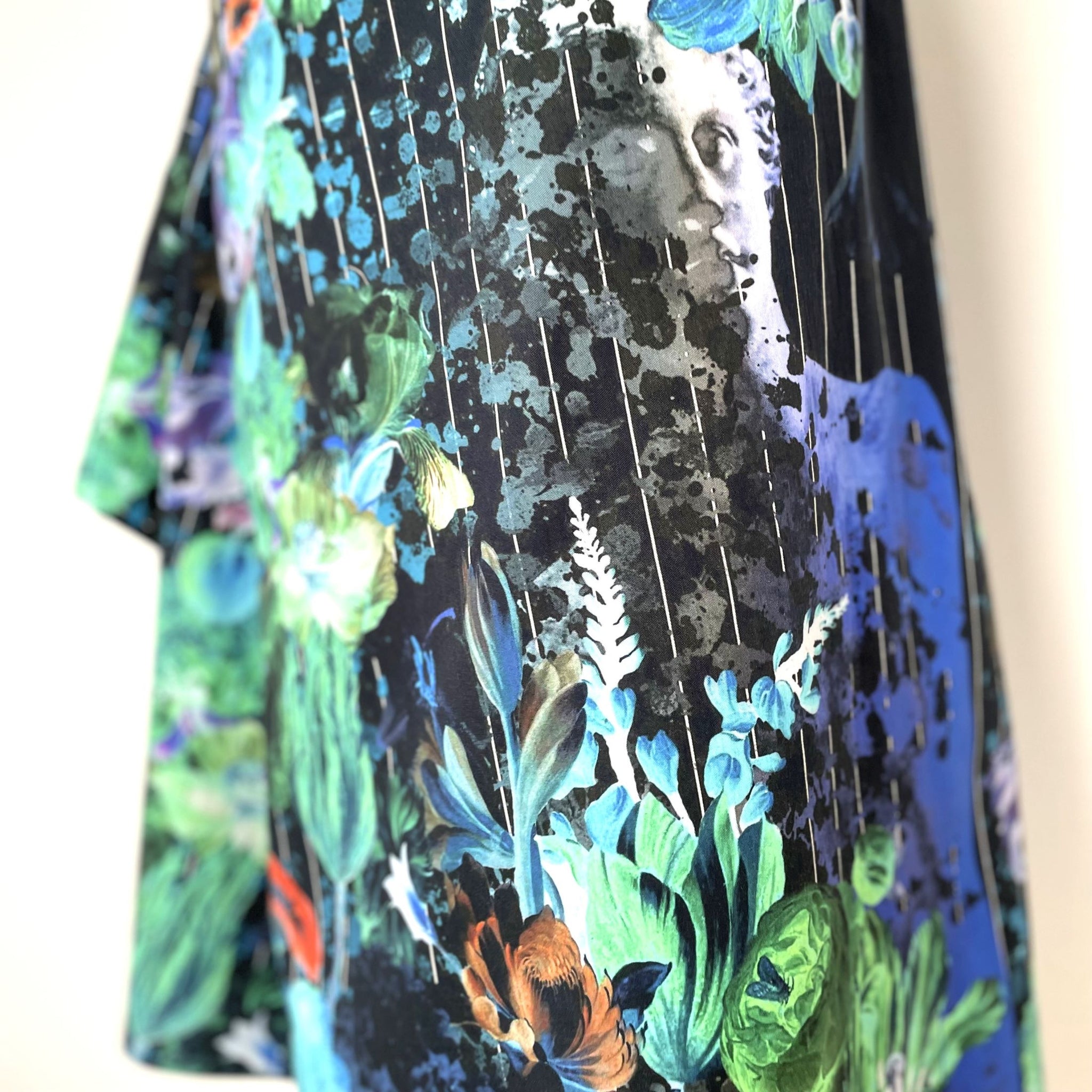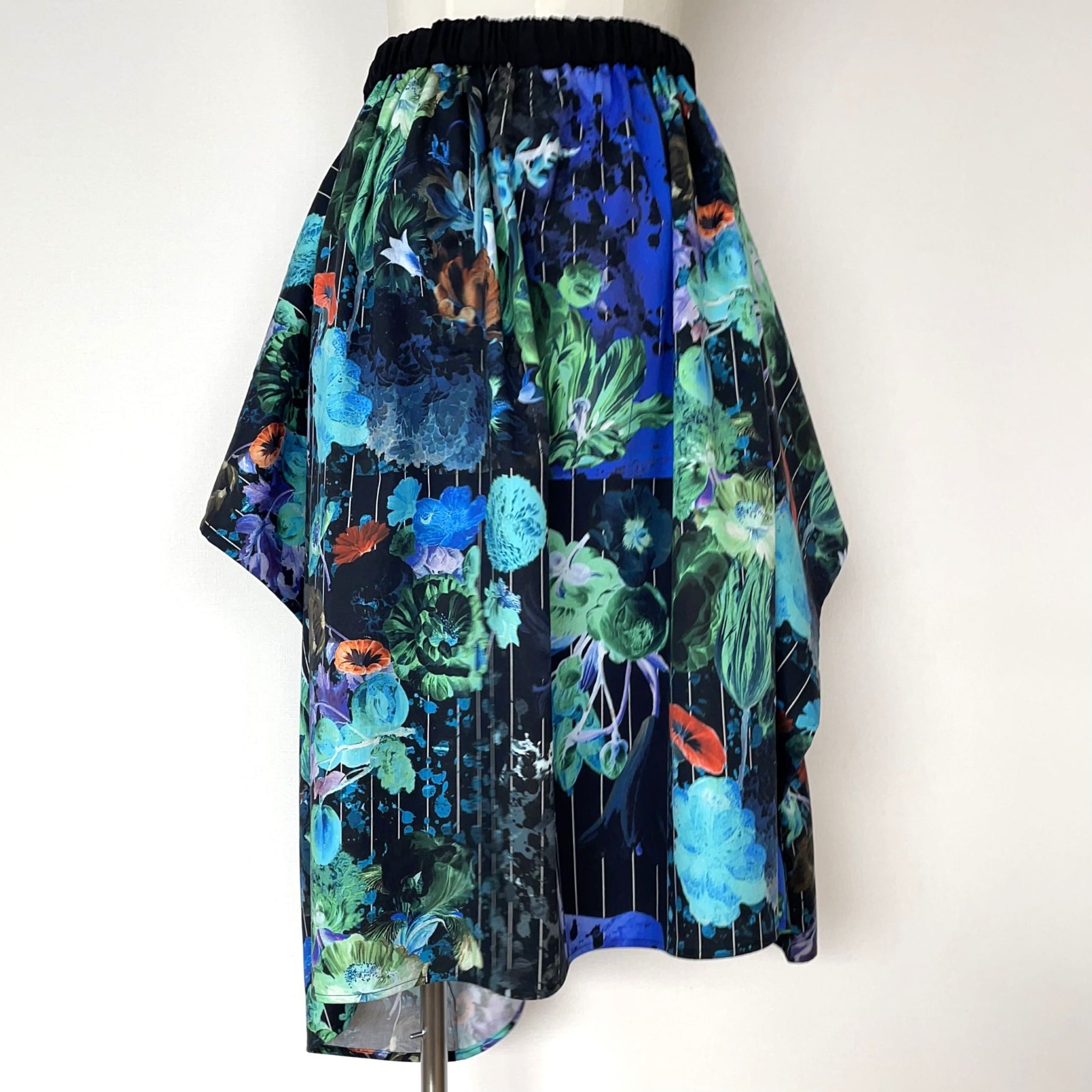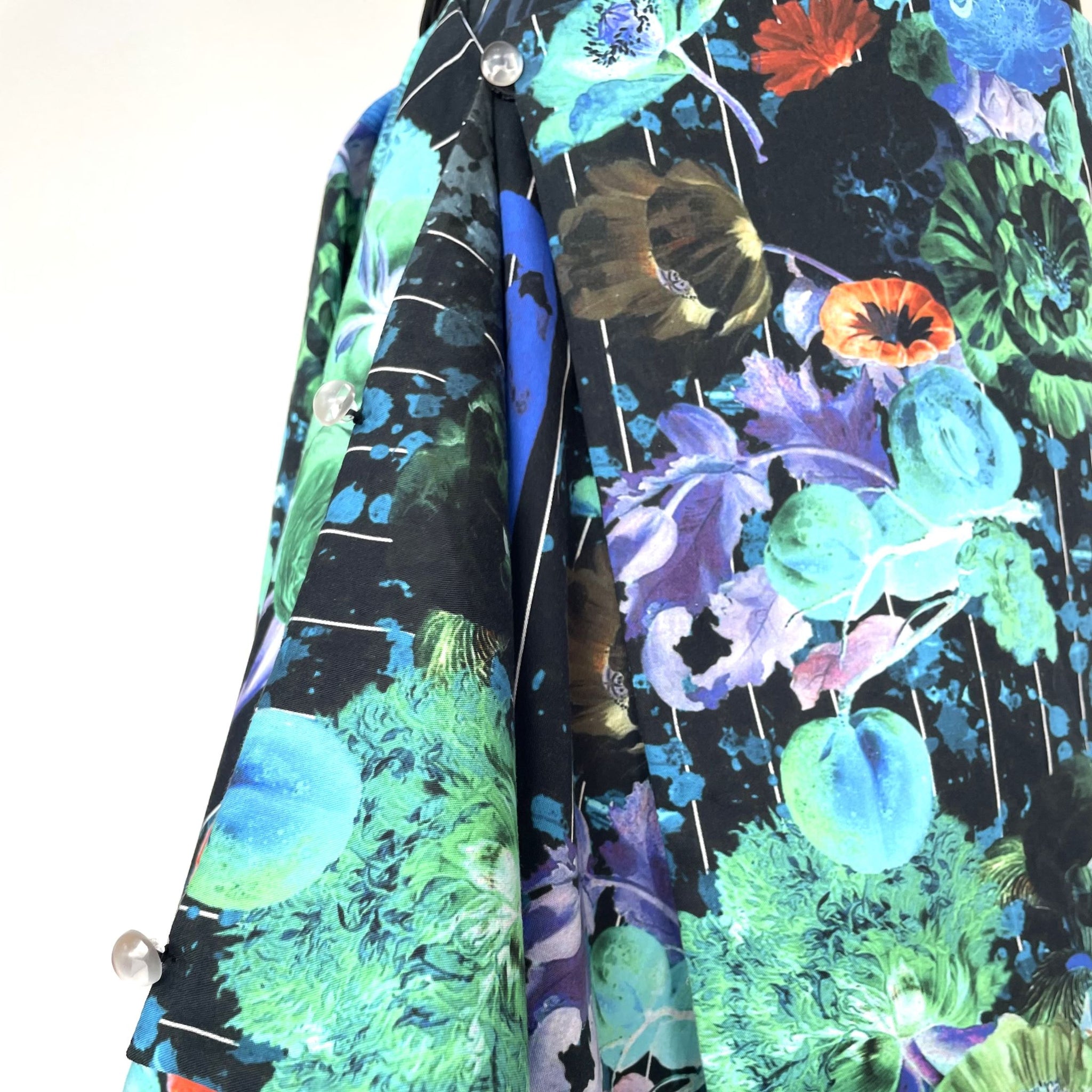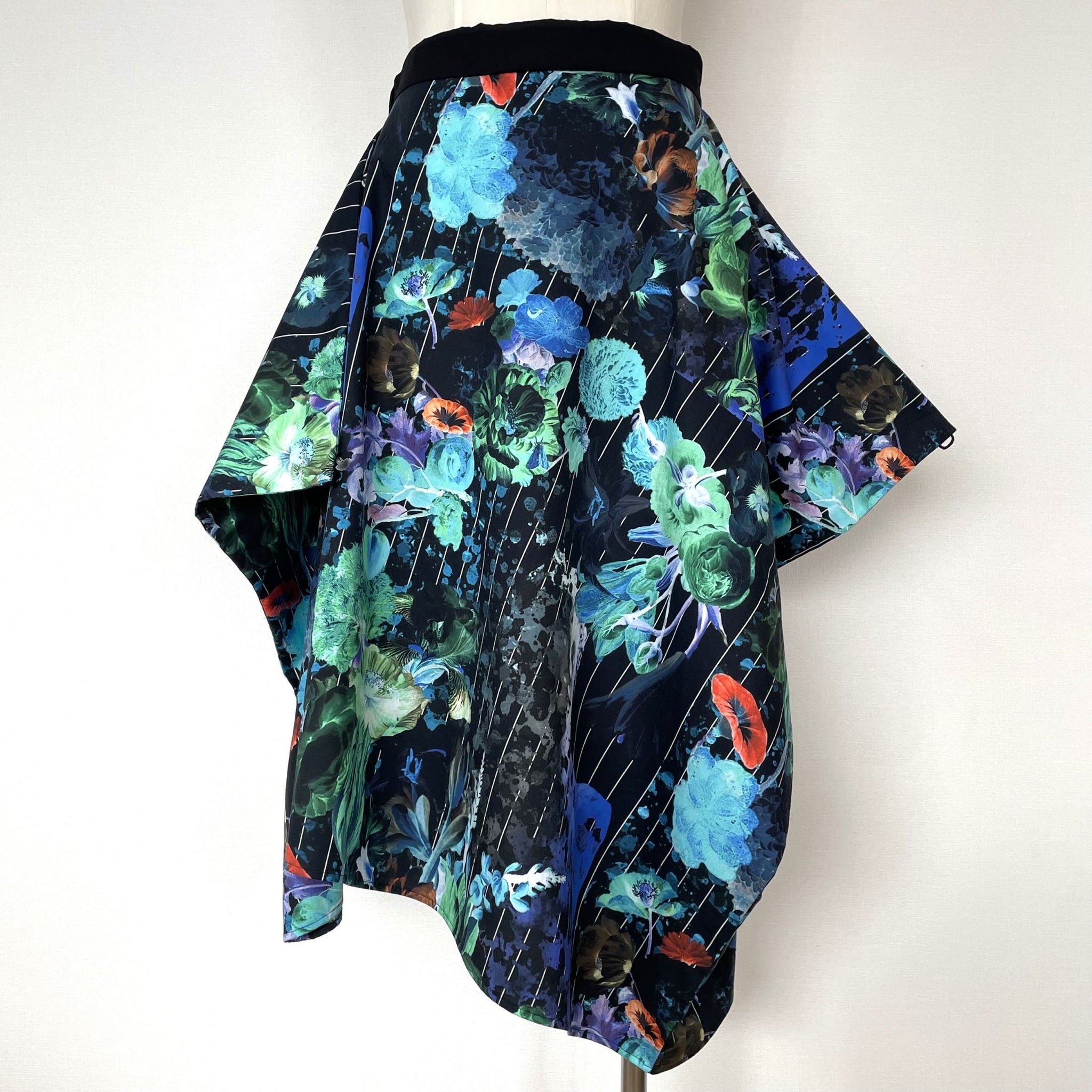 オリジナルのデジタルアートをプリントした生地で、デザイン、型紙、縫製まですべての工程をデザイナー自身が行いました。