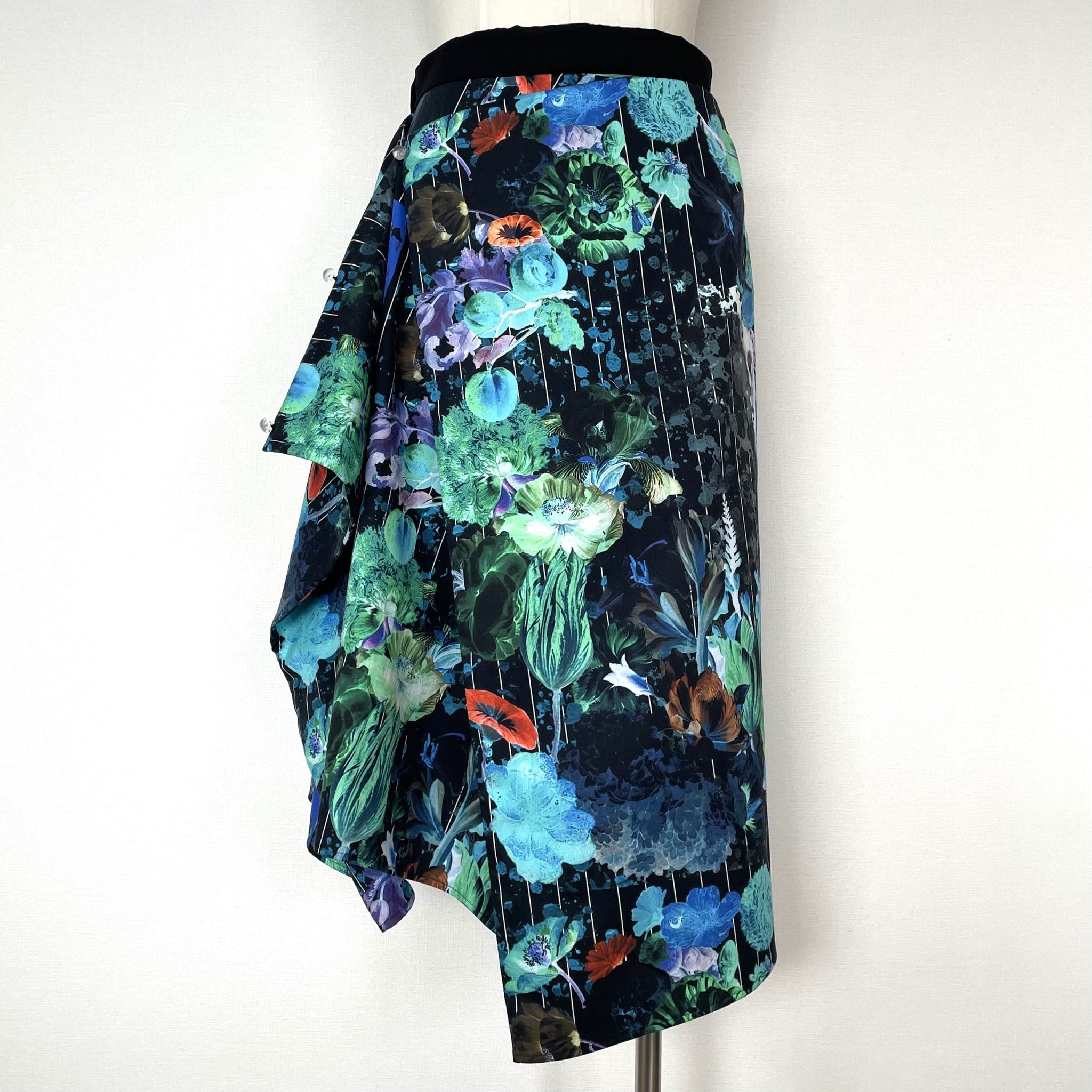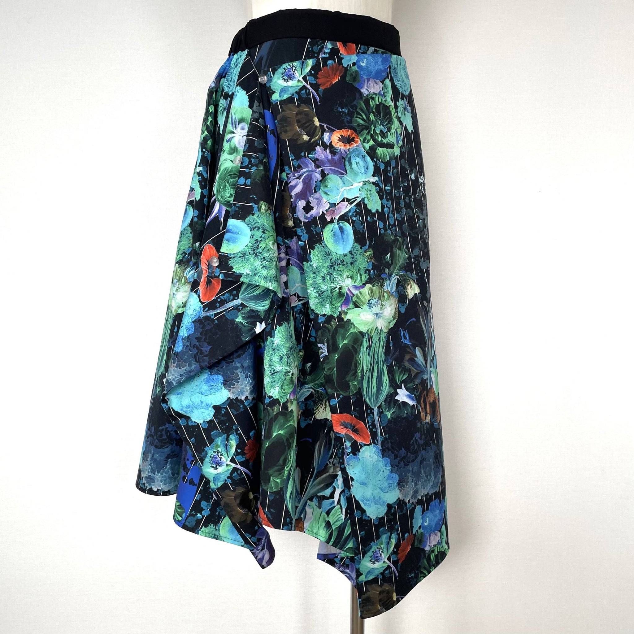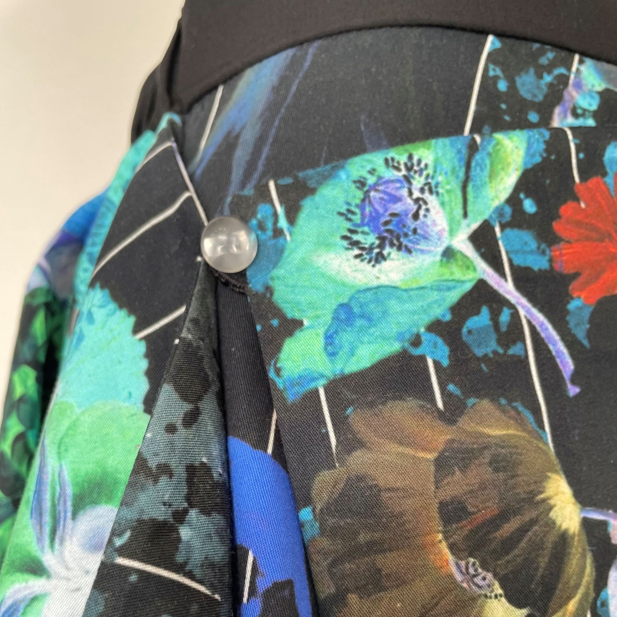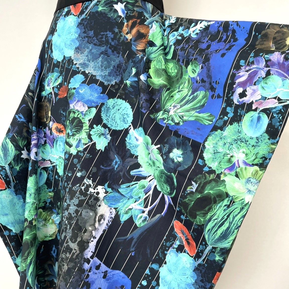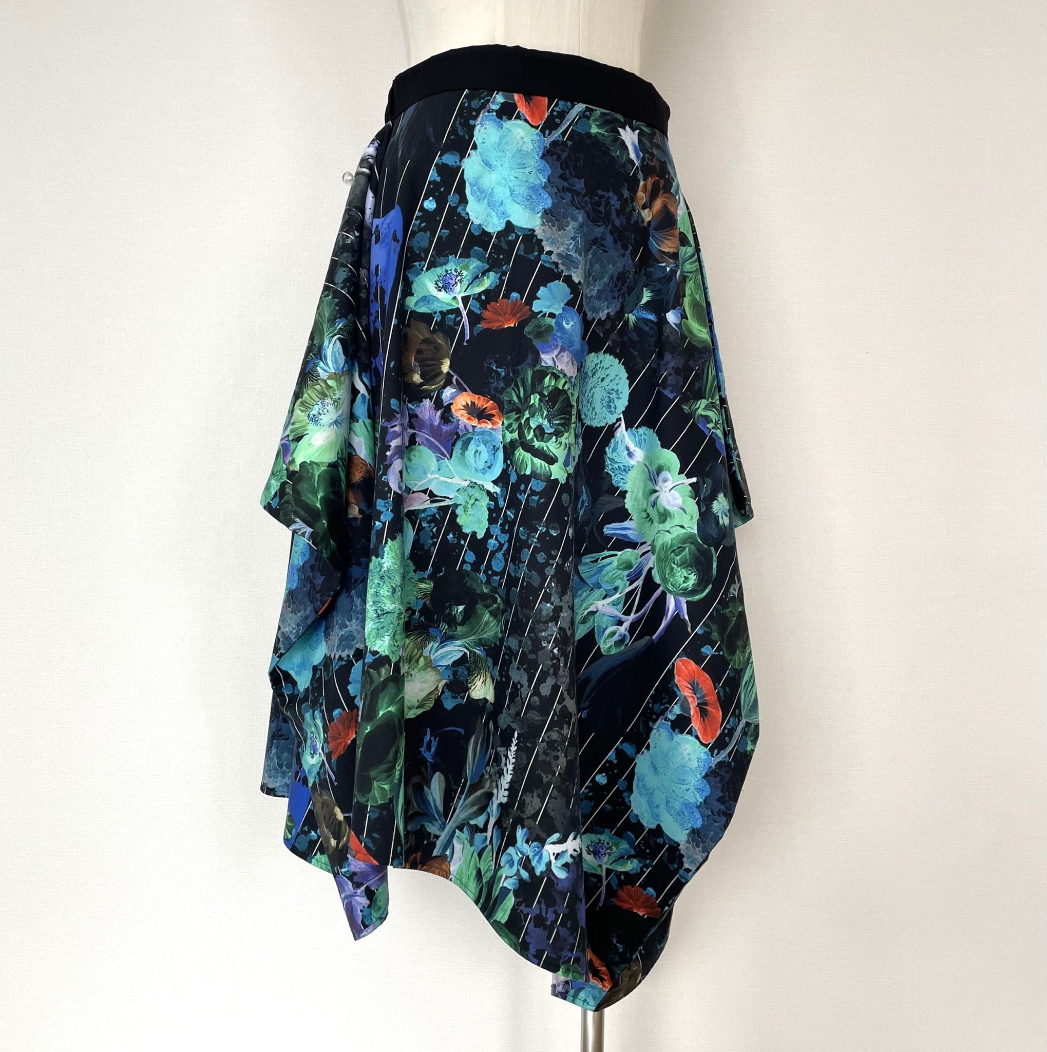 オリジナルのデジタルアートをプリントした生地で、デザイン、型紙、縫製まですべての工程をデザイナー自身が行いました。