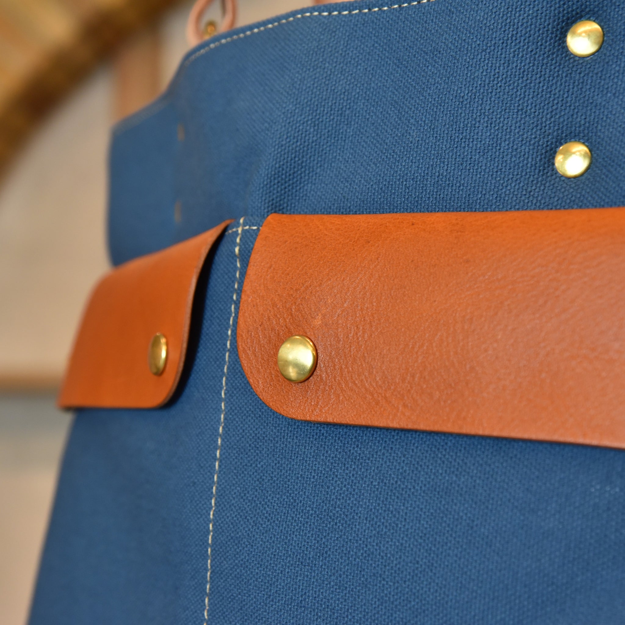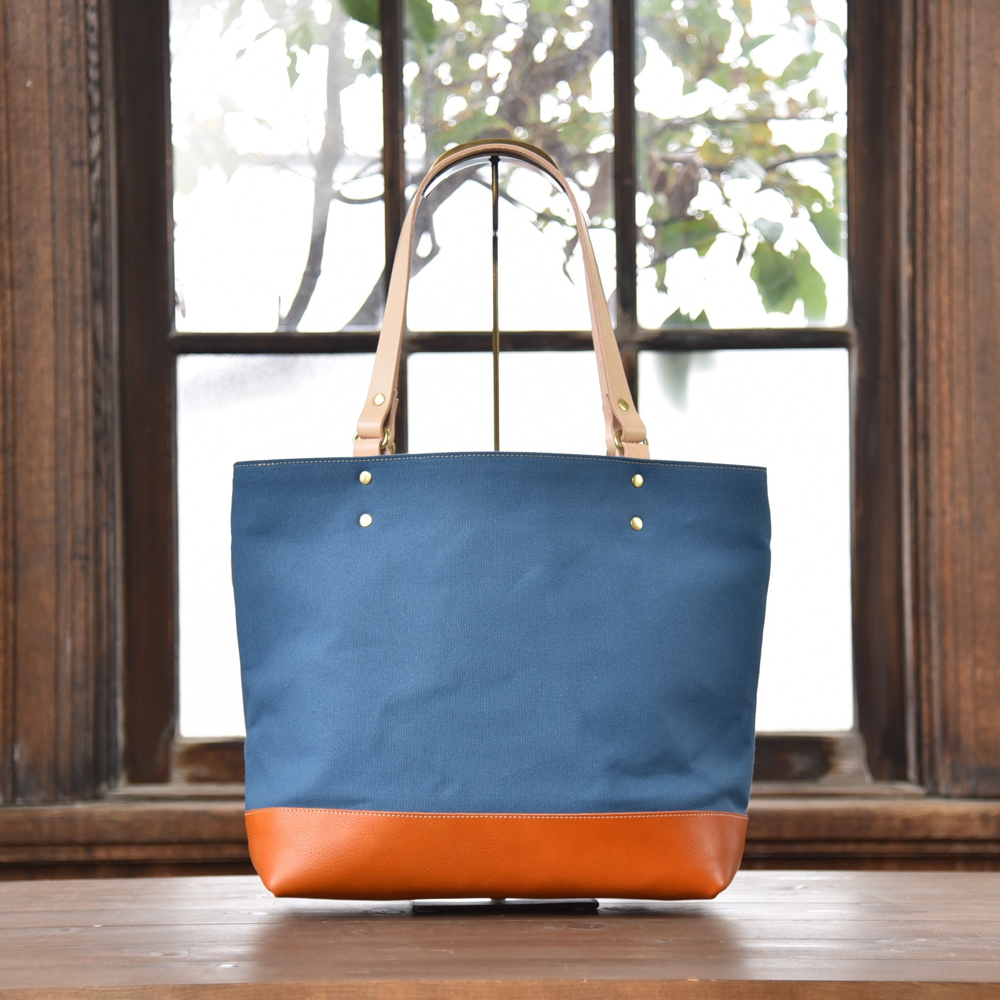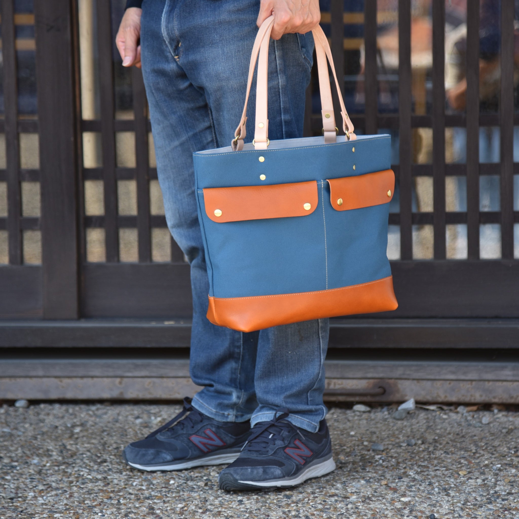 美しい琵琶湖ブルーの帆布とブライトキャメルの革の