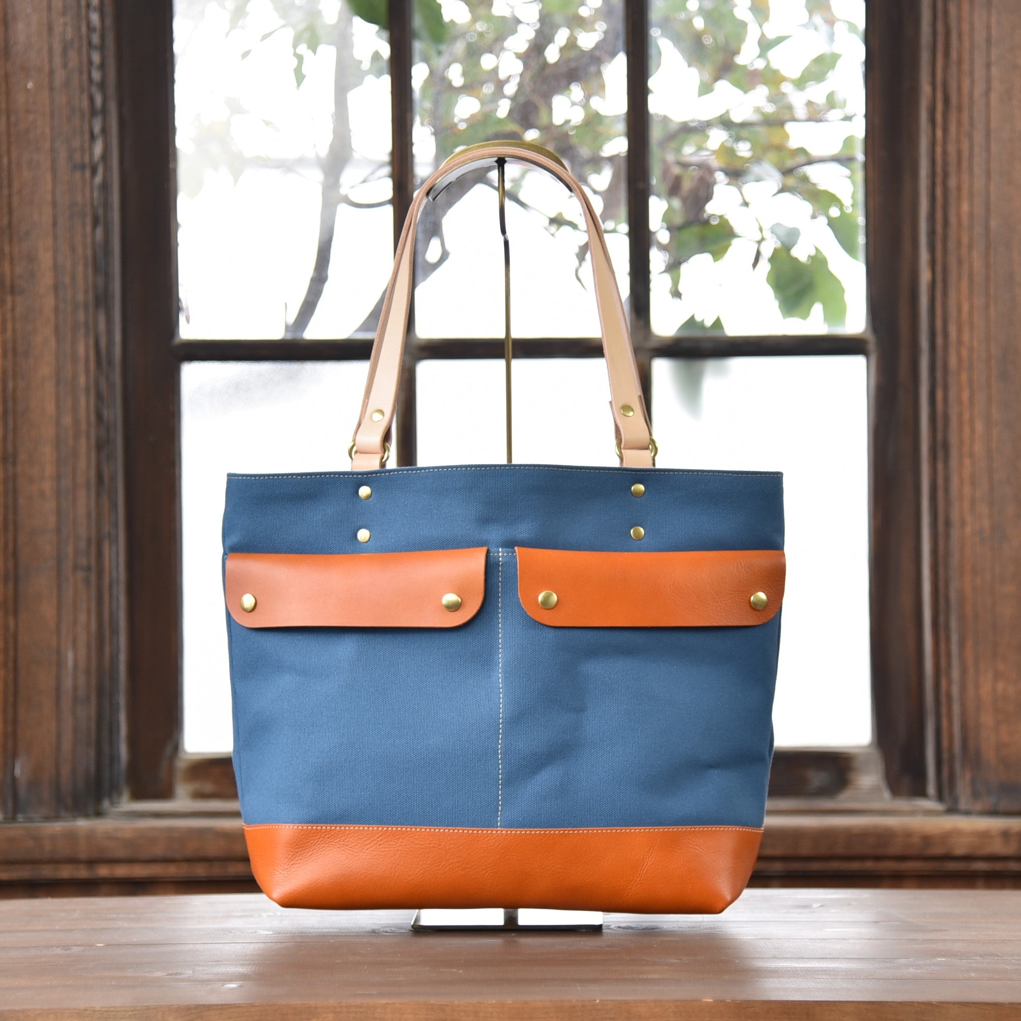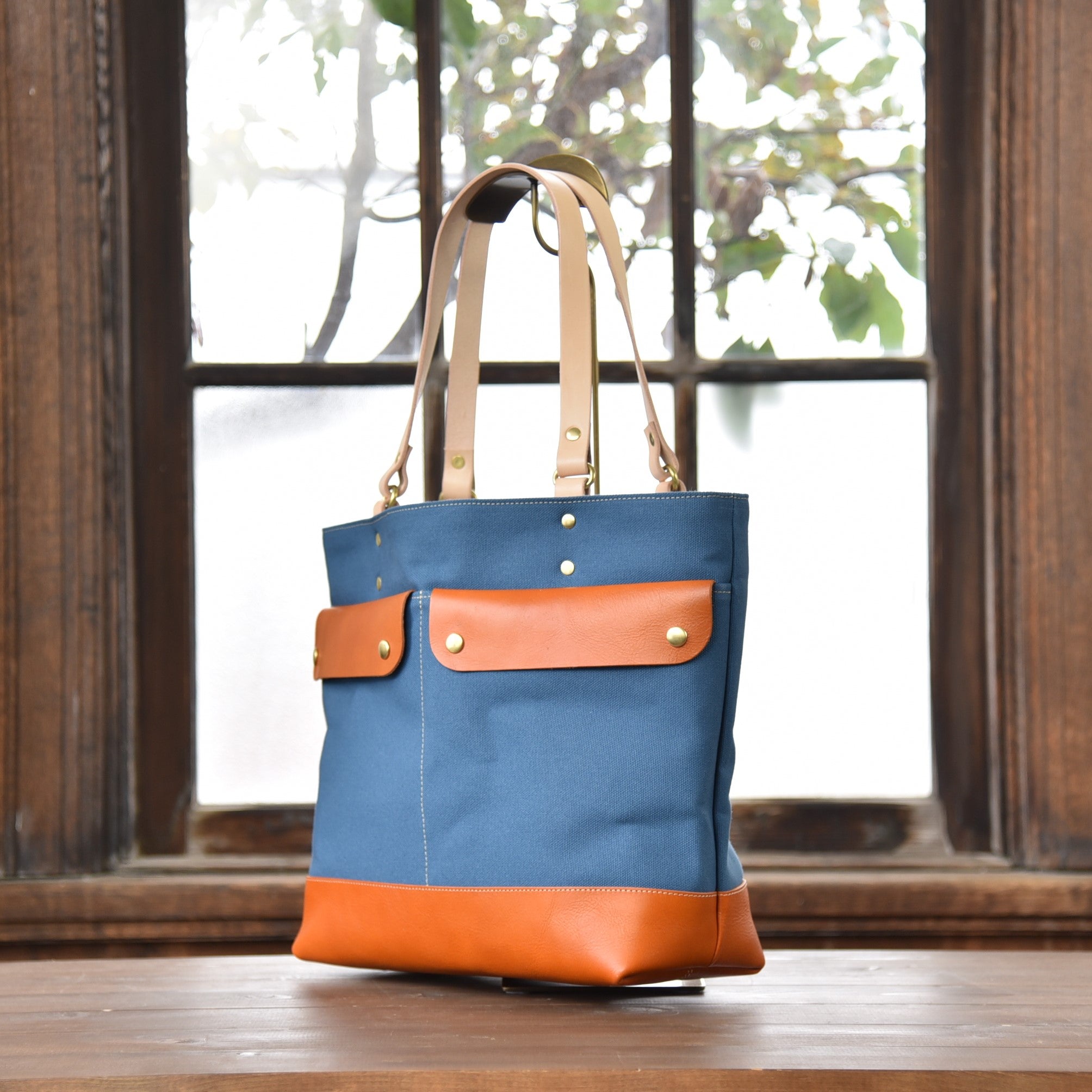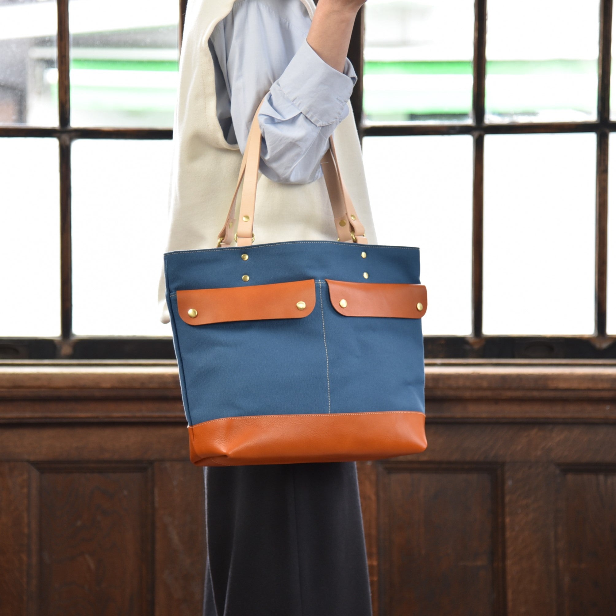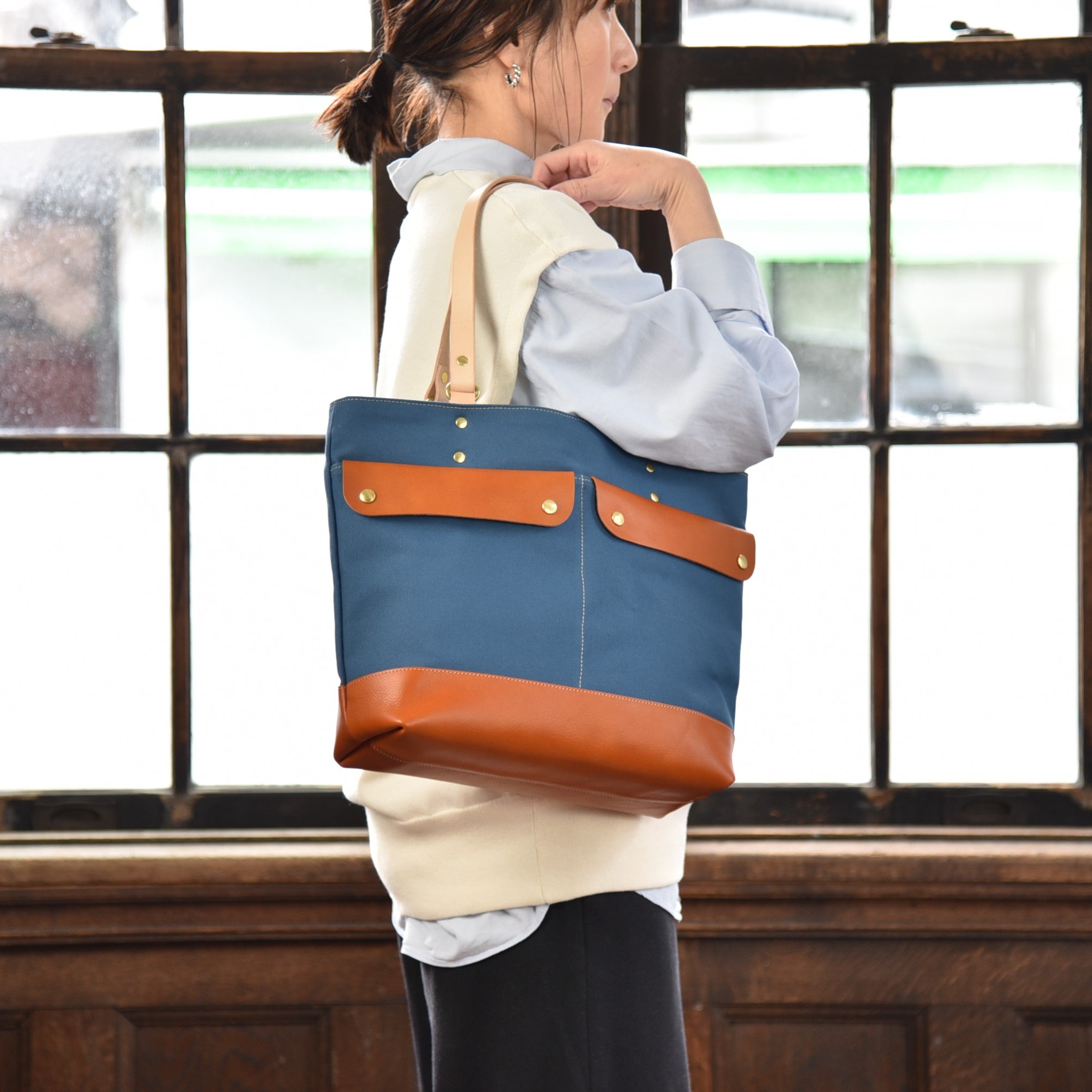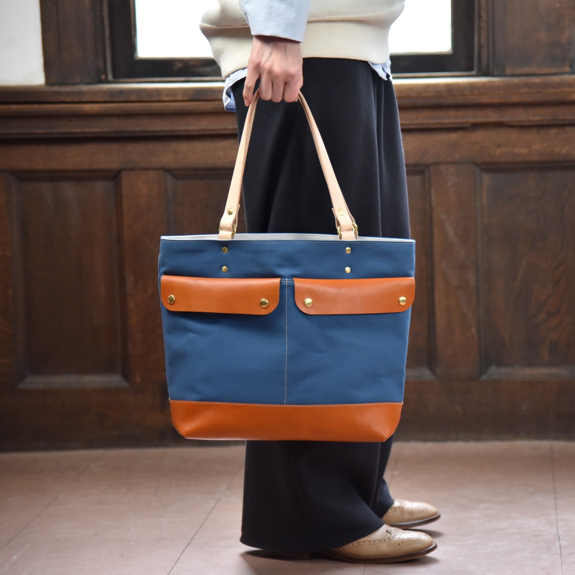 MUDITA HILL|岡喜近江牛レザーと高島帆布で作った 2フラップトート 【びわ湖ブルー×ブライトキャメル】|Cogocoro(コゴコロ)