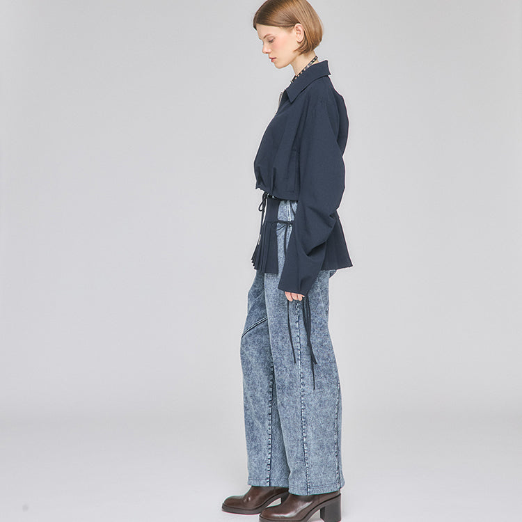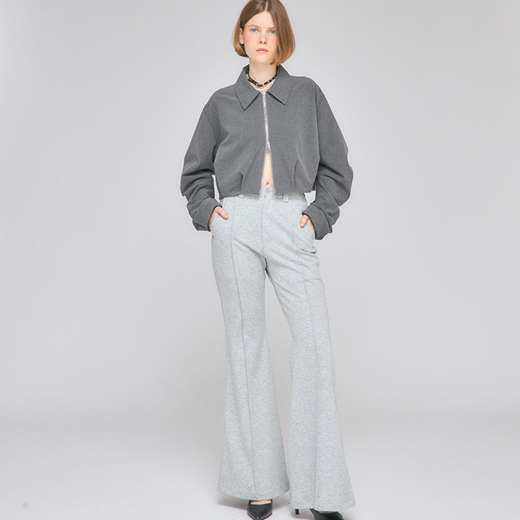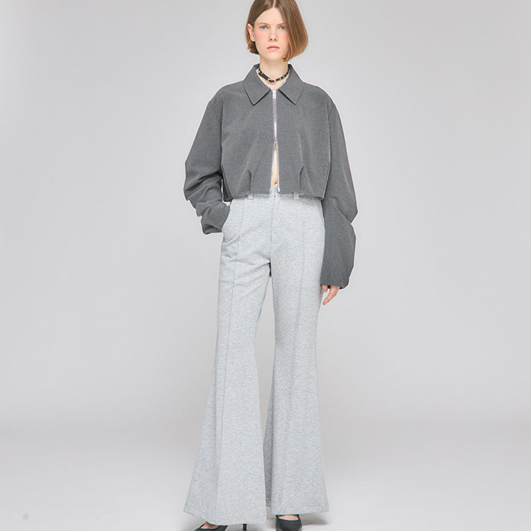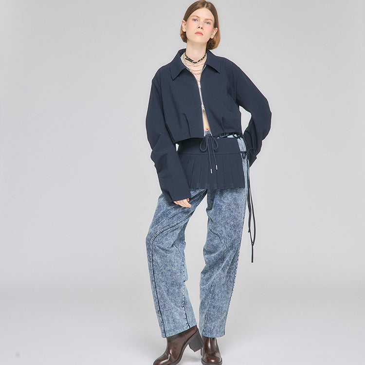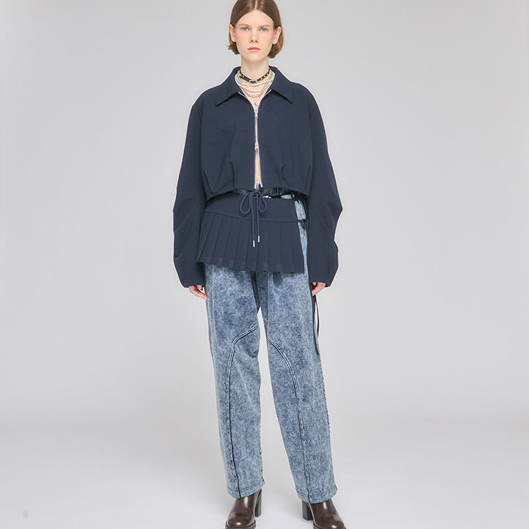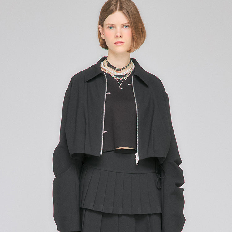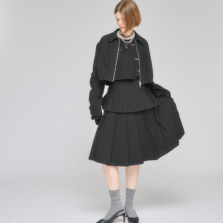 ショート丈のバランスでスタイルアップ効果もあり、ワイドボトムからスカートまで幅広く好相性。