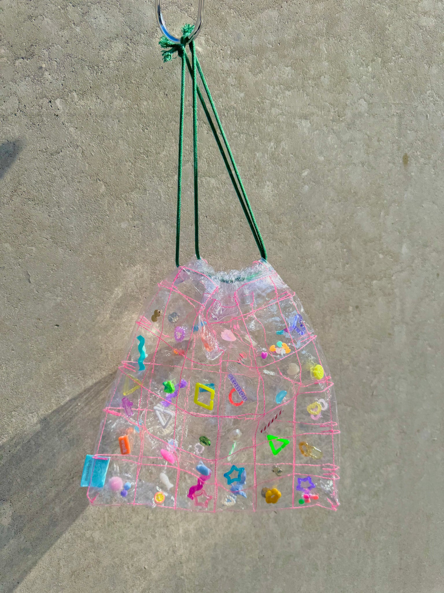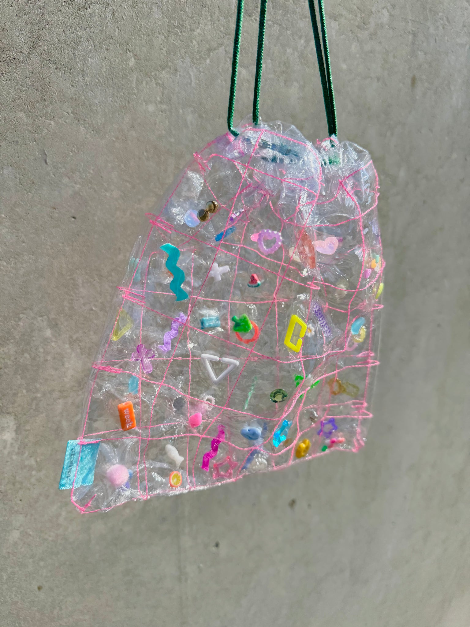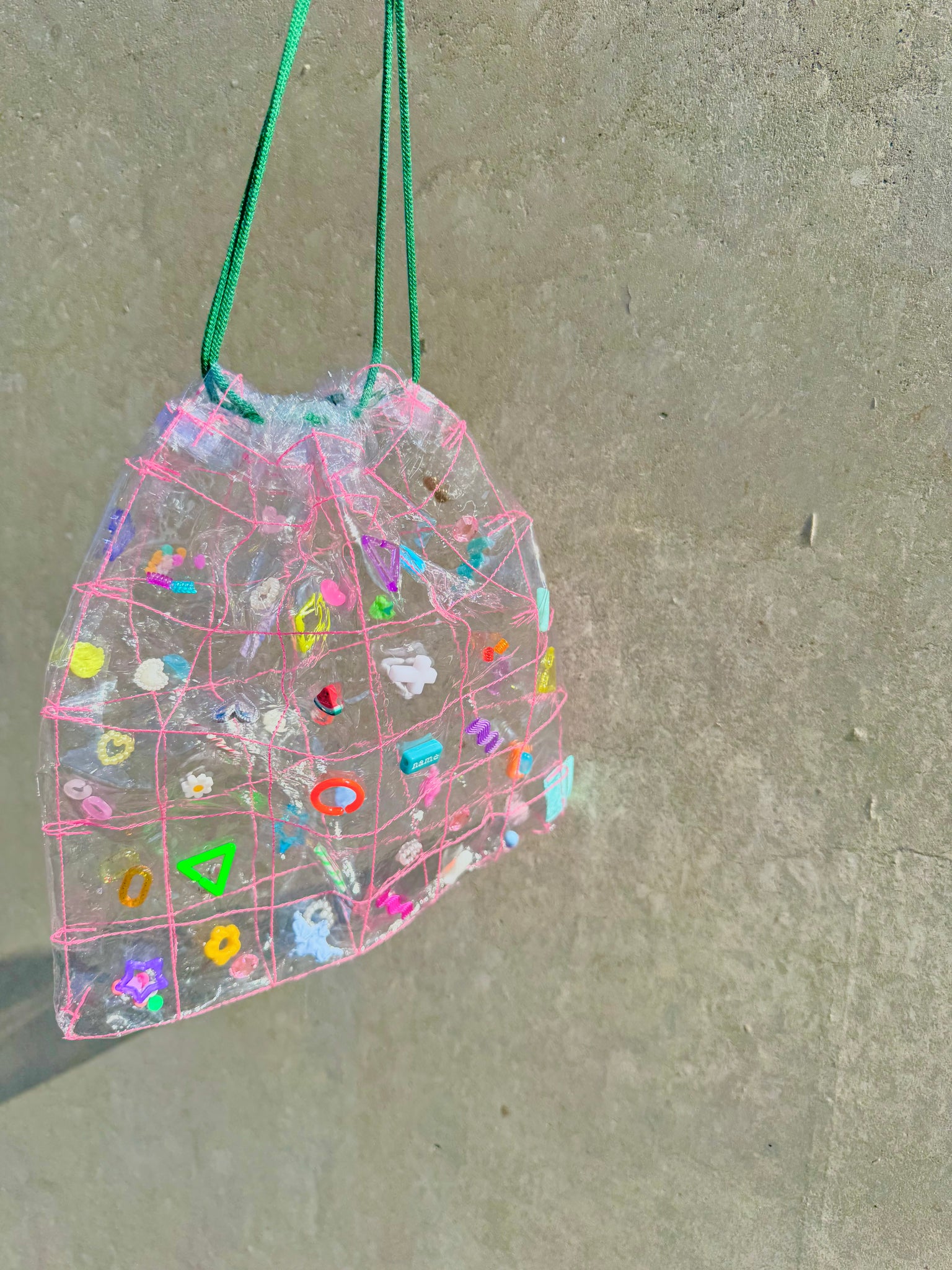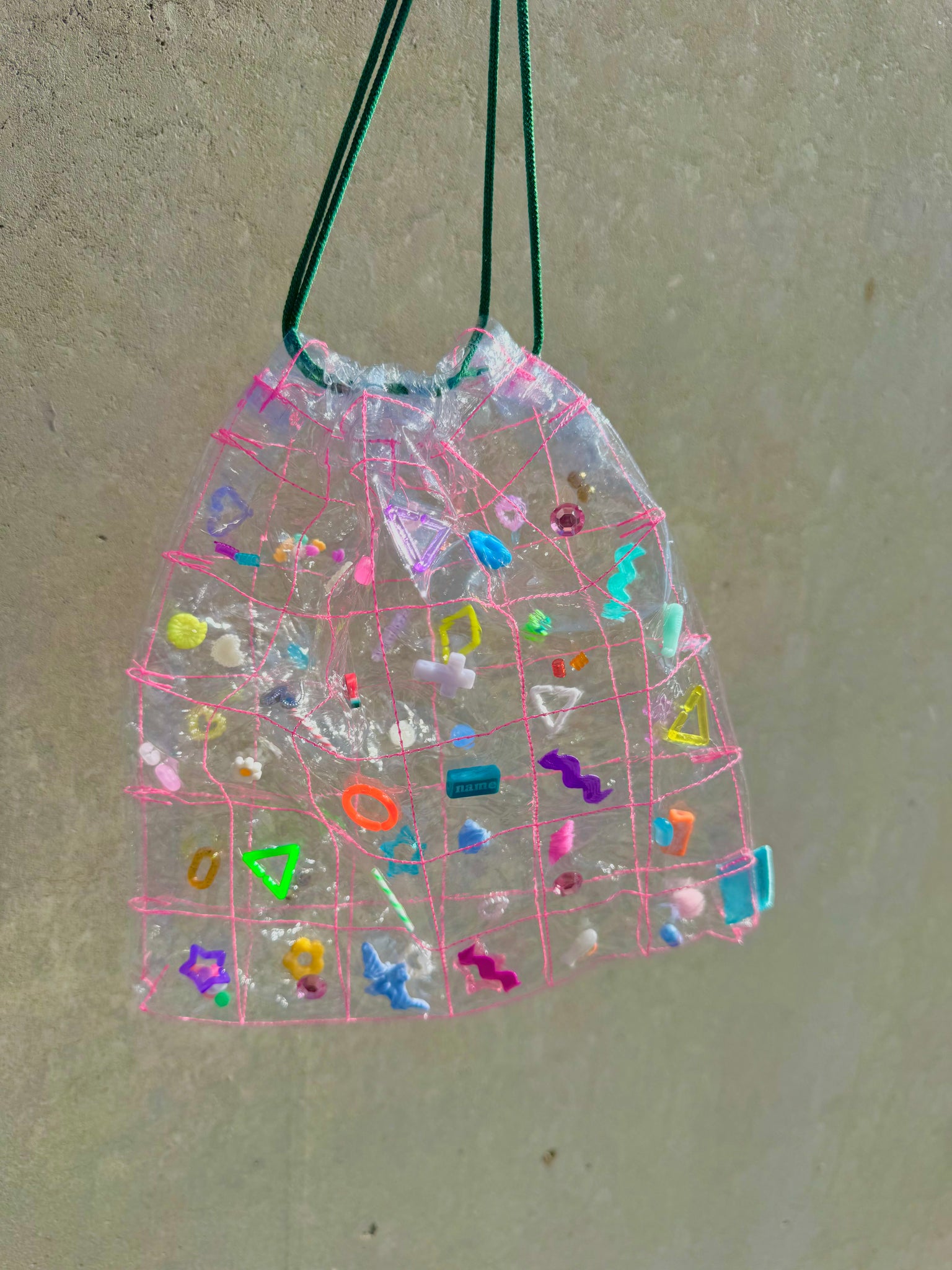 透明の格子状に縫った生地に、パーツを閉じ込めた巾着になります。
