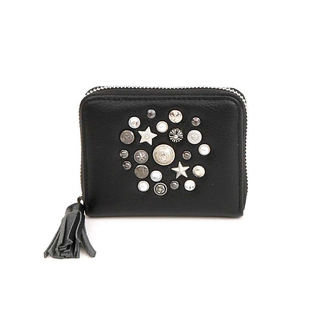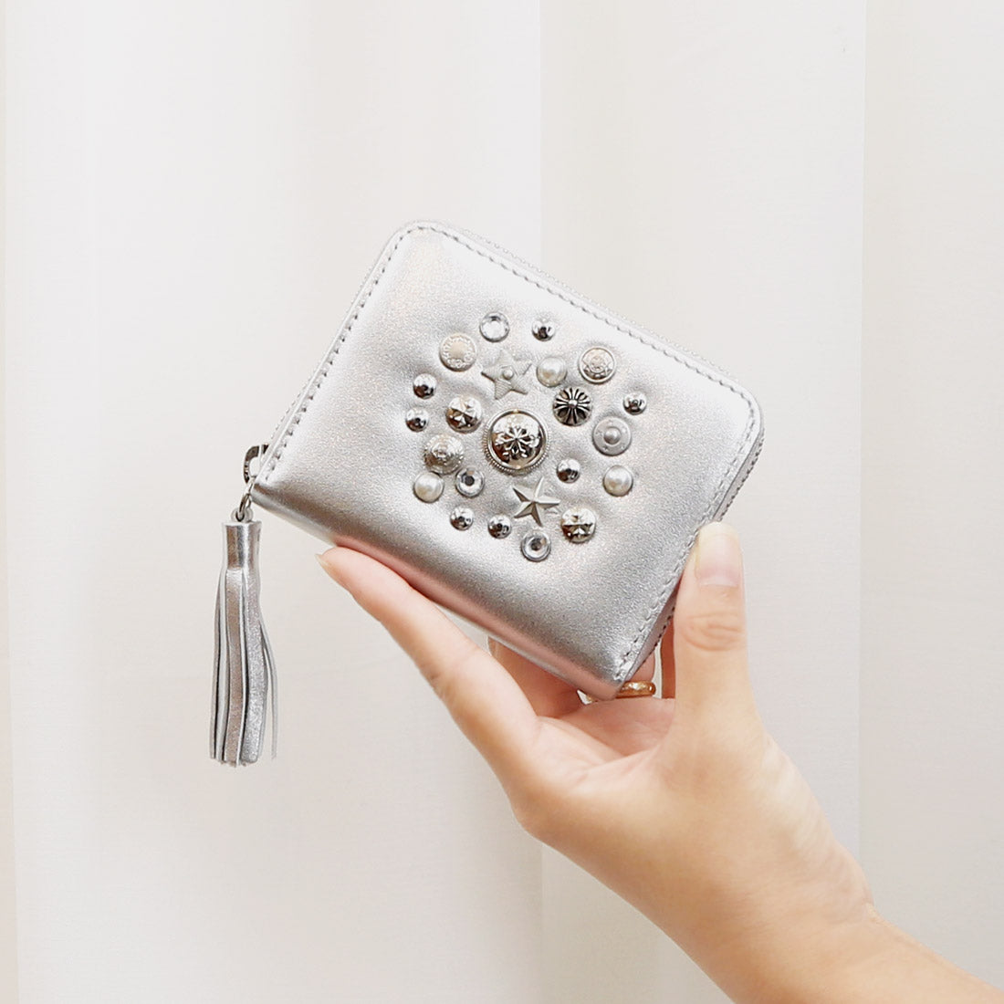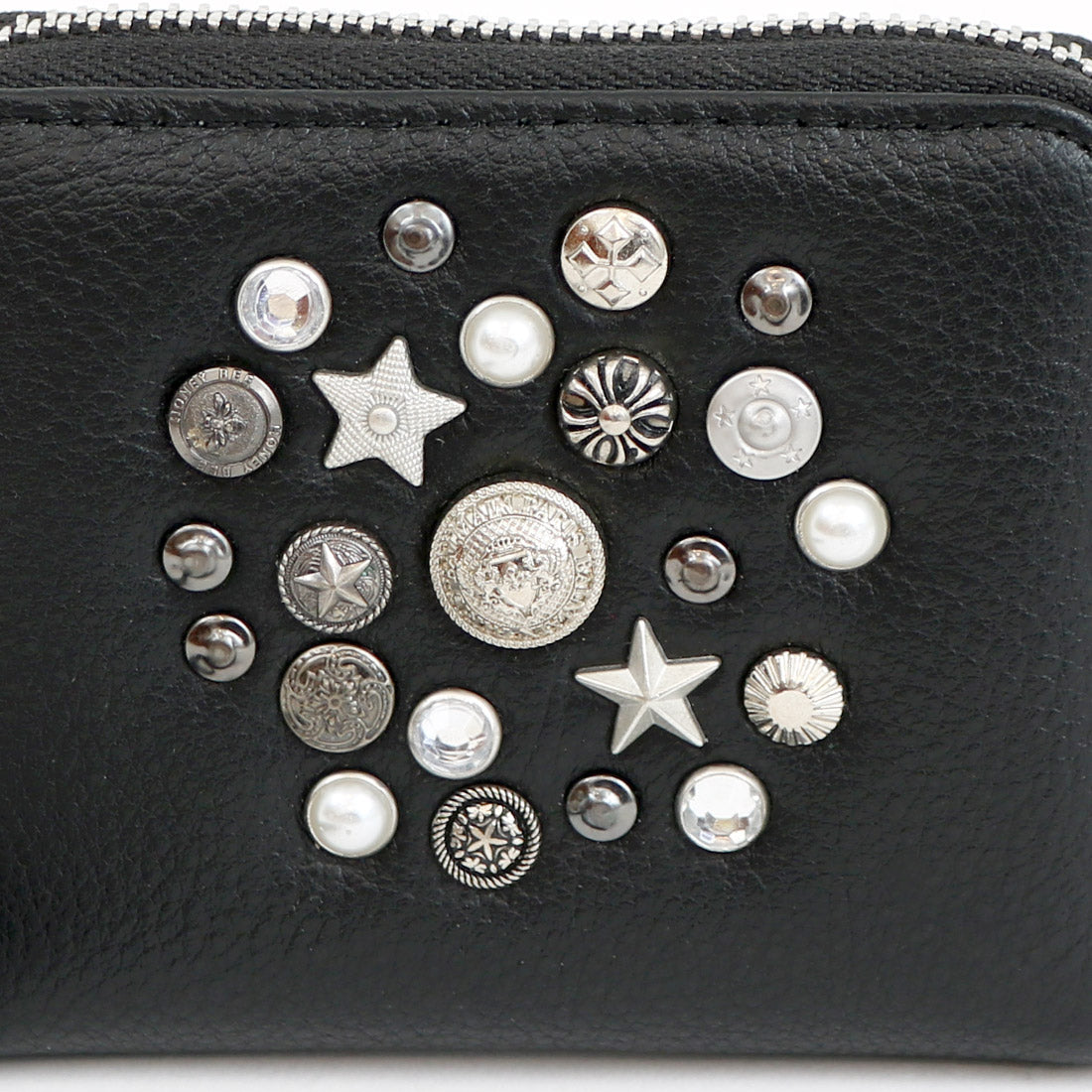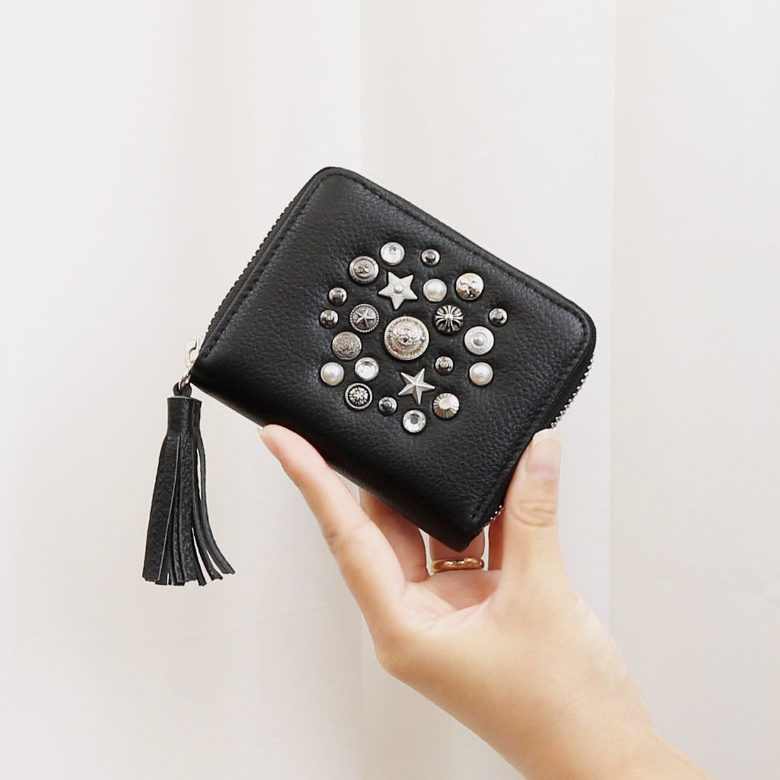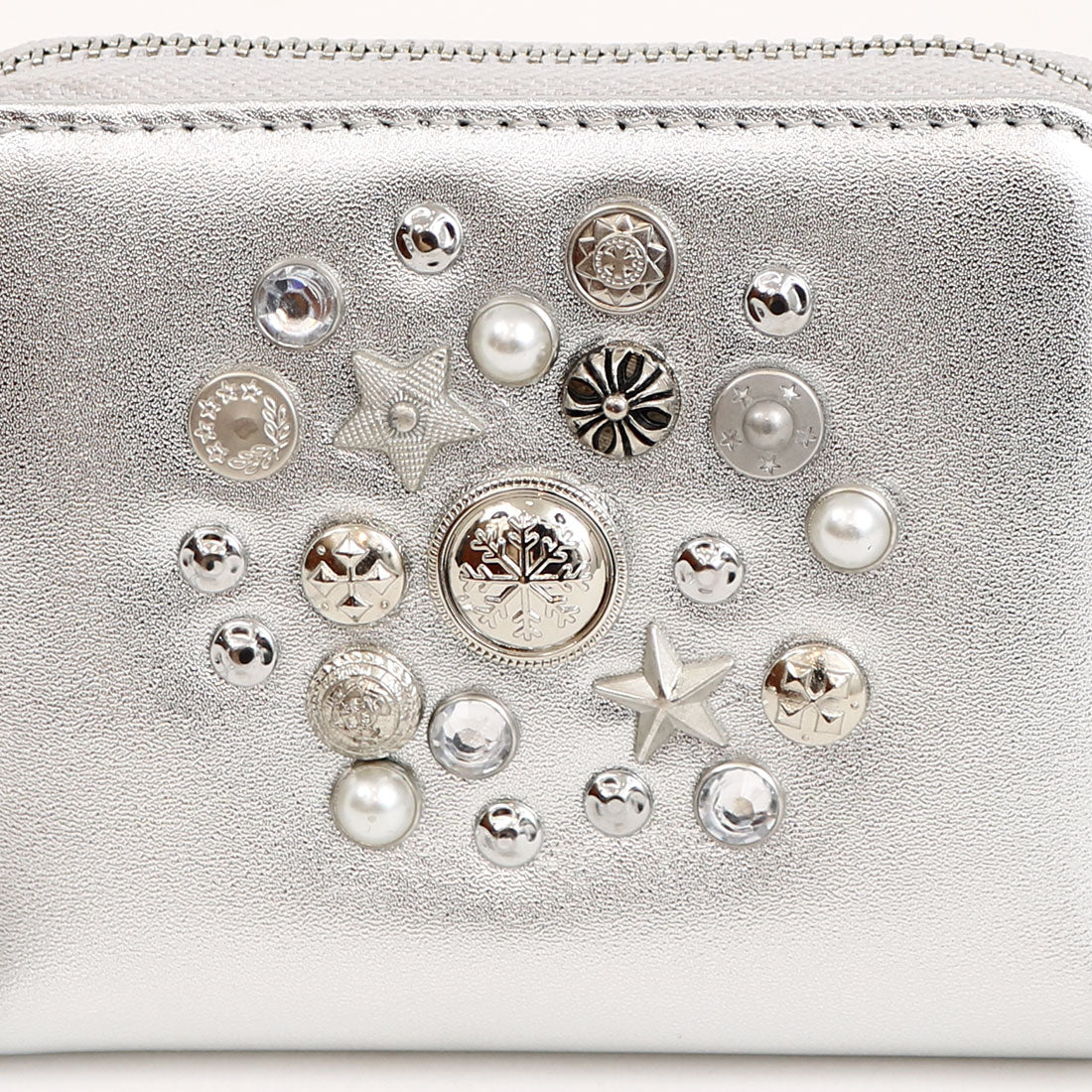 いろいろな形のスタッズやビジュータイプスタッズをちりばめ、ランダムに打ち込んだジャバラカードウォレット