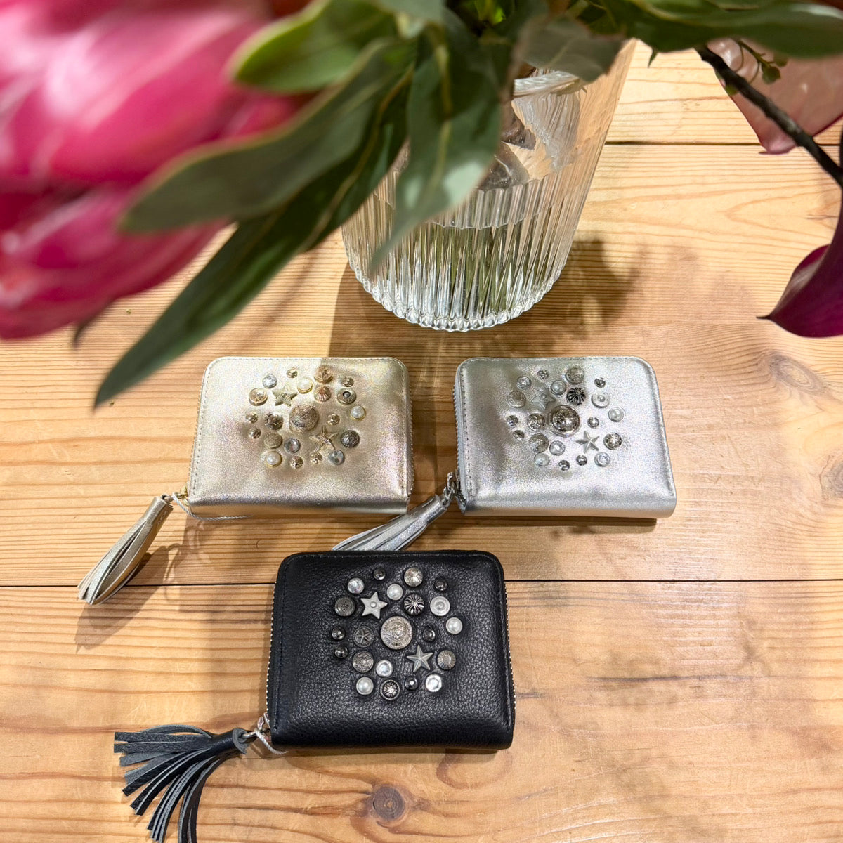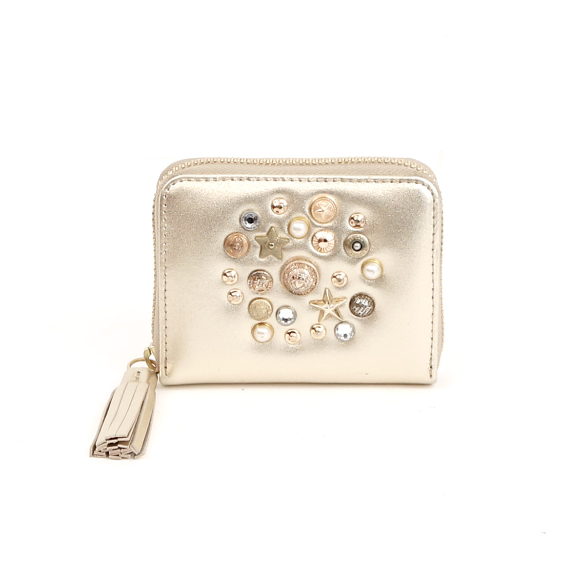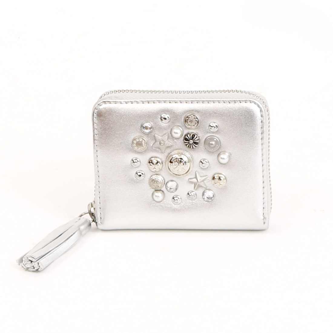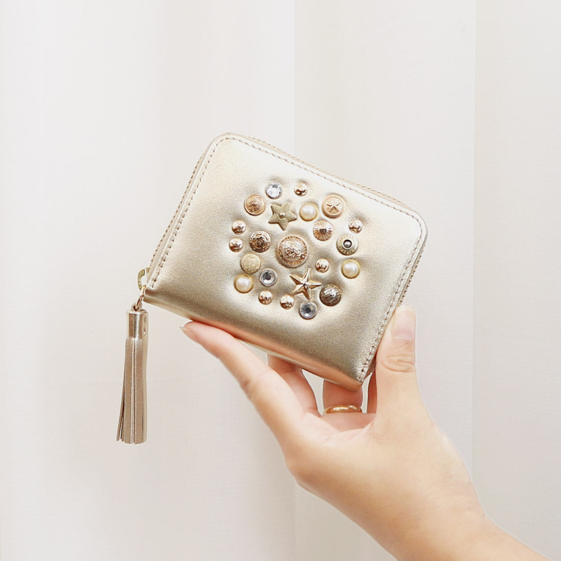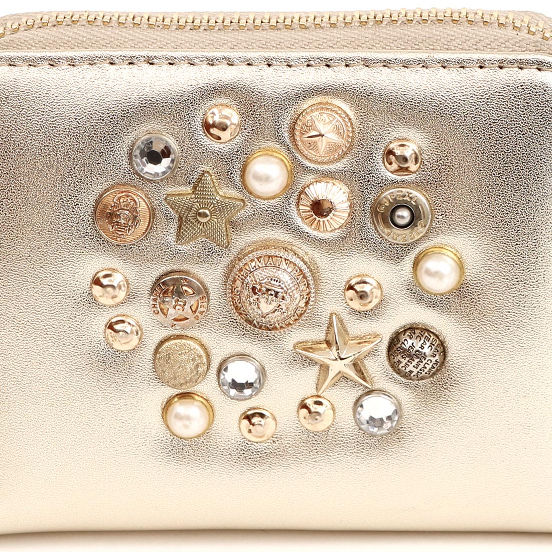 いろいろな形のスタッズやビジュータイプスタッズをちりばめ、ランダムに打ち込んだジャバラカードウォレット