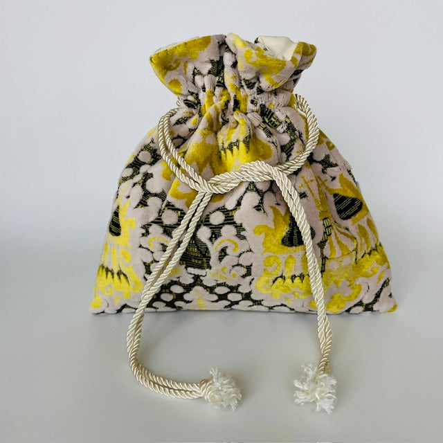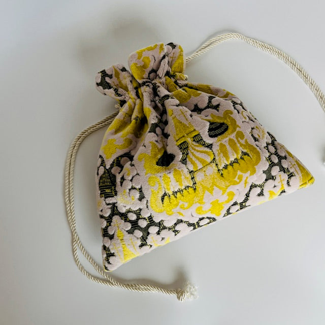 和歌山県で織られている金華山生地で巾着バッグを制作しています。 立体感のある伝統的な織物で、日常使いしていただけるバッグを ハンドメイドで仕立ています。