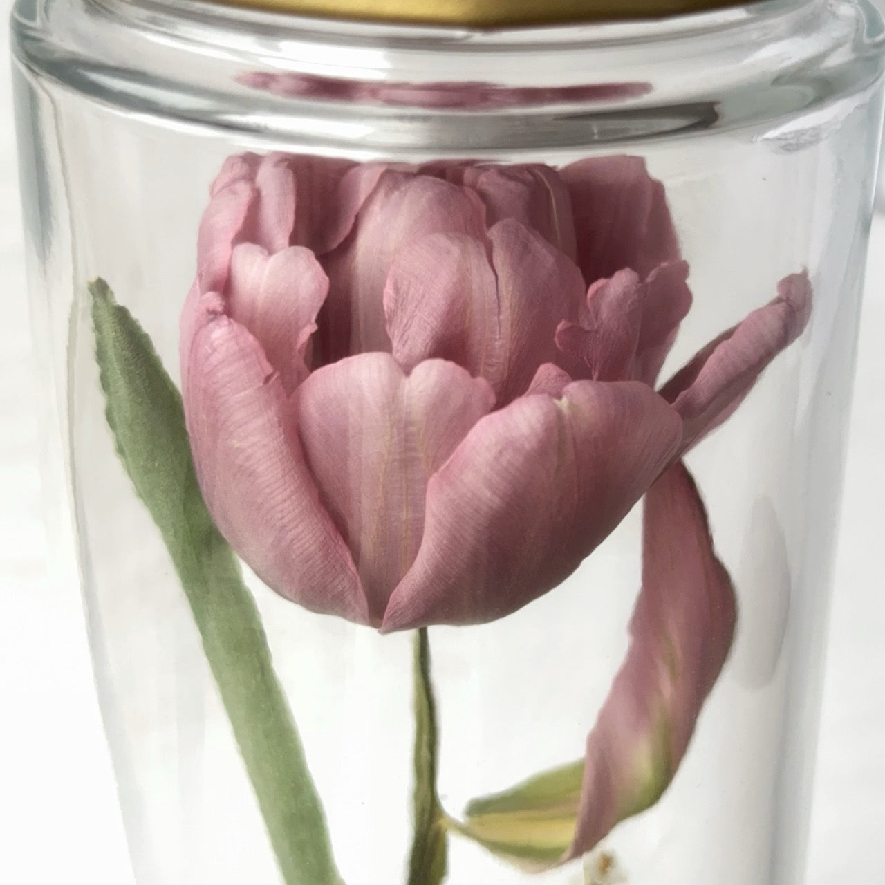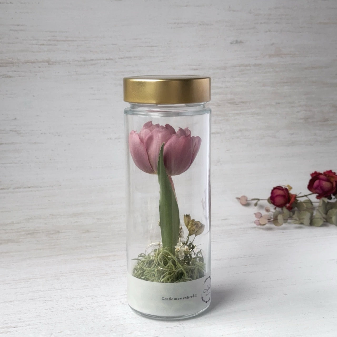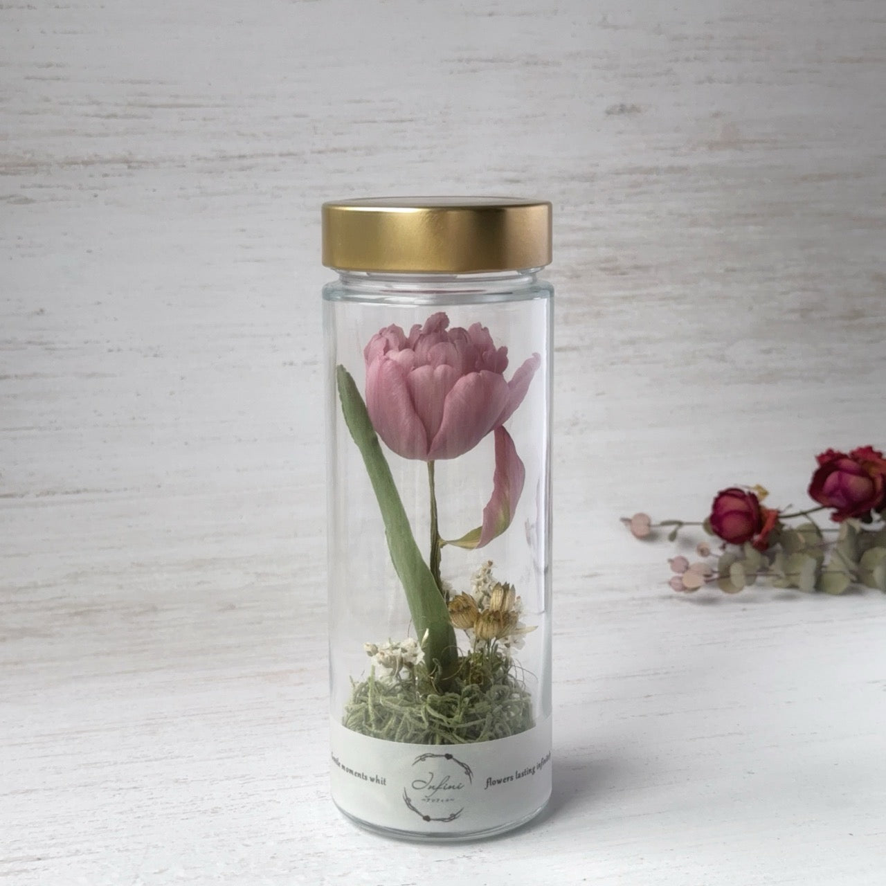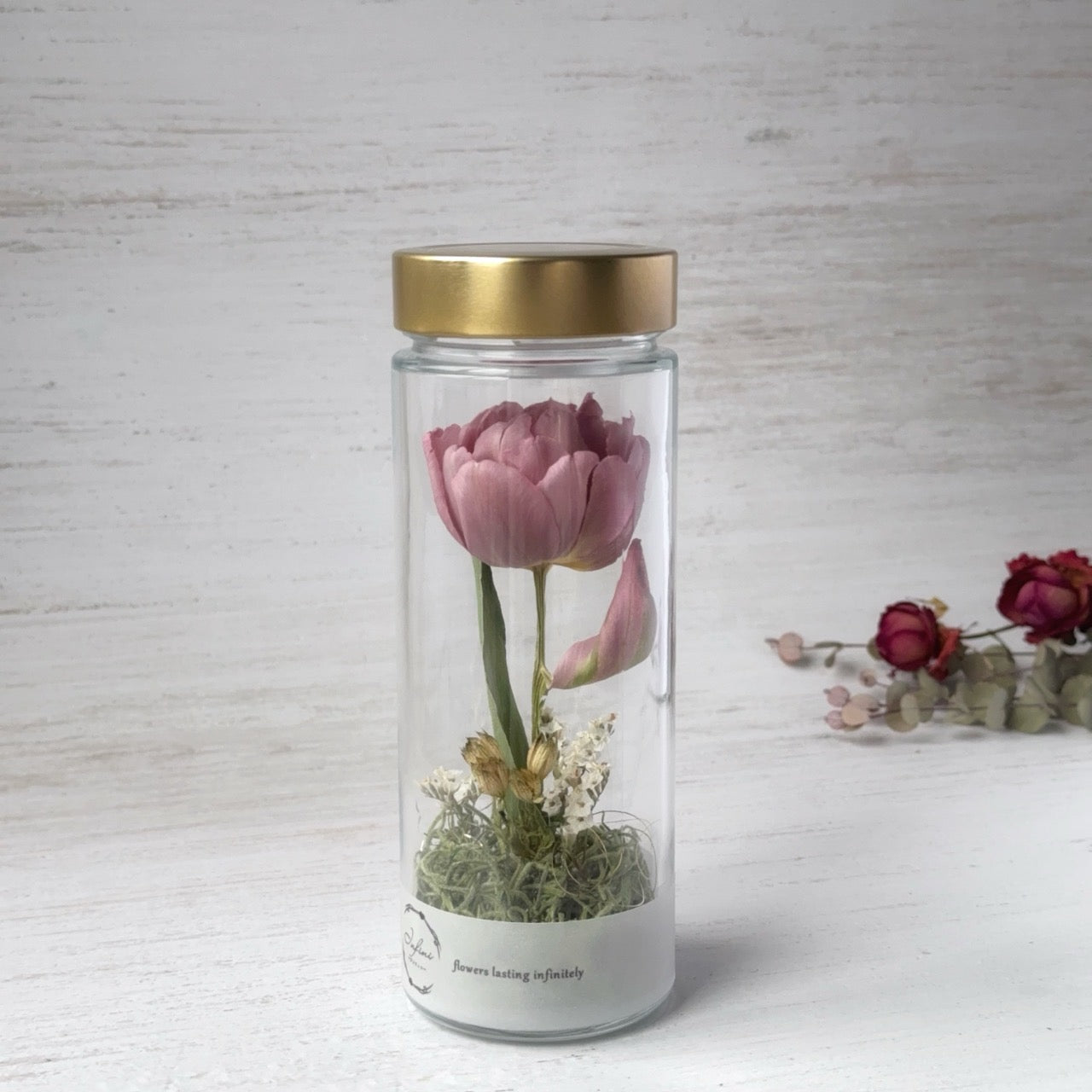 特別な方法で乾燥させたチューリップのドライフラワーをガラス瓶に閉じ込めました。