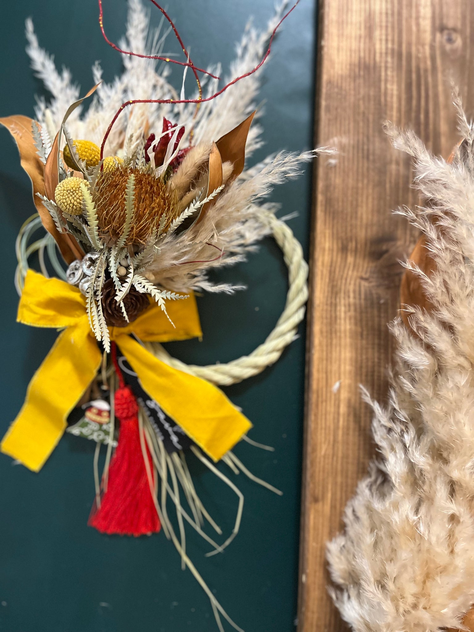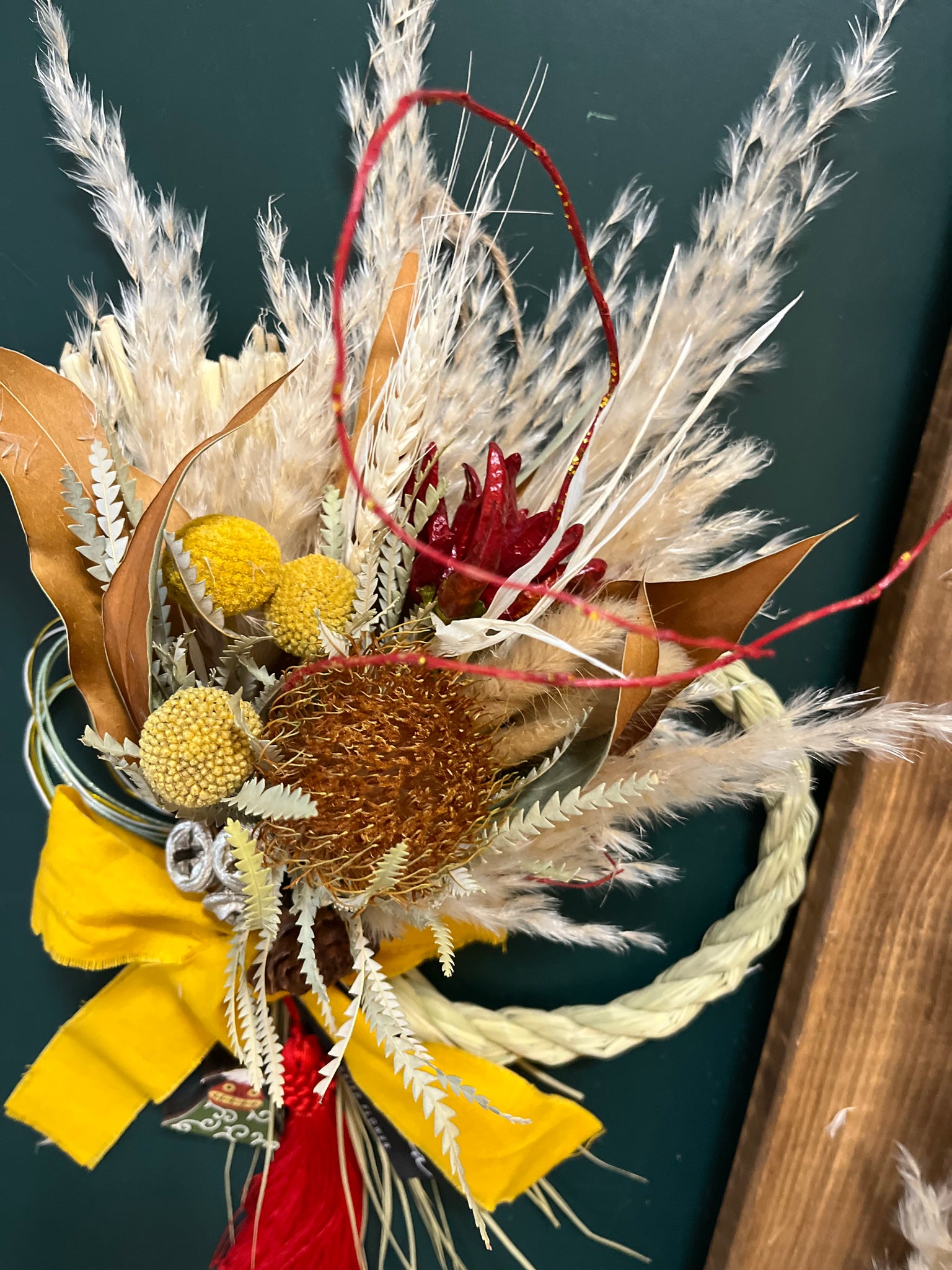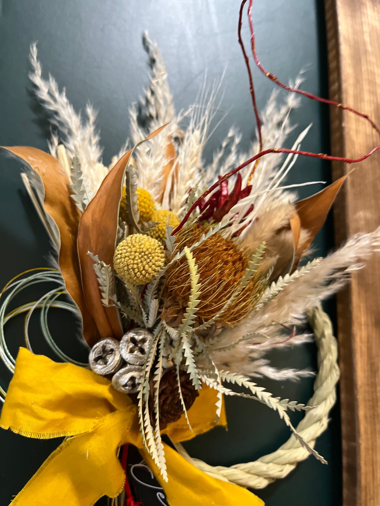 縁起の良いカラーを集めました。ドライアンドラフォルモーサをメインフラワーに、パンパスグラス、グレビレアゴールド、唐辛子、 クラスペディア、ユーカリの実、シダーローズなどを使用致しました。