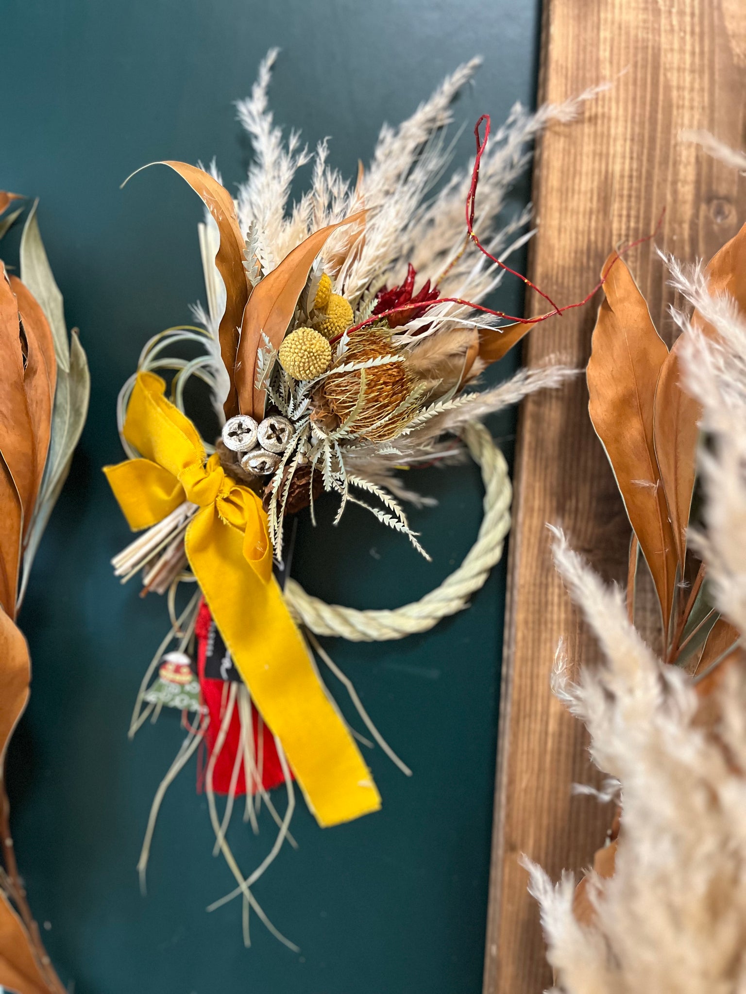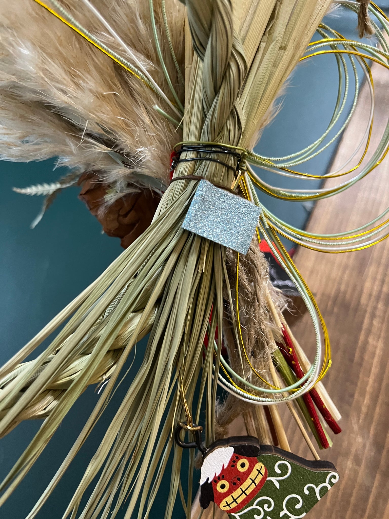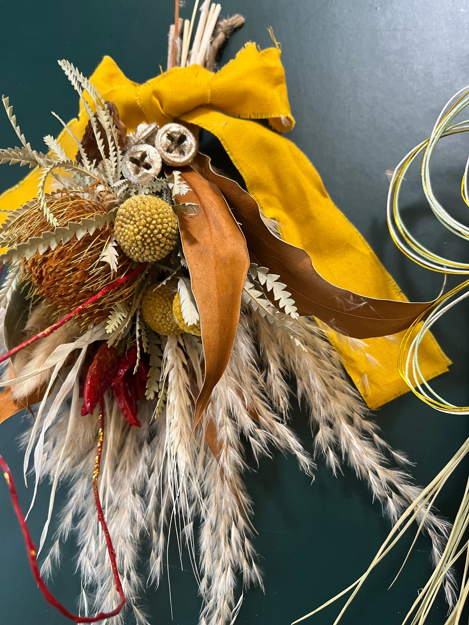 縁起の良いカラーを集めました。ドライアンドラフォルモーサをメインフラワーに、パンパスグラス、グレビレアゴールド、唐辛子、 クラスペディア、ユーカリの実、シダーローズなどを使用致しました。