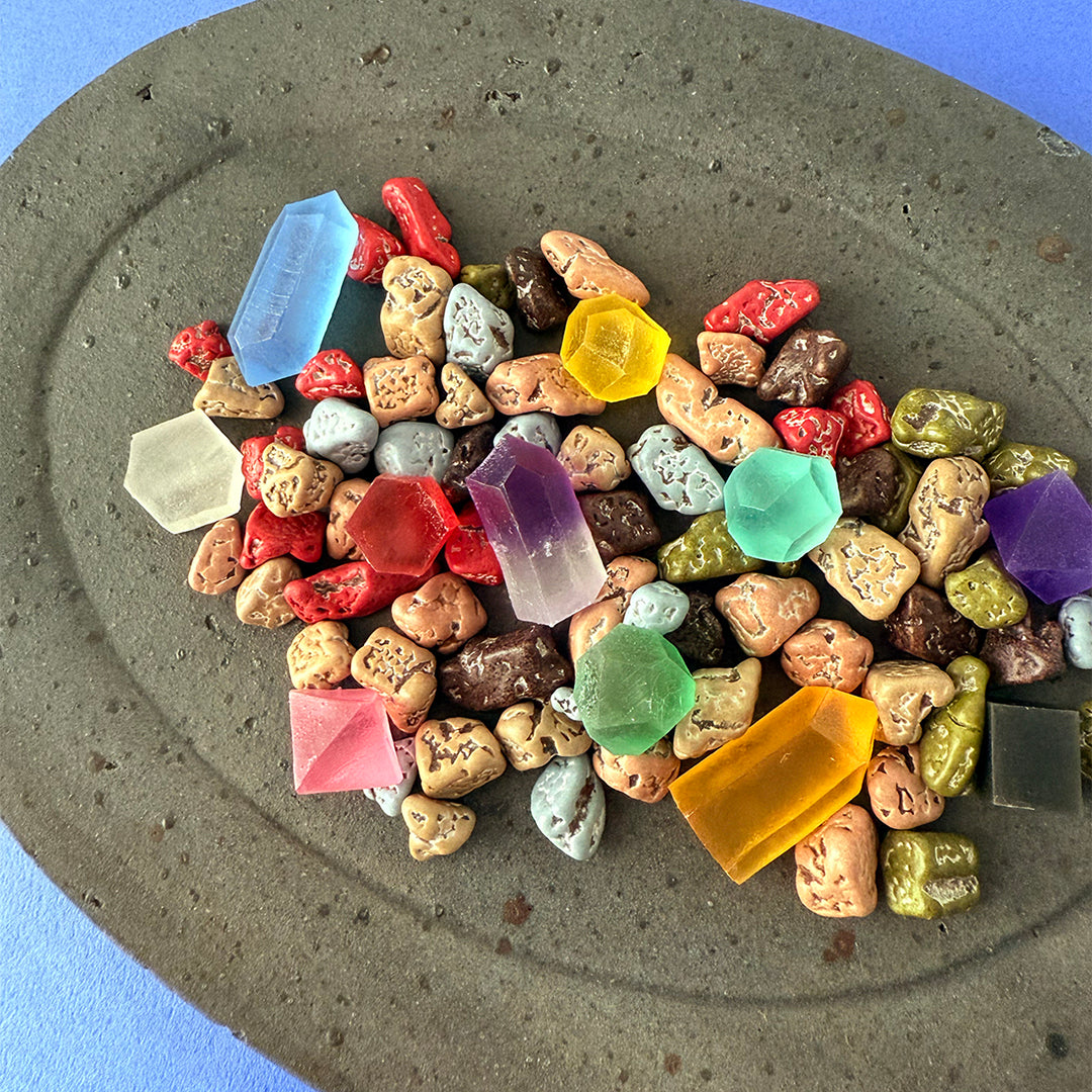 寒天と砂糖を煮詰め冷やし固めたものを切り出し、パーツ同士をくっつけて乾燥させることで、複雑な鉱物の形を再現したこうぶつヲカシ(琥珀糖)。ひと口かじると外側はしゃりっとなかはしっとり。