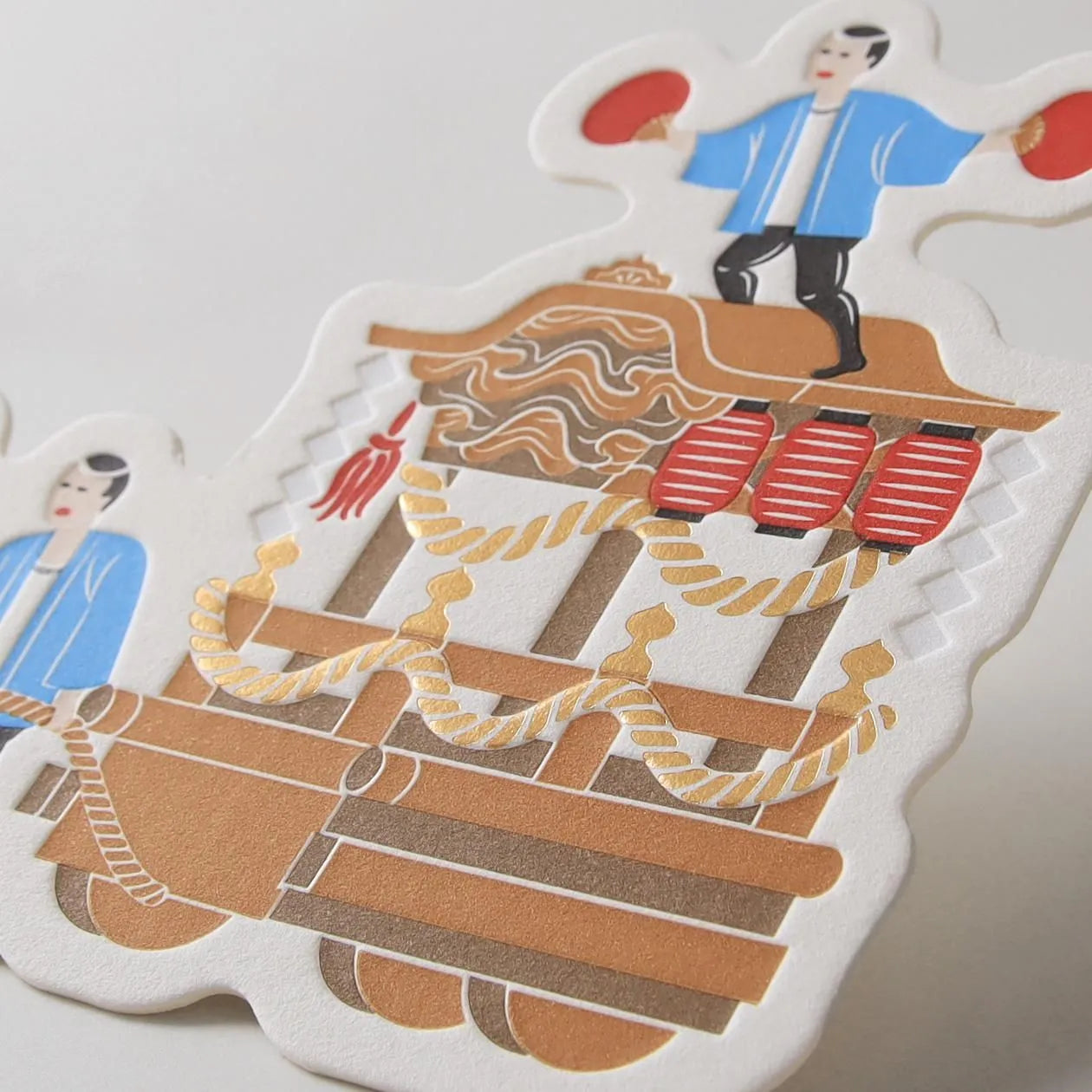活版印刷の多色刷りにより、繊細で豊かな表現を実現。光沢のある箔押しがアクセントとなり、ダイカット加工でモチーフの形そのものの魅力を際立たせています。