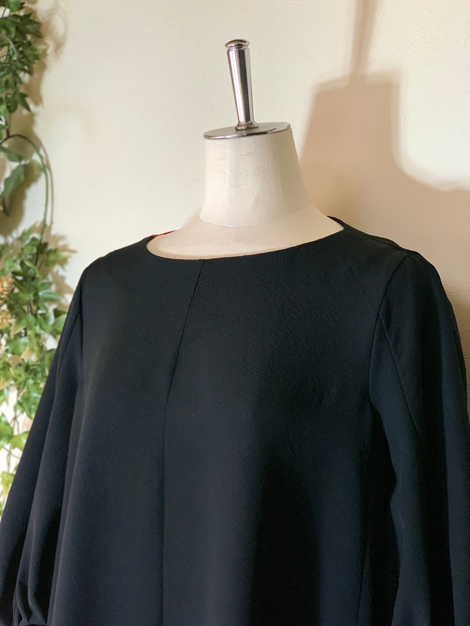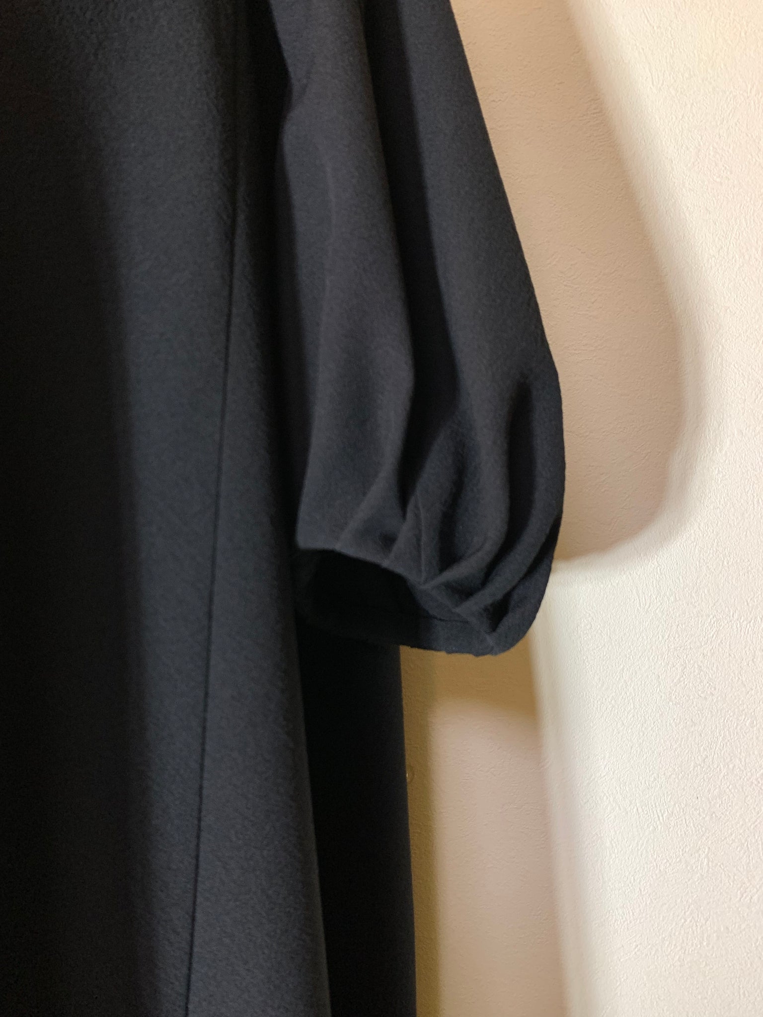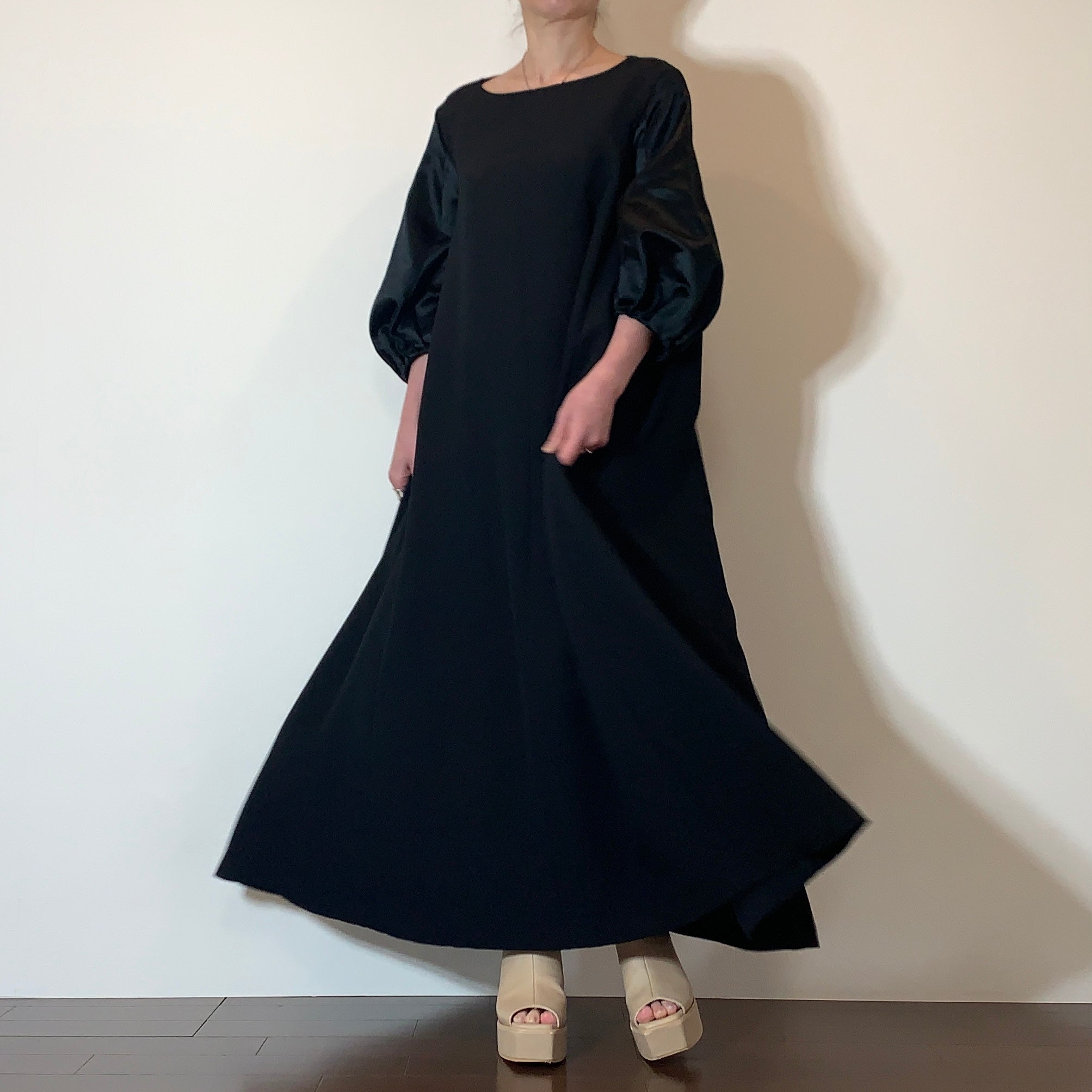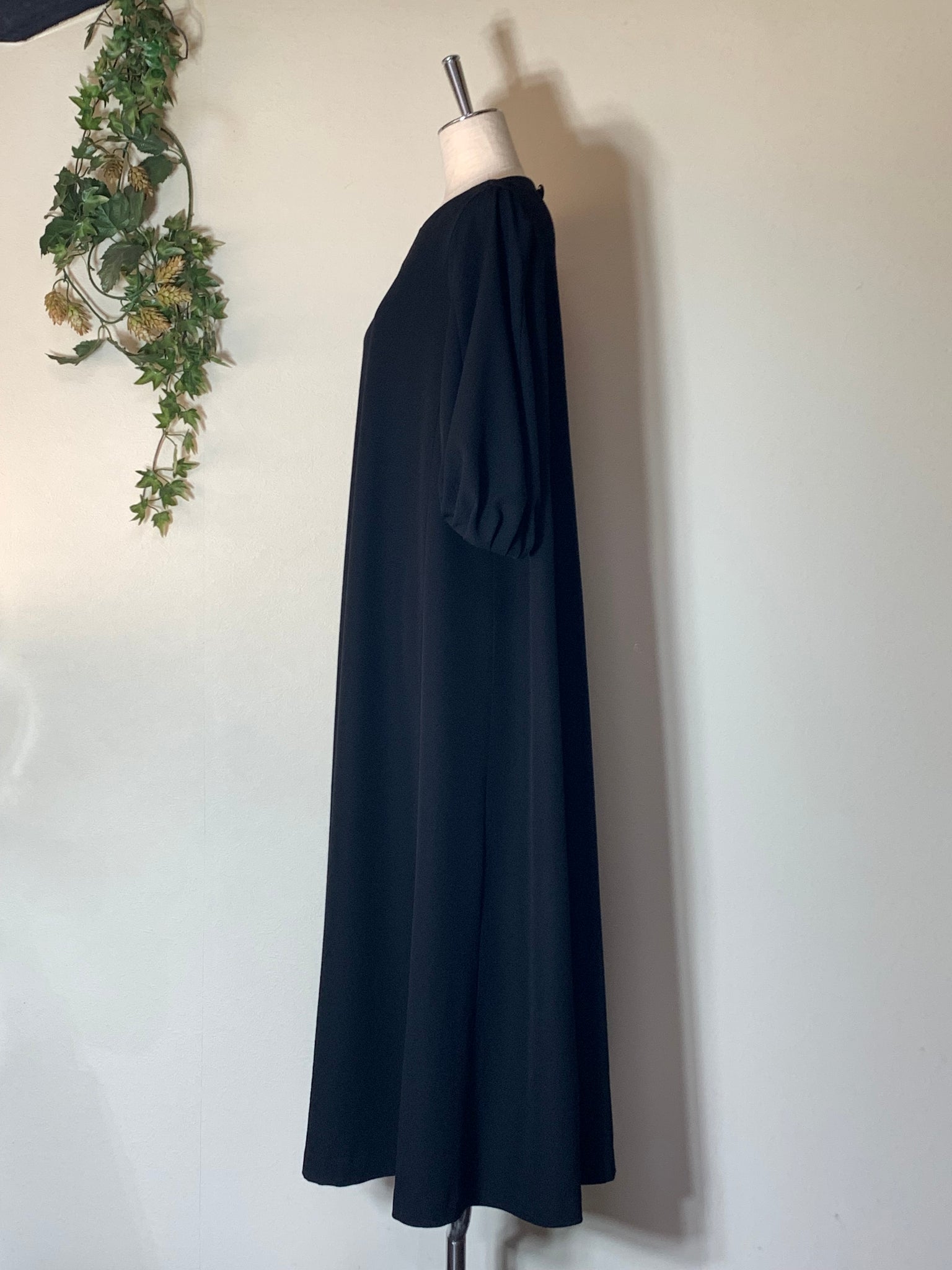 黒染縮緬の着物地反物作ったバルーン袖のフレアワンピースです。
