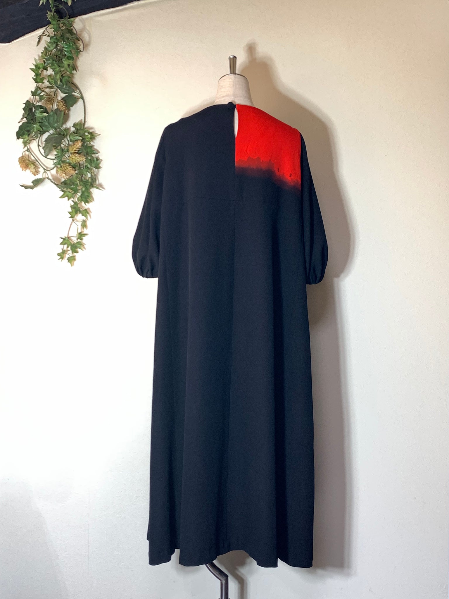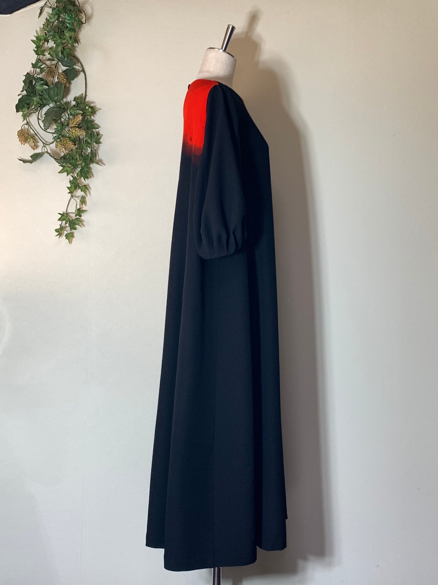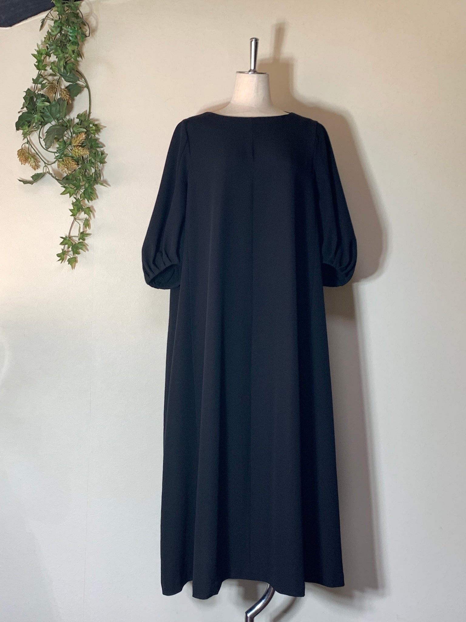 黒染縮緬の着物地反物作ったバルーン袖のフレアワンピースです。