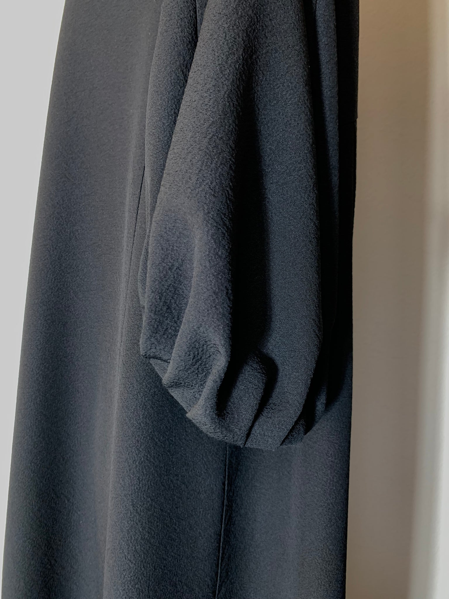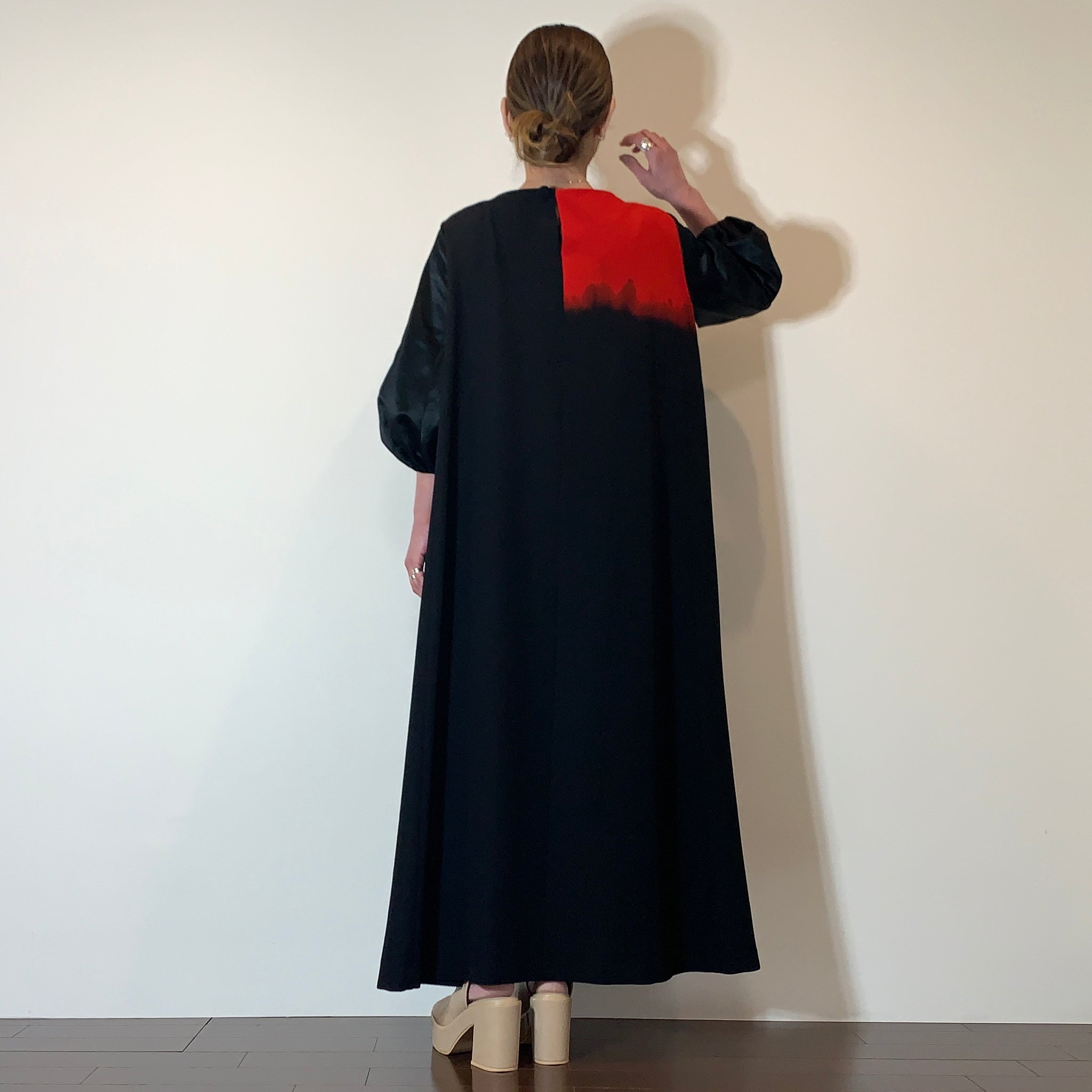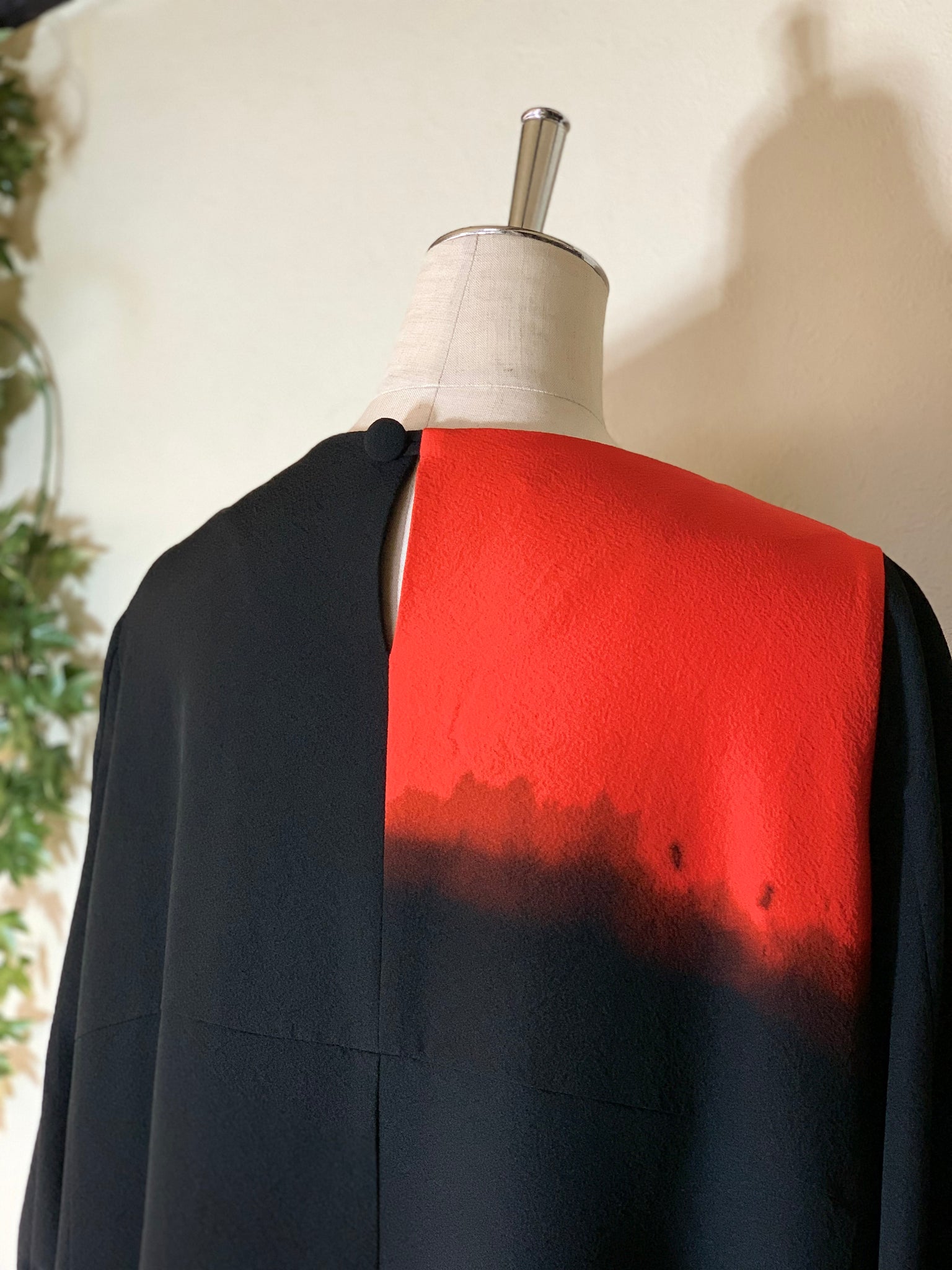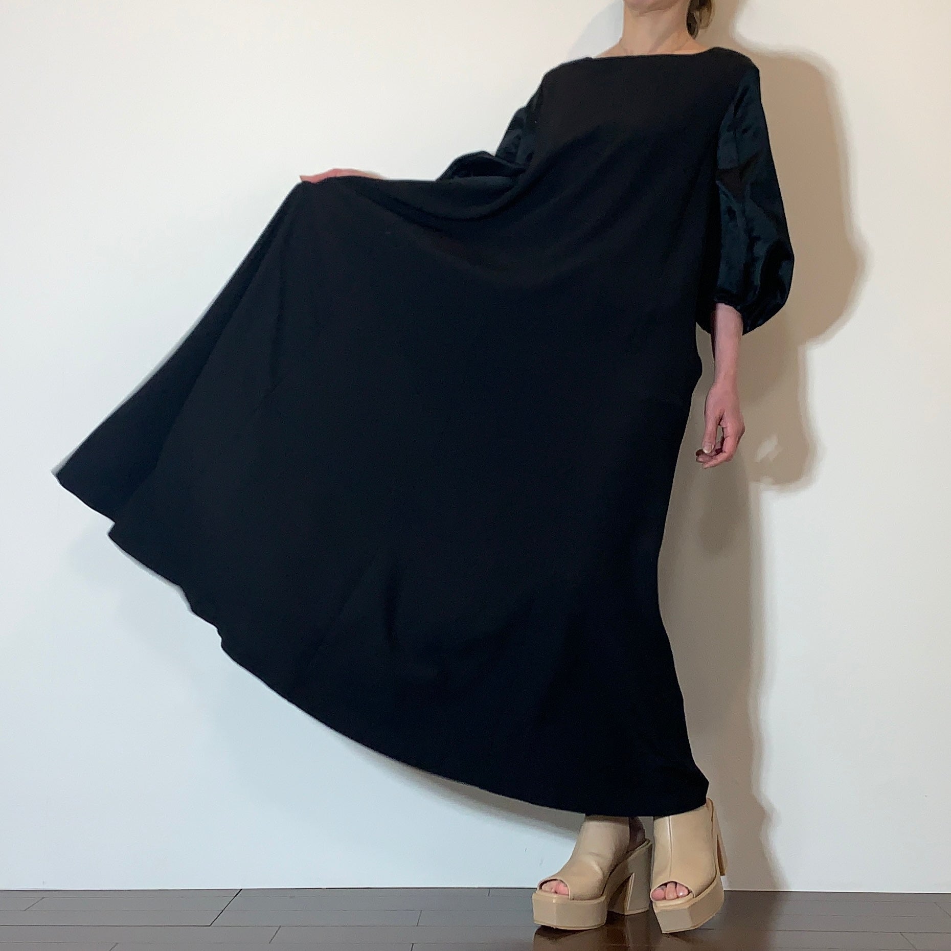 黒染縮緬の着物地反物作ったバルーン袖のフレアワンピースです。