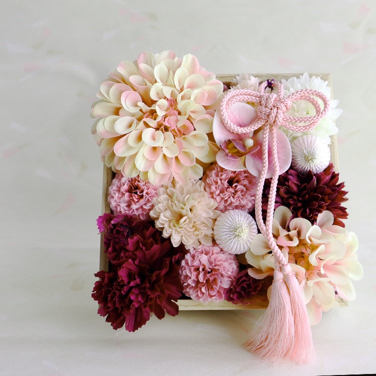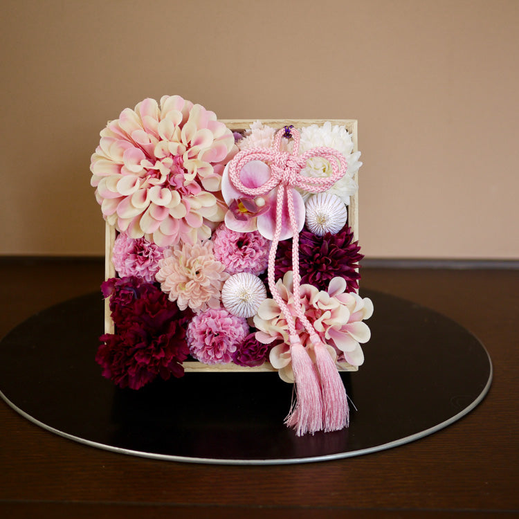 格調高い二重叶結びと艶やかな花々が織りなす、気品溢れる和のアレンジメント。深い色味のダリアから優しいピンクのグラデーションが広がり、絢爛な美しさと共に、日本の伝統美を表現しています。特別な空間を演出する、珠玉の一品です。【デザイン】*縁結びや願掛けの意味を持つ「叶結び」をアレンジのアクセントに*二重叶結びは取り外し可能です*組紐は、アレンジメントの装飾としてはもちろん、ストラップなど、様々な用途でお使いいただけます*アーティフィシャルフラワーアレンジメント*スタンド付き木製フレーム【サイズ】約縦20cm 横20cm 高さ8cm【花材】アーティフィシャルフラワー(胡蝶蘭、ダリア、ピンポンマム、スプレーマム、カーネーション)